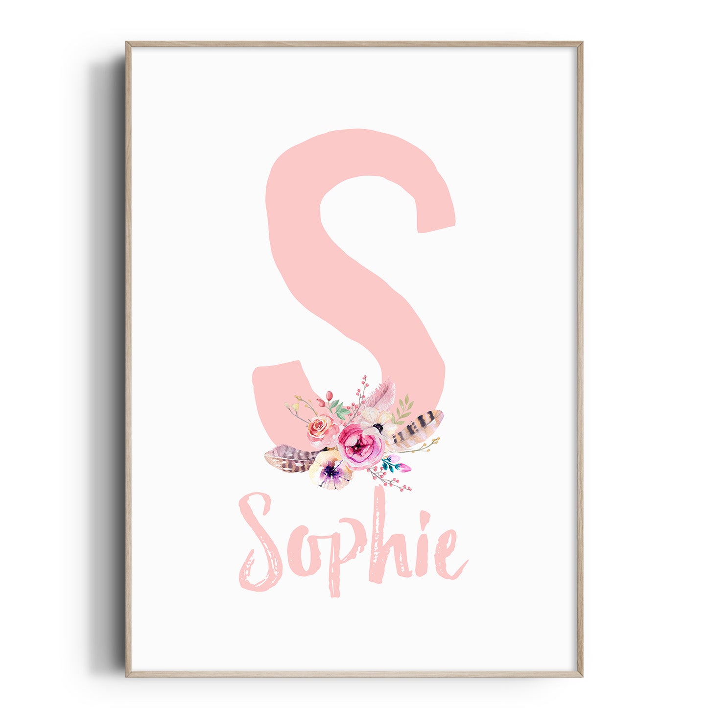 Unit price perA customised wall art print, personalised with your child's name, featuring a watercolour feather and floral bouquet.