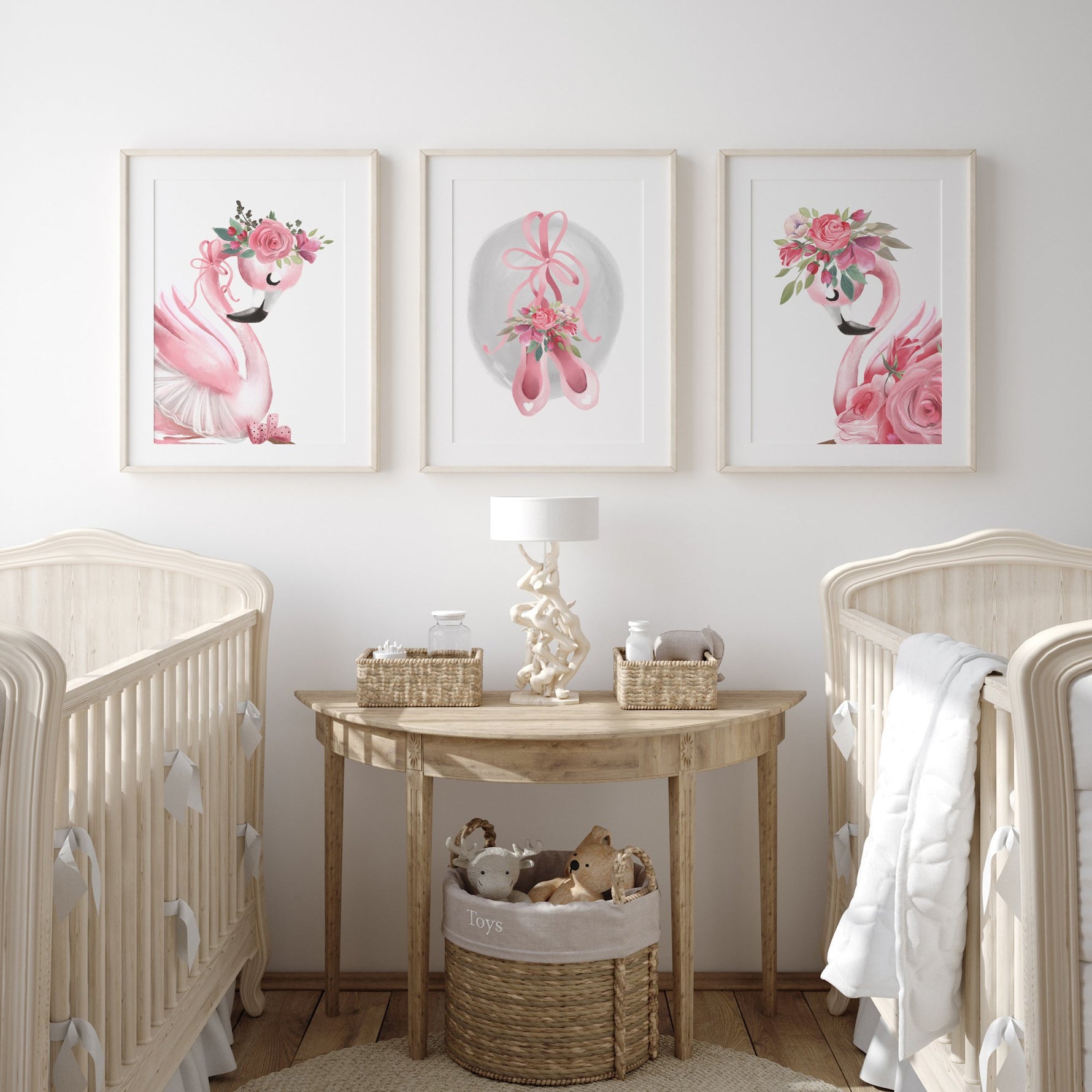 A set of three watercolour, ballet inspired nursery wall art prints, featuring two floral flamingos in tutu's and a pointe shoes print. A perfect new baby gift or add the finishing touches your own little girls bedroom or playroom decor.