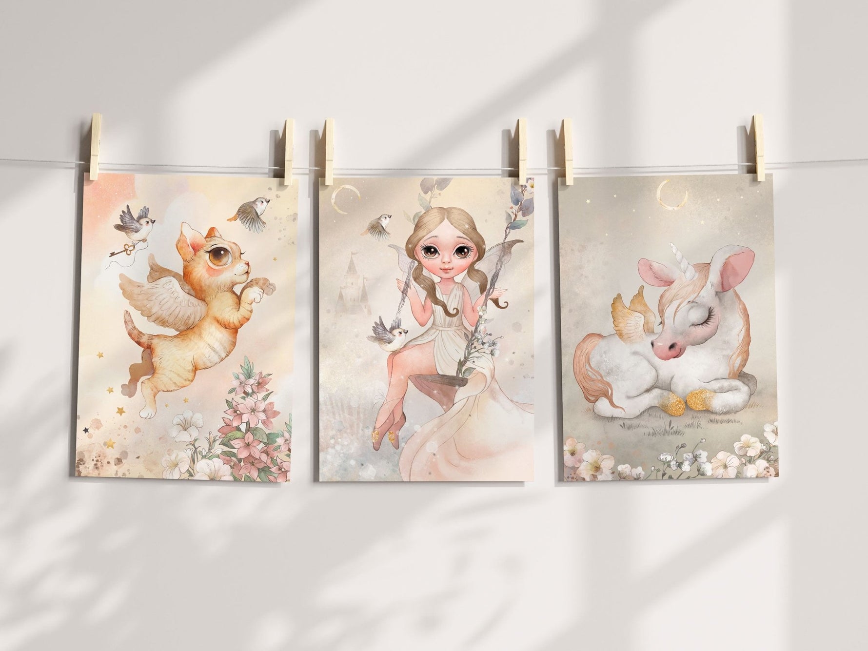 A beautiful addition to your little girl's nursery, bedroom or playroom decor is this set of three vintage styled wall art prints. Featuring a fairy, unicorn and magical kitten add the finishing touches to any little girl's special space.
