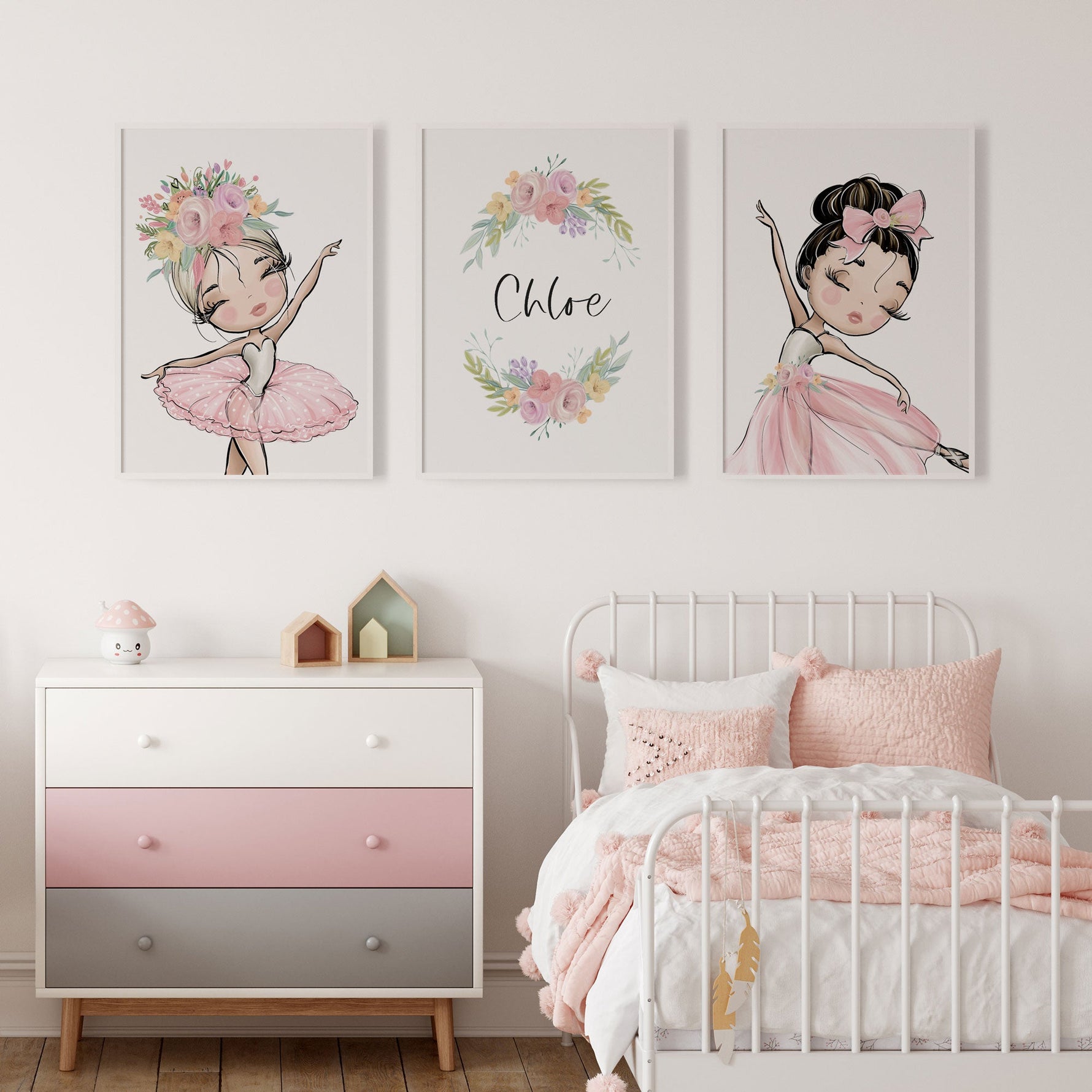 Unit price perA set of three ballet inspired nursery wall art prints. Featuring two ballerinas and a personalised name print. A perfect new baby gift or add the finishing touches your own little girls bedroom or playroom decor.