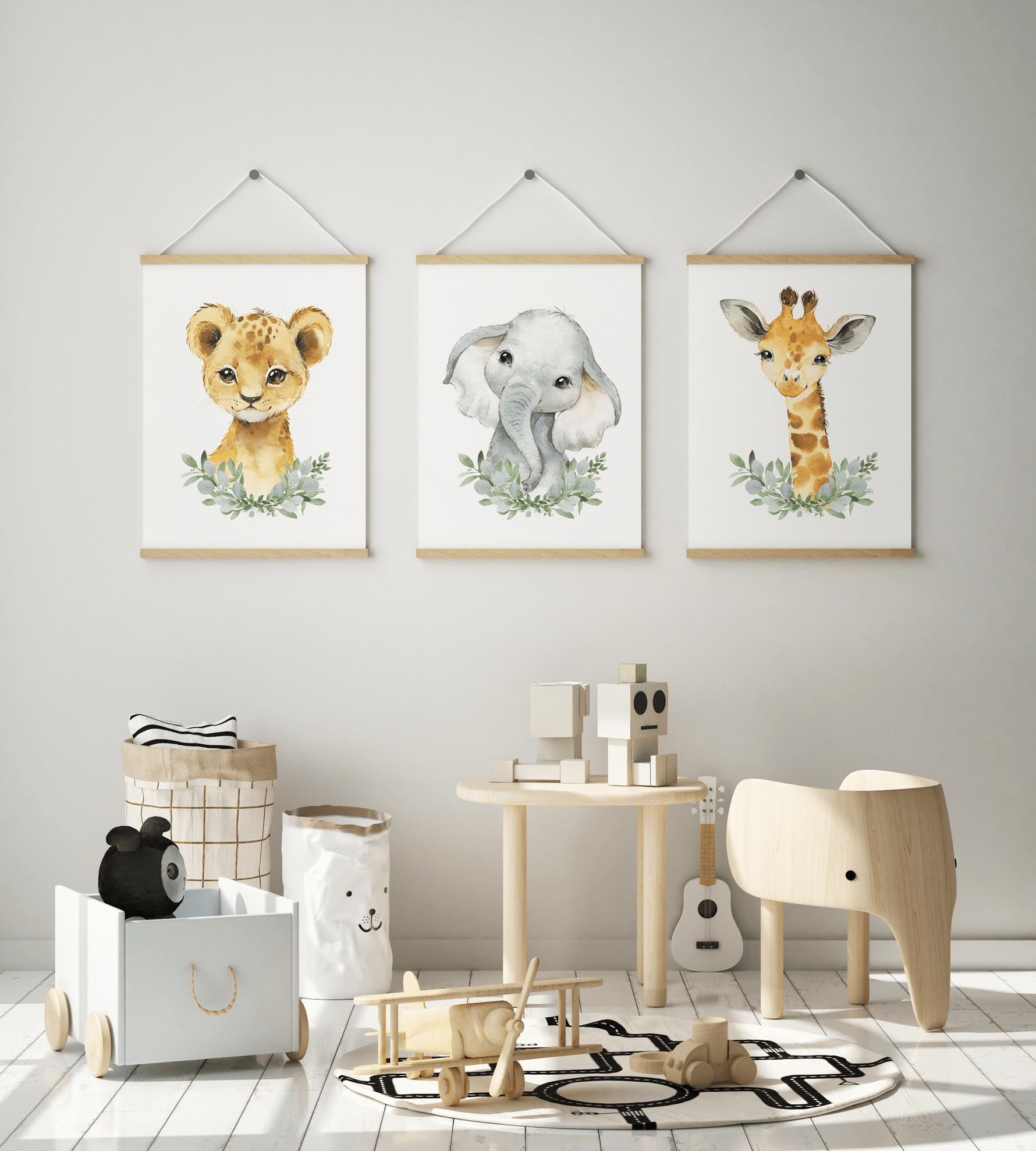 A woodland, safari nursery or bedroom wall art print set includes an elephant, giraffe and lion print.
