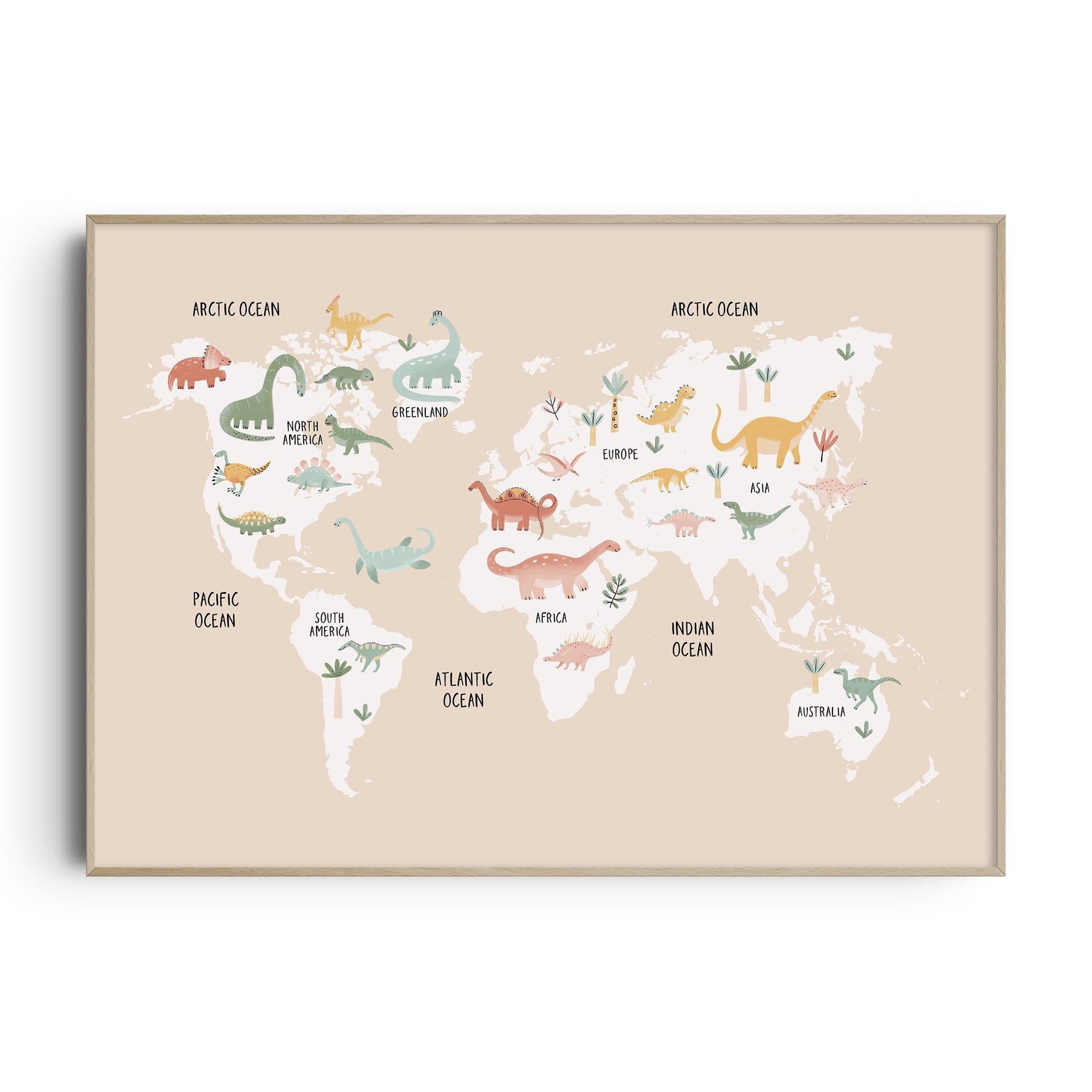 Unit price perThis Watercolour Dinosaur World Map Print is perfect for a nursery or kids' room. It features four striking colorways with a prehistoric twist and provides a fun, educational decorative piece of wall art.