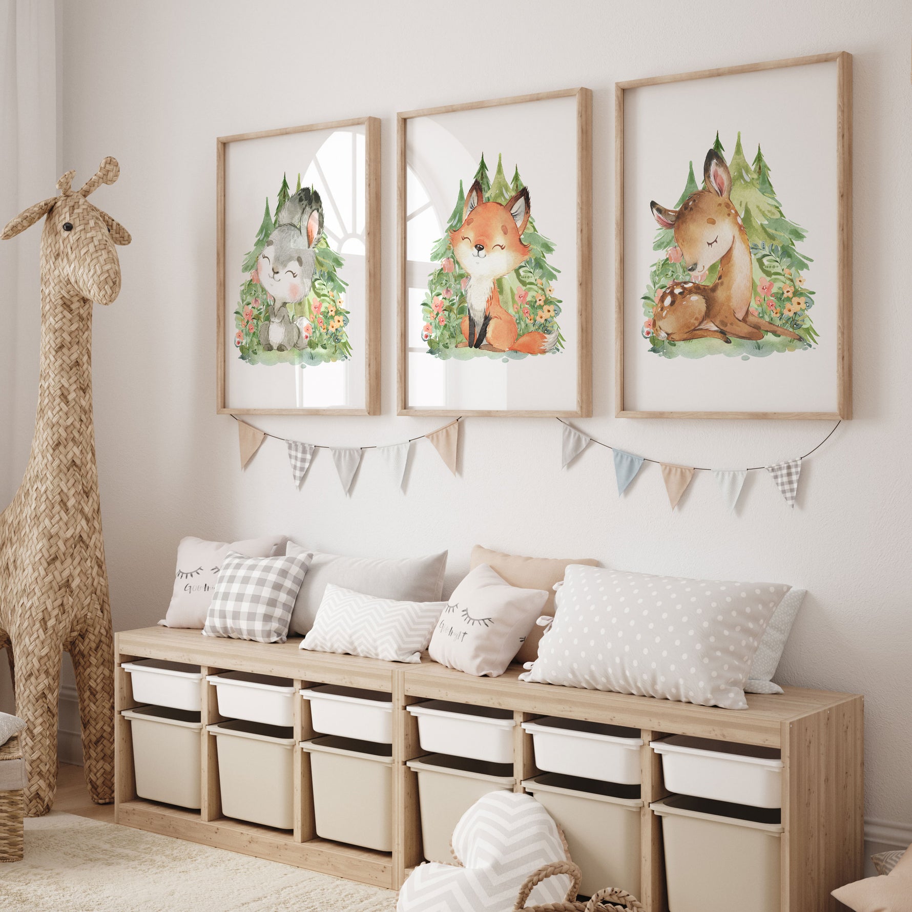 Perfect for the forest or woodland themed nursery, bedroom or playroom decor is this set of 3 animal prints, featuring a fox, deer & bunny.