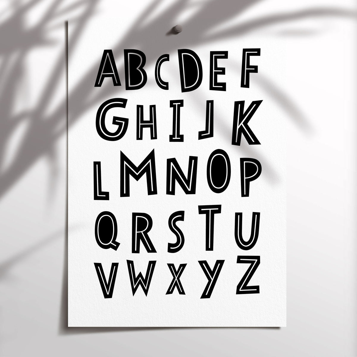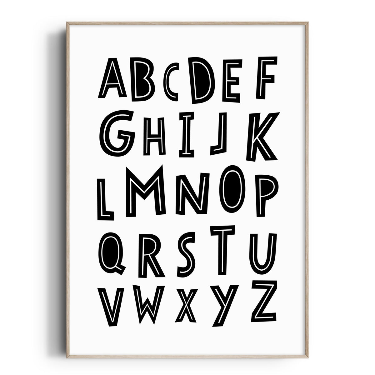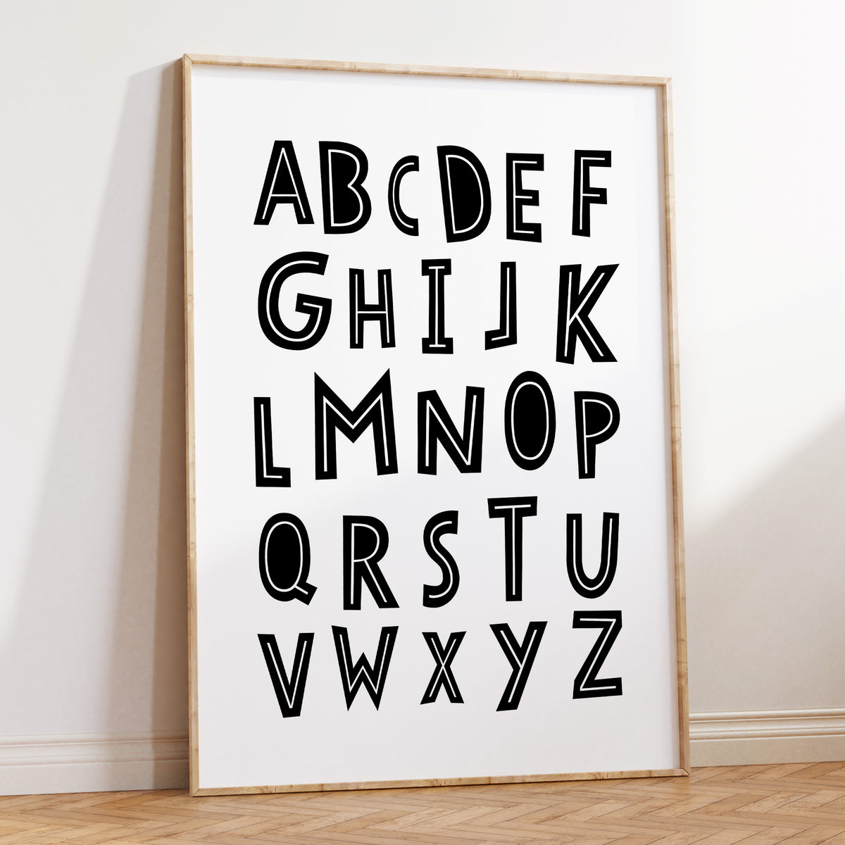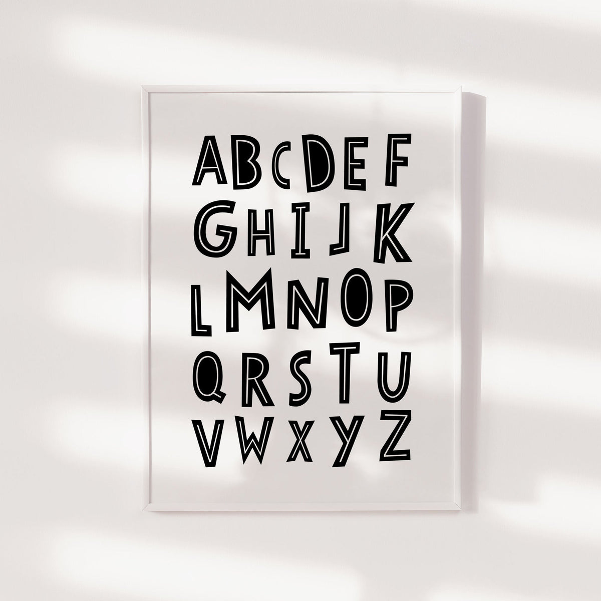 A scandi inspired monochrome alphabet nursery wall art print. Perfect for the modern nursery or bedroom décor.