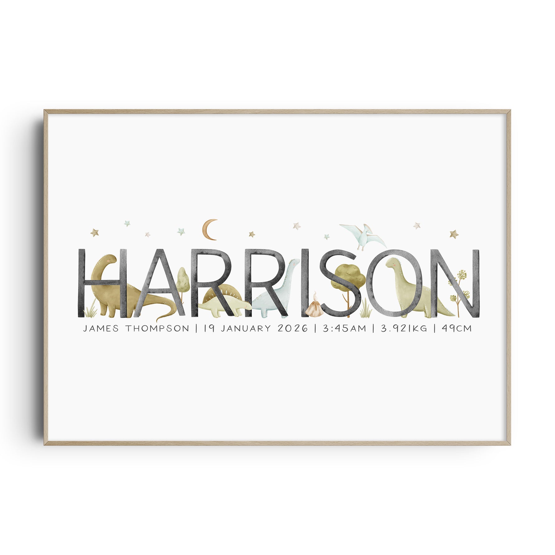 Perfect for the dinosaur or Jurassic themed nursery, this personalised baby name print is available with your choice of dinosaurs along with the option to add your little one's birth details, it makes a perfect new baby gift or add the finishing touches to your own little boy's room.