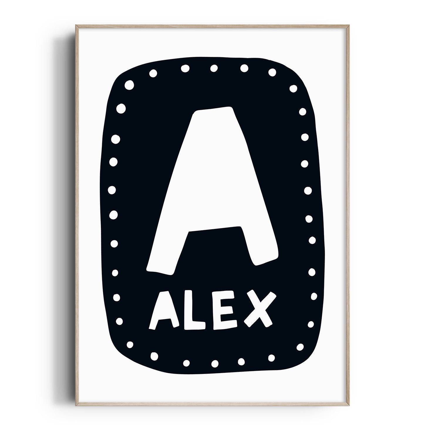 Kids customised letter and name wall art print, a statement piece for the monochrome nursery or bedroom decor.