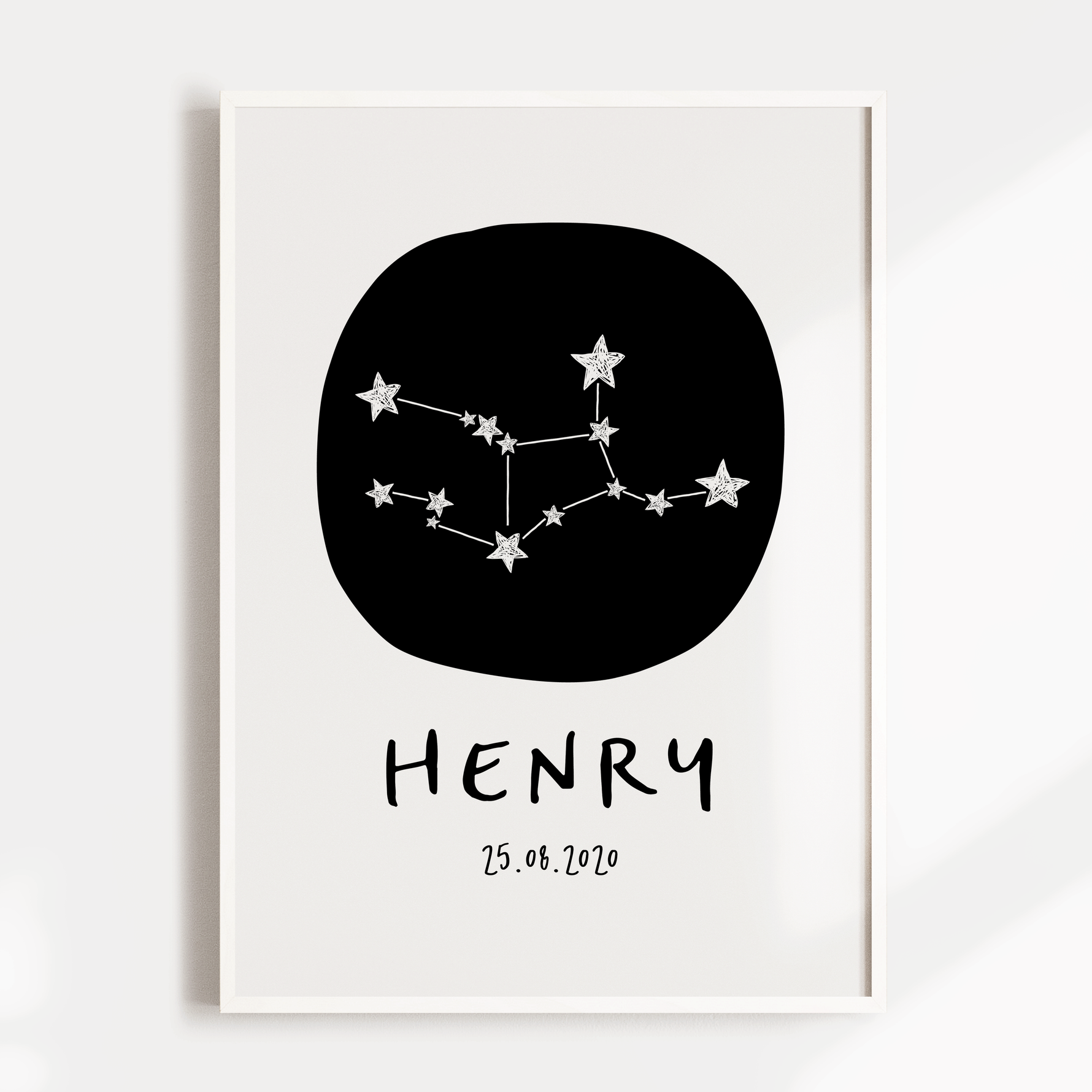 Unit price perA customised name and birth date wall art print, featuring the Taurus star sign constellation. A statement piece for the monochrome nursery or bedroom decor.