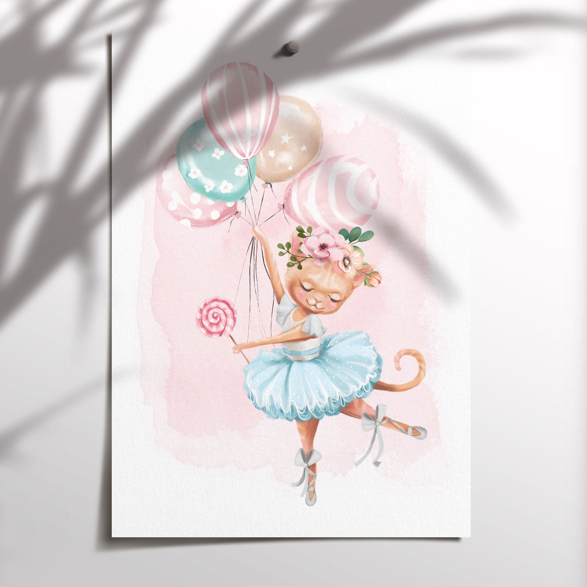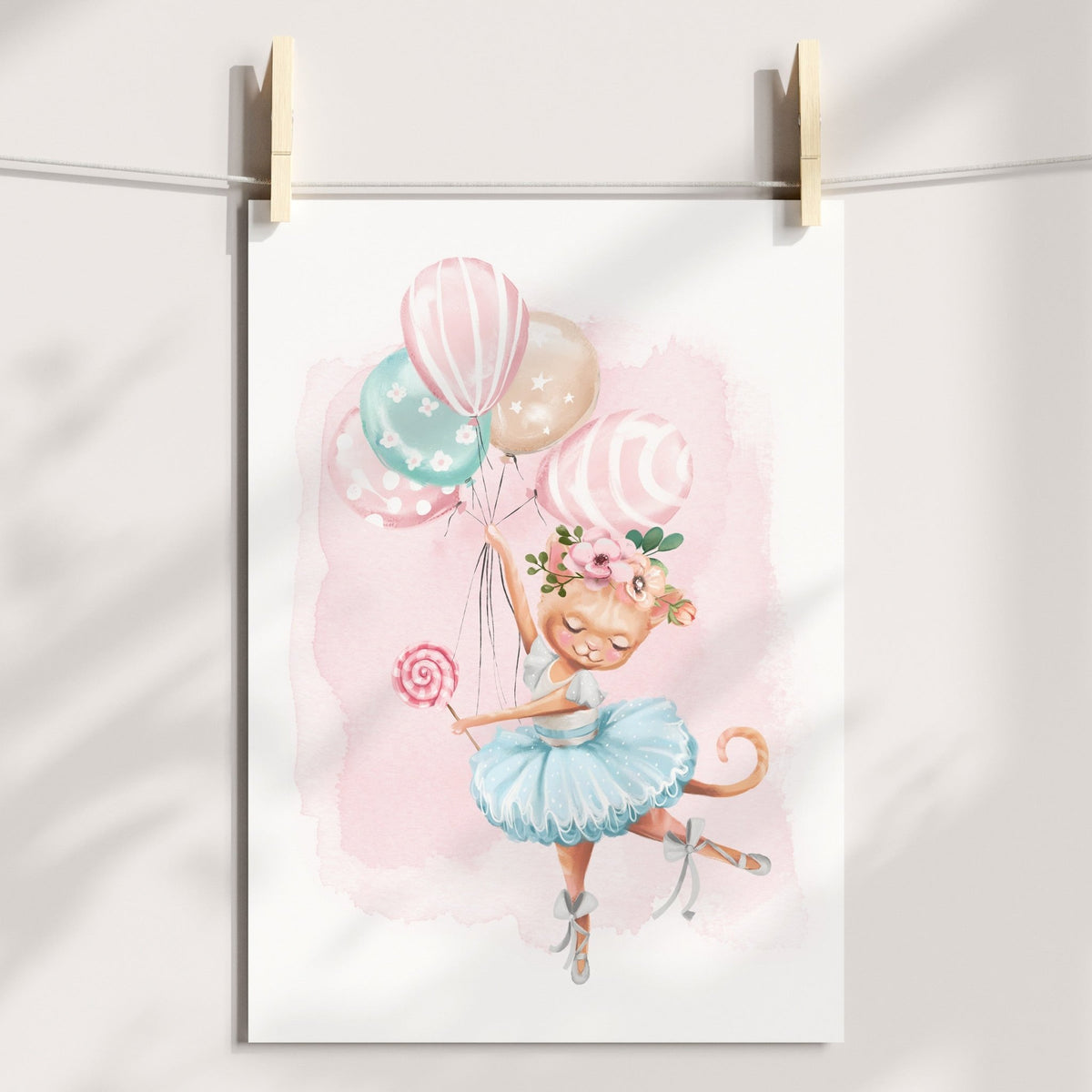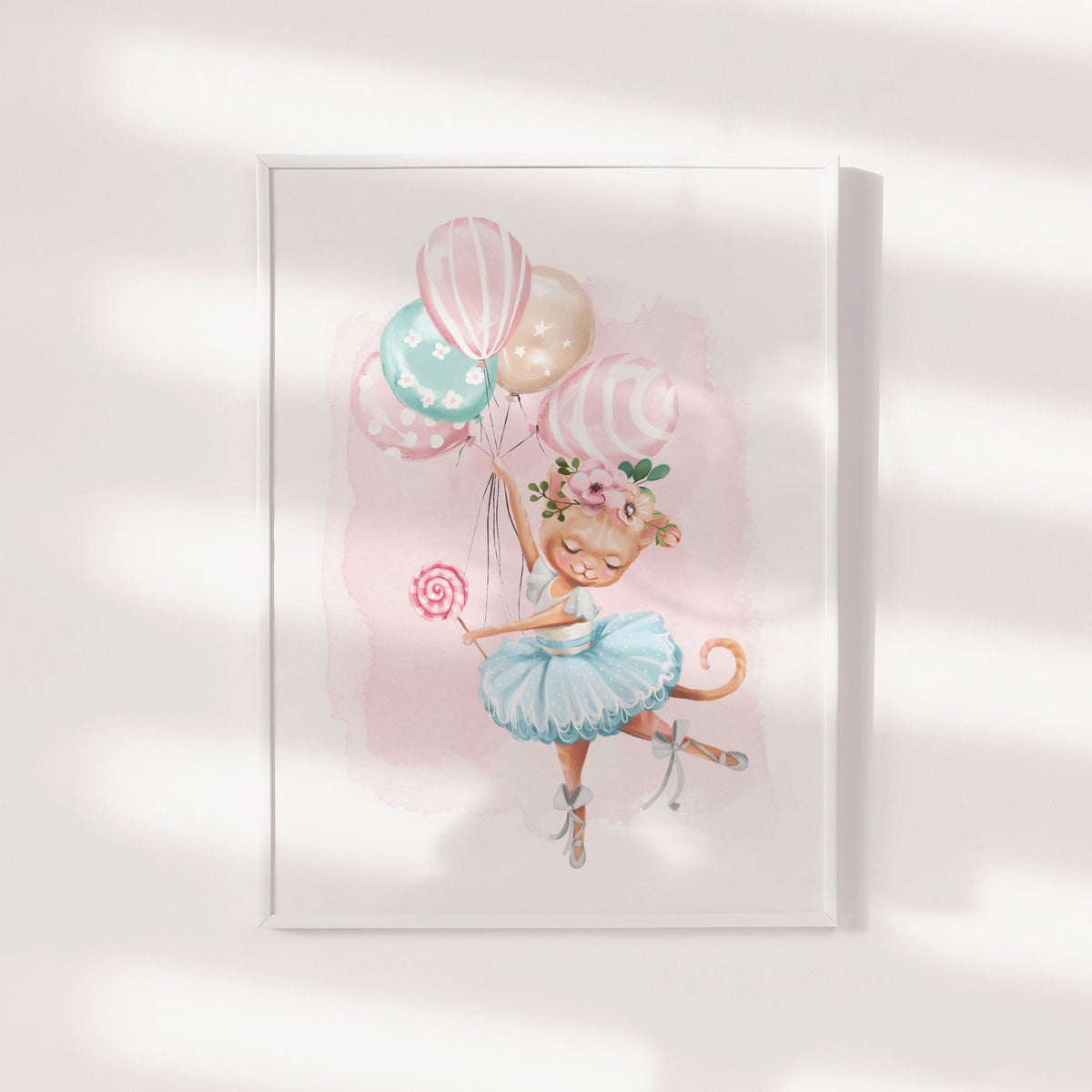 Make a statement with this ballerina wall art print featuring a dancing kitten with balloons, it can be paired with our other co-ordinating prints and is perfect for any little girls ballet or dance themed nursery, bedroom or playroom decor.