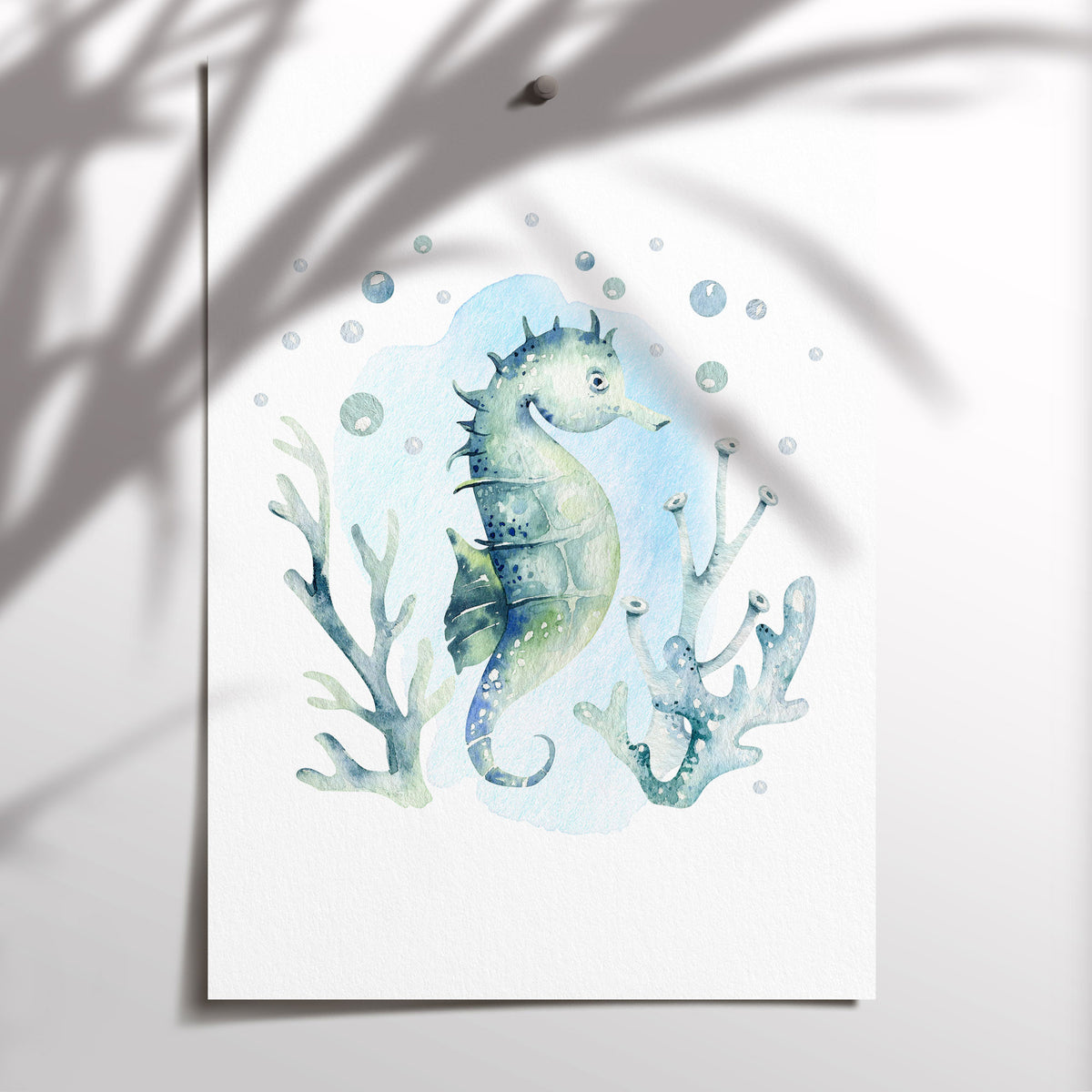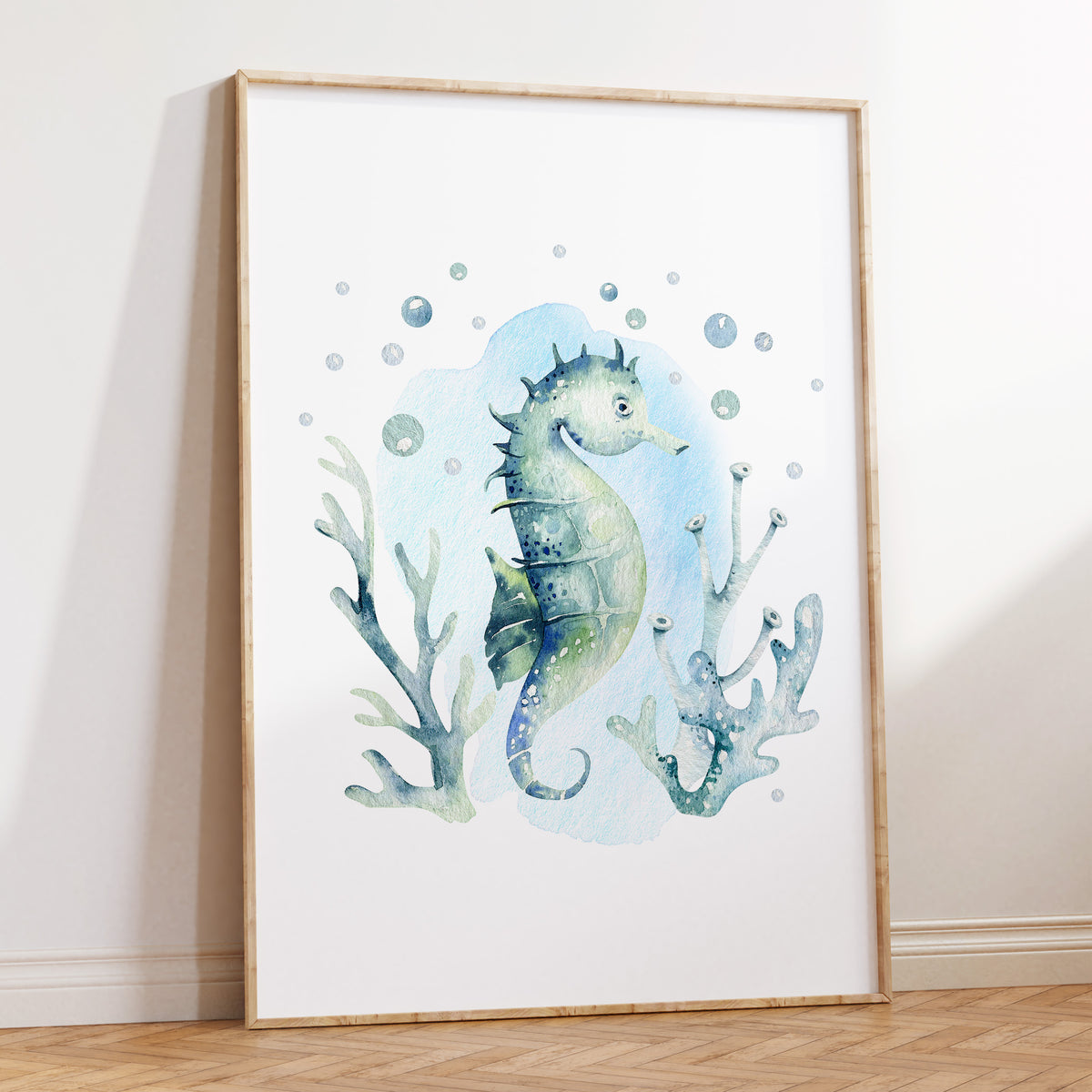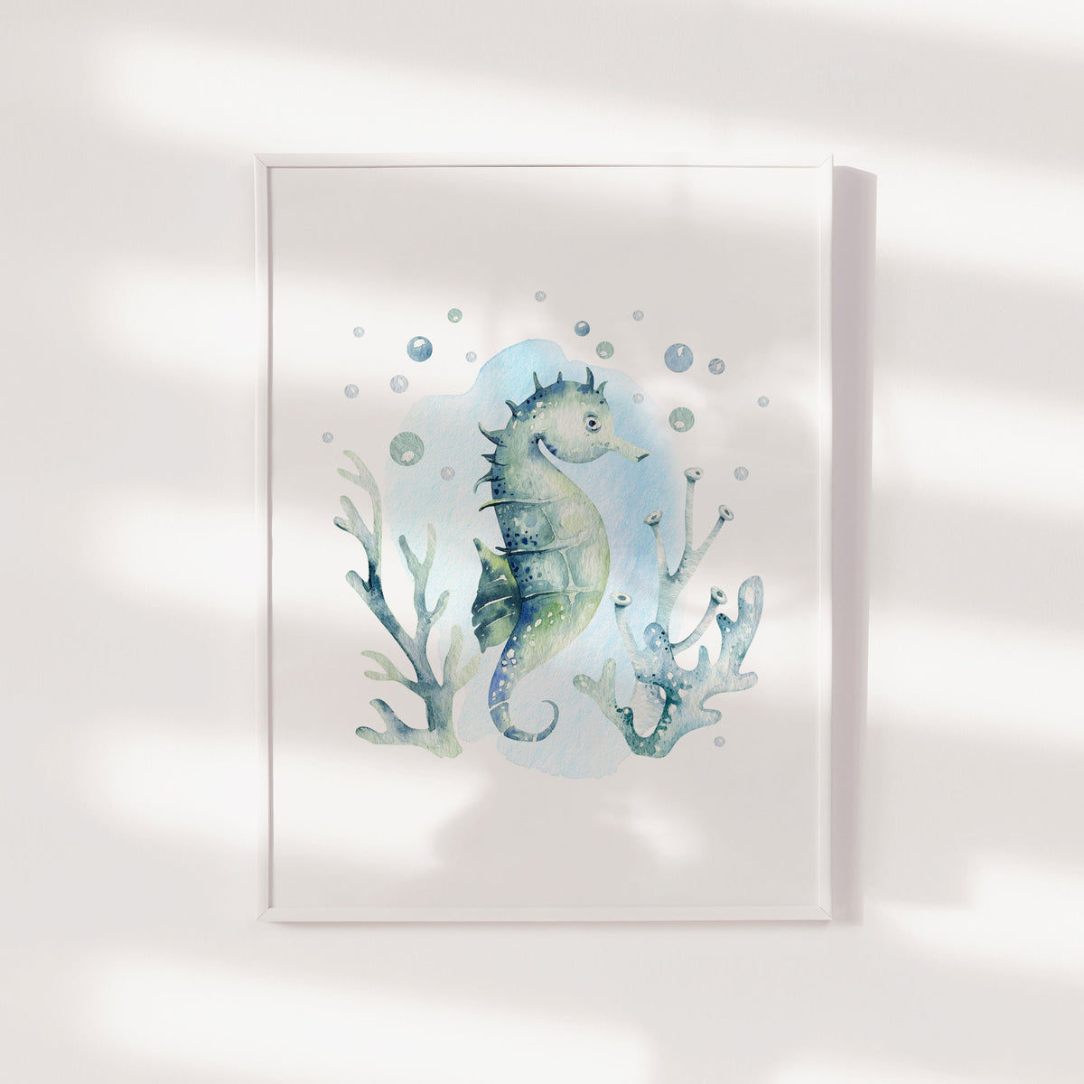 Unit price perPerfect for the ocean themed nursery, bedroom or playroom decor is this watercolour seahorse wall art print, use as a standalone piece or co-ordinate with our other under the sea prints.