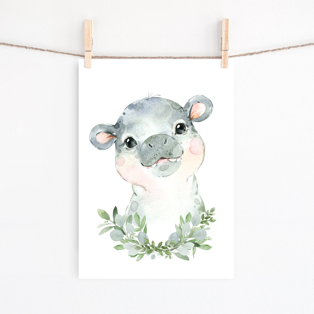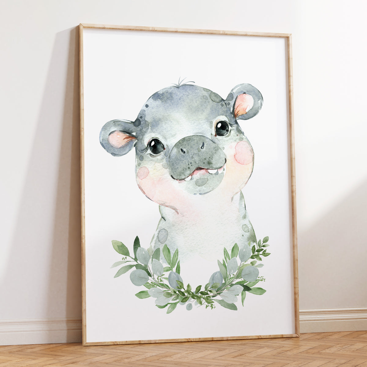 This watercolour baby hippo wall art, would make a lovely addition to a nursery, child's bedroom, or playroom. Pair it with one of our many other baby safari animal prints or use as a stand alone statement.