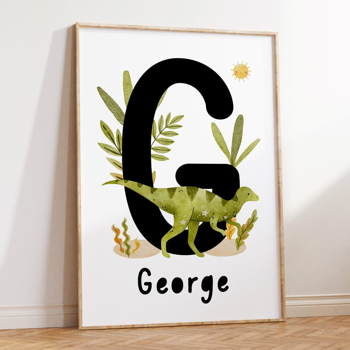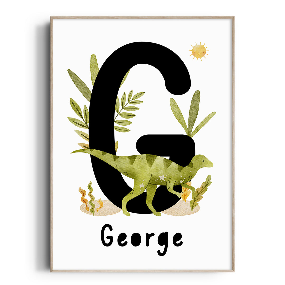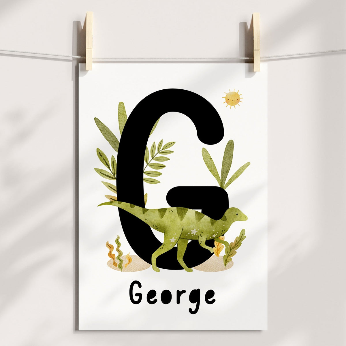 Unit price perThe perfect addition to the prehistoric themed nursery, bedroom or playroom decor is this personalised dinosaur name wall art print featuring a prehistoric velociraptor.