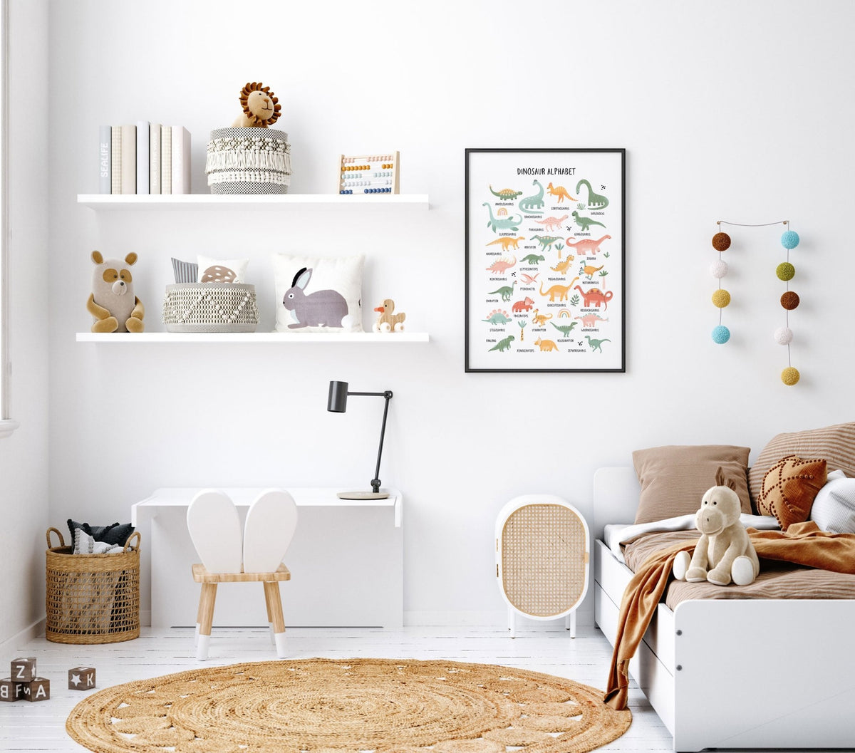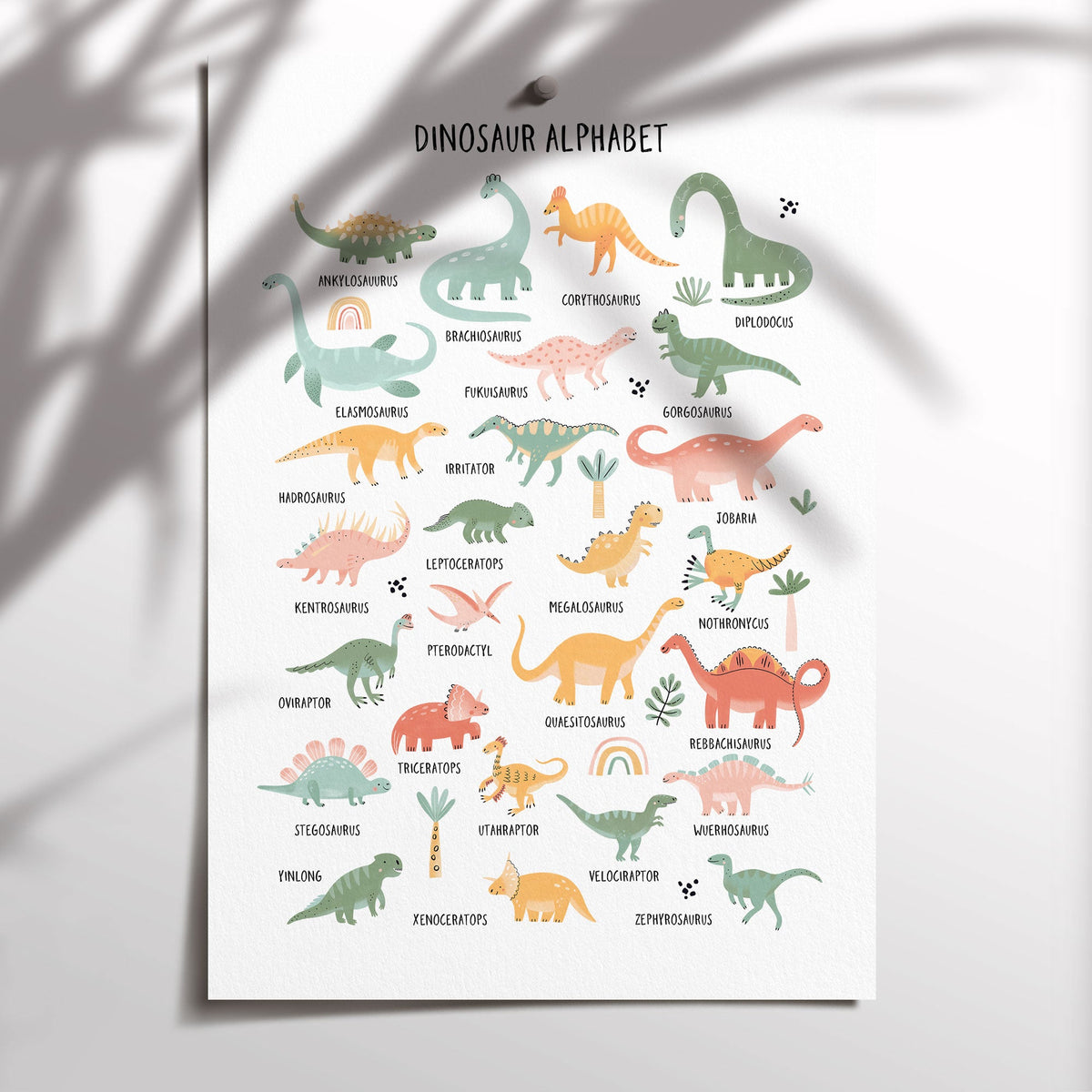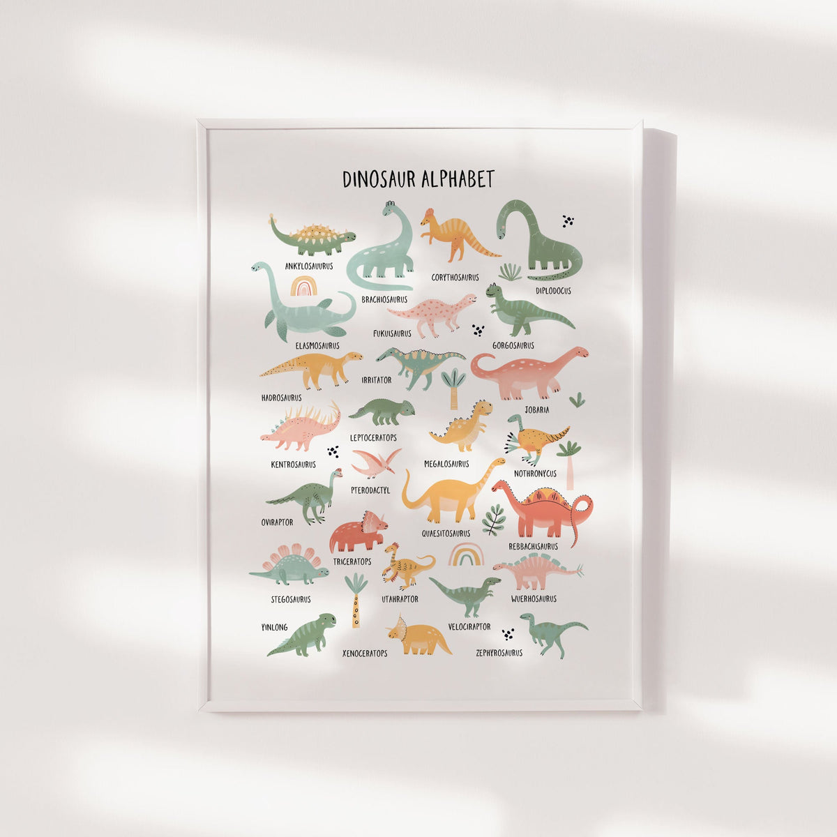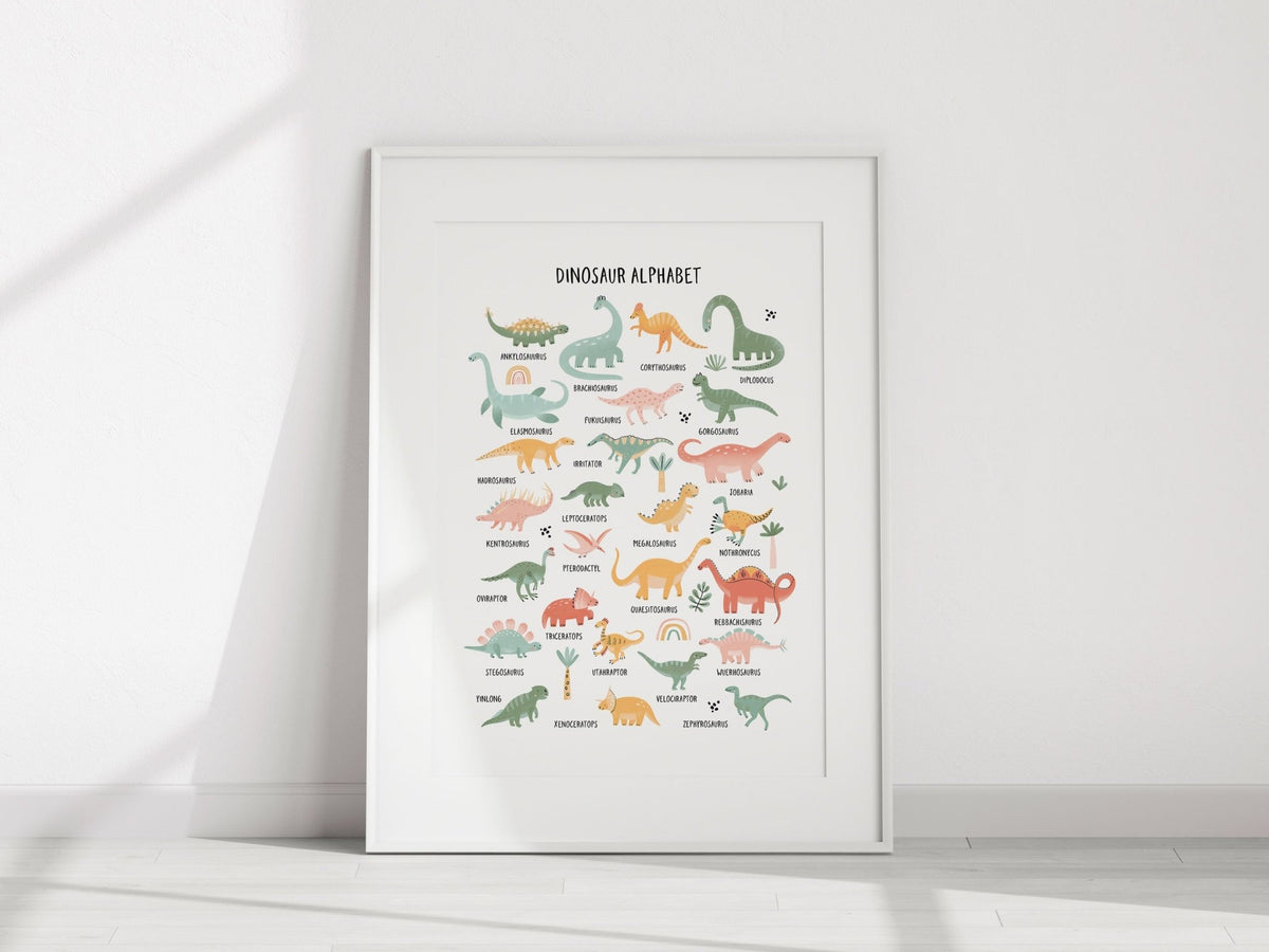 Unit price perThe perfect addition to the prehistoric themed nursery, bedroom or playroom decor is this fun educational dinosaur alphabet wall art print.