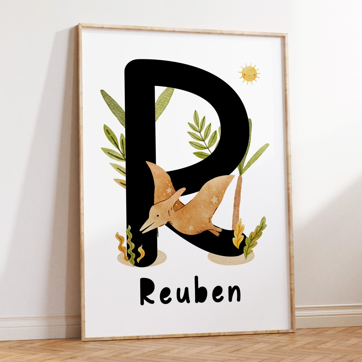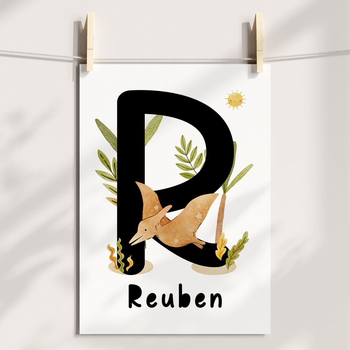 Unit price perThe perfect addition to the prehistoric themed nursery, bedroom or playroom decor is this personalised dinosaur name wall art print featuring a prehistoric pteranodon.
