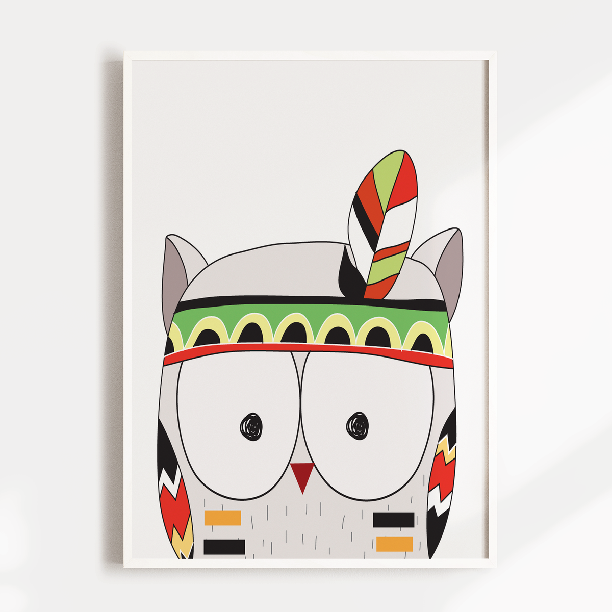 Unit price perThis owl nursery wall art print is perfect for the woodland, tribal or animal themed bedroom, nursery or playroom decor. Use it as a stand alone feature or combine with other co-ordinating animal posters.