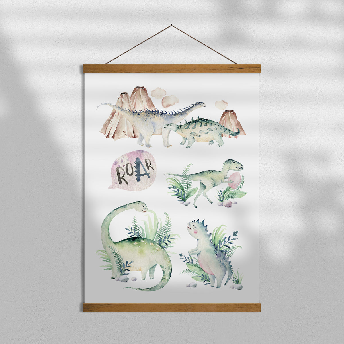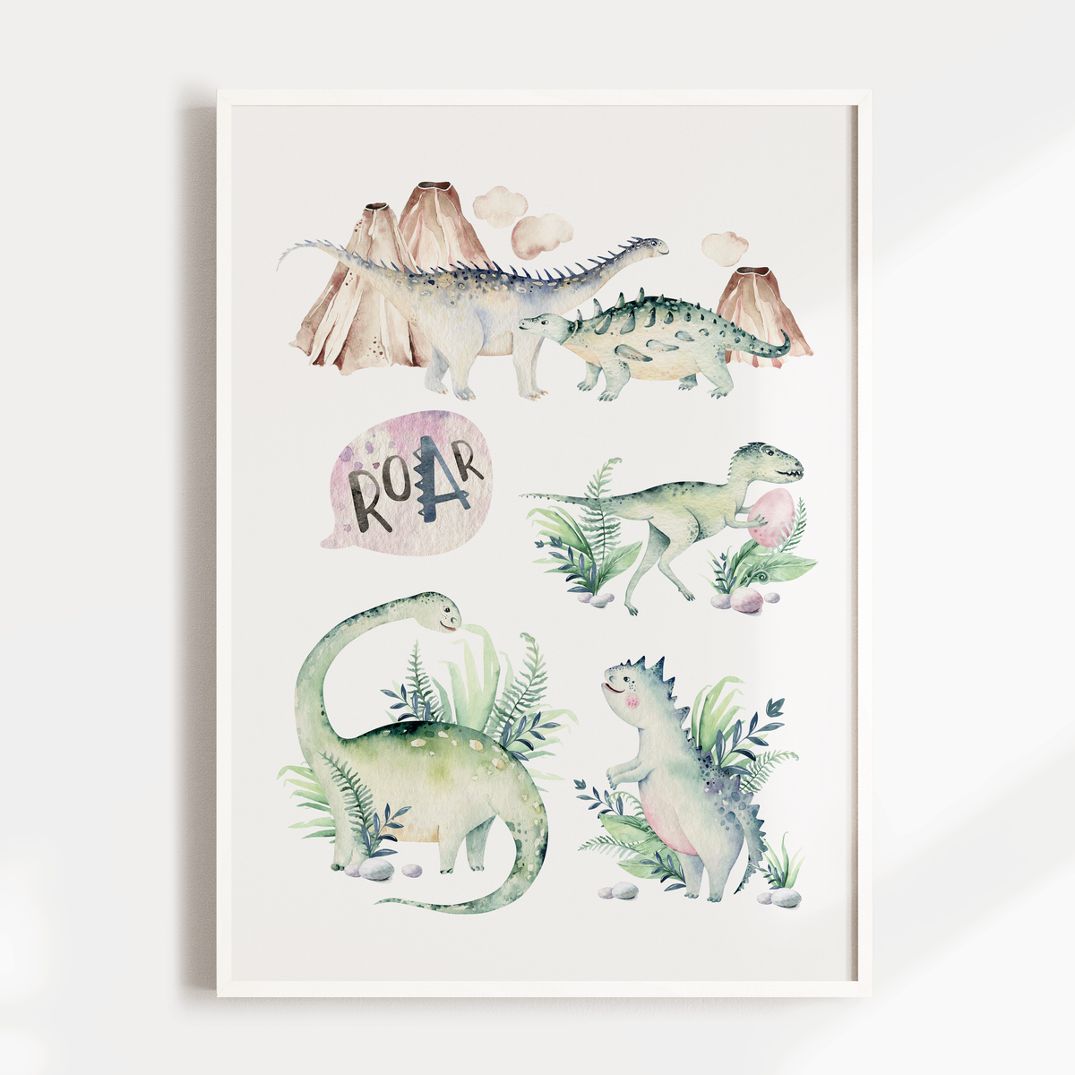 Unit price perFeaturing a collection of dinosaurs, all accentuated with prehistoric greenery and volcanoes, this wall art print will make the perfect addition to your little boys nursery, bedroom or playroom space.