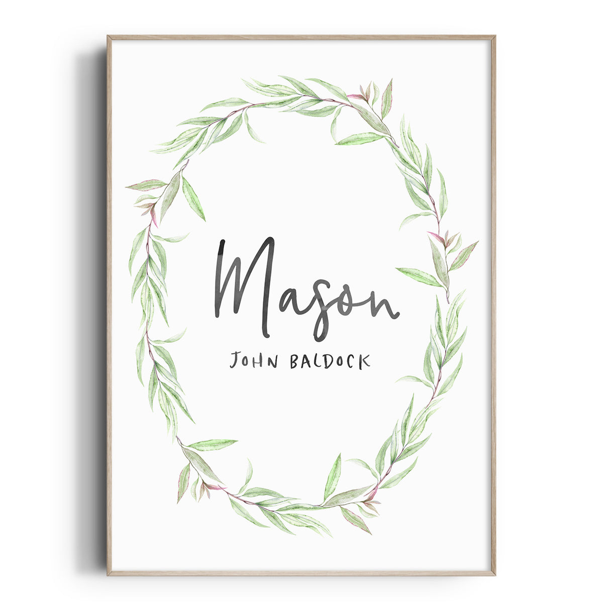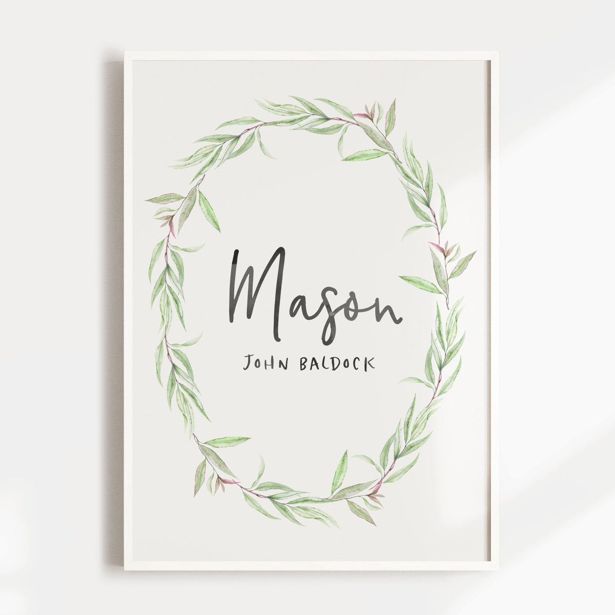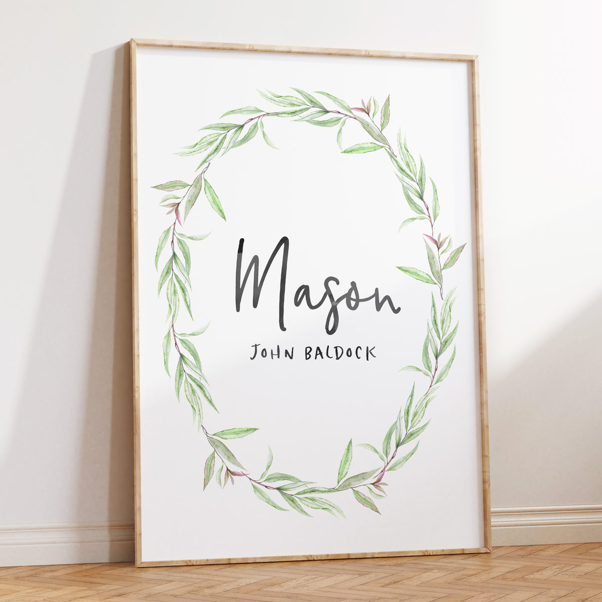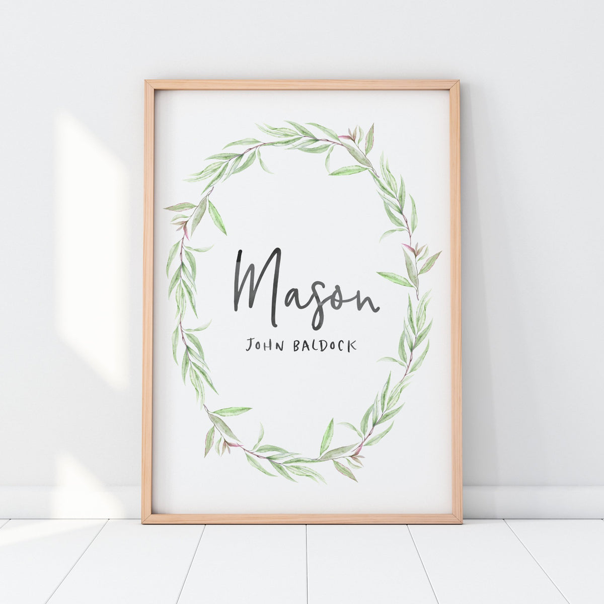 Unit price perA watercolour wreath name print, personalised with your choice of text that is perfect for the jungle & safari inspired nursery or children's bedroom décor. A perfect new baby gift, or a great way to add the finishing touches to your own child's space.