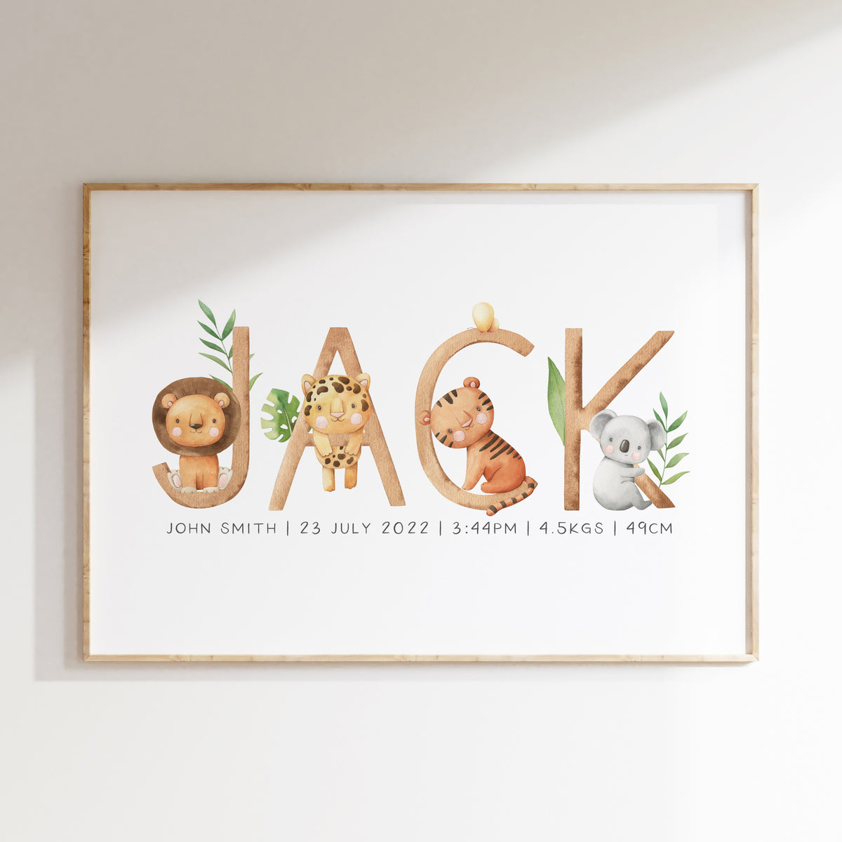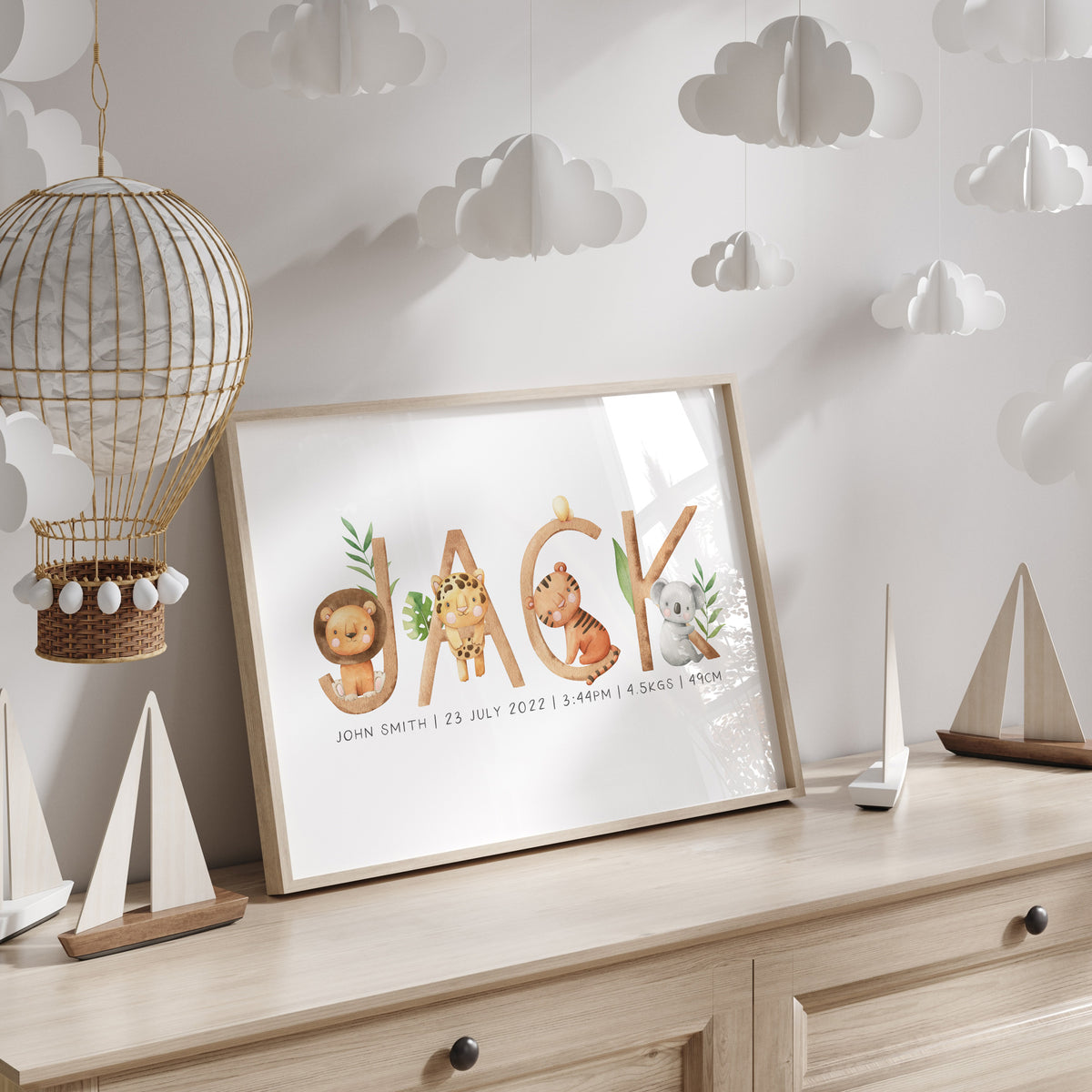 Unit price perPerfect for the jungle or safari animal themed nursery, this personalised baby name print is available with your choice of animals along with the option to add your little one's birth details, it makes a perfect new baby gift or add the finishing touches to your own little boy's room.