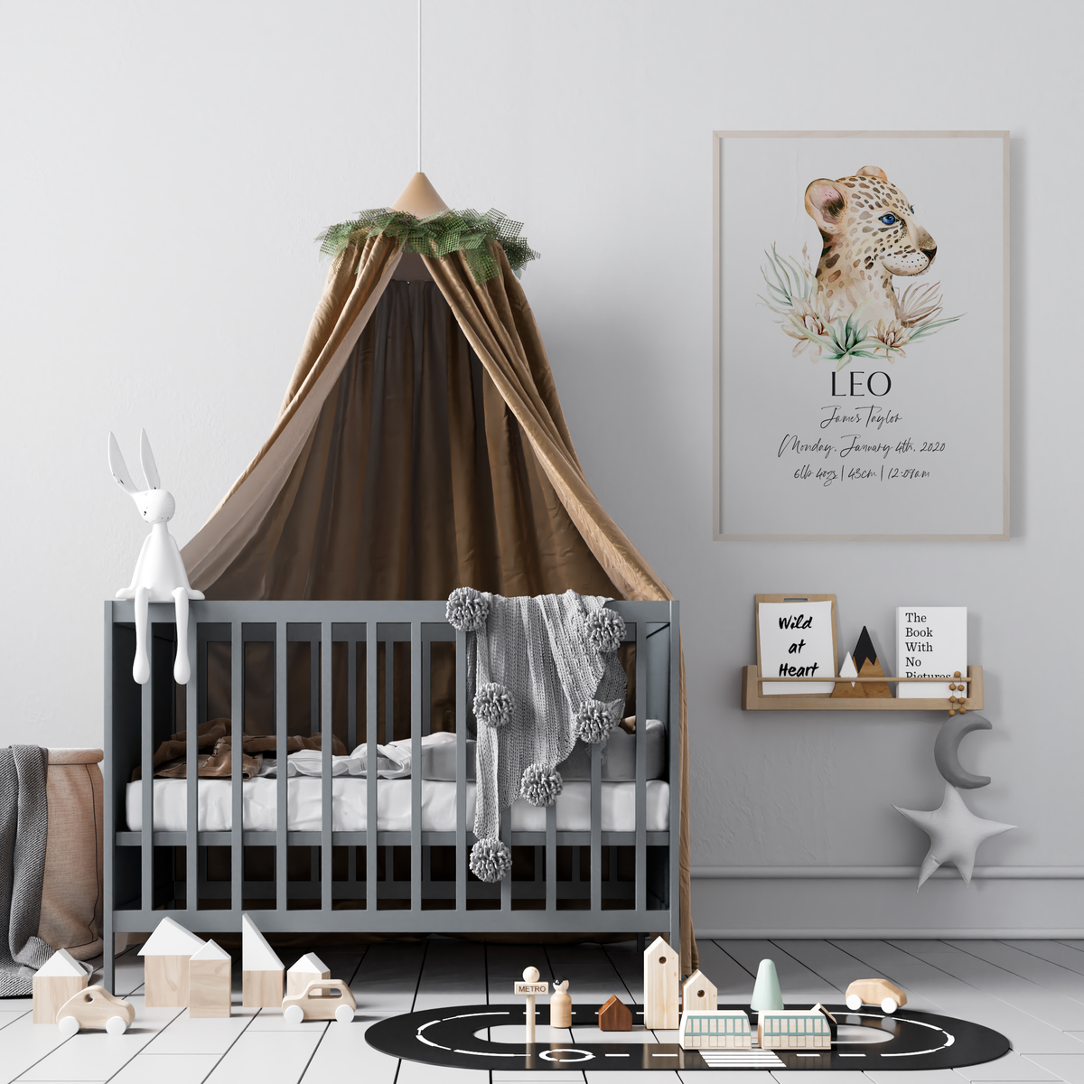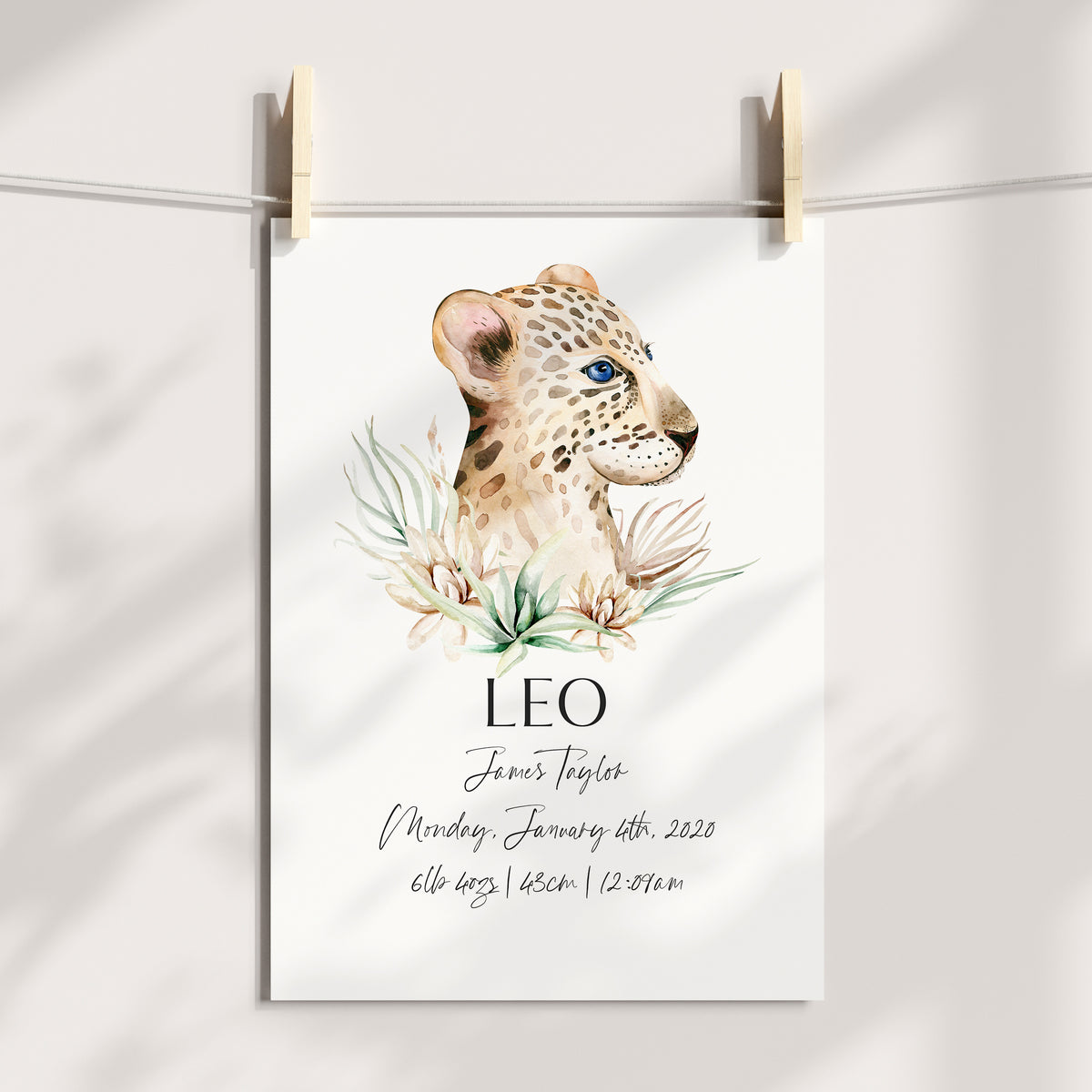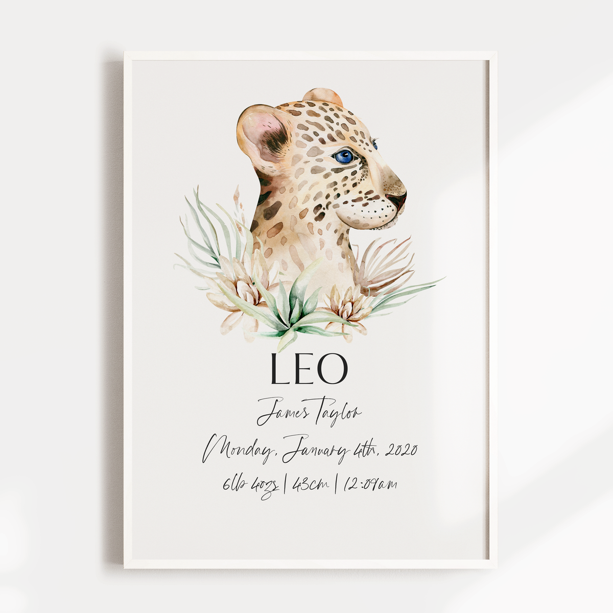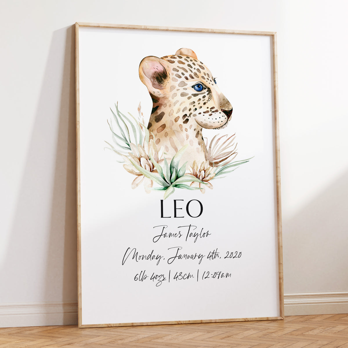 Unit price perA watercolour baby tiger surrounded with savanna greenery and personalised with your child's birth details, perfect for the safari inspired nursery. A beautiful new baby gift, or a great way to add the finishing touches to your own child's space.