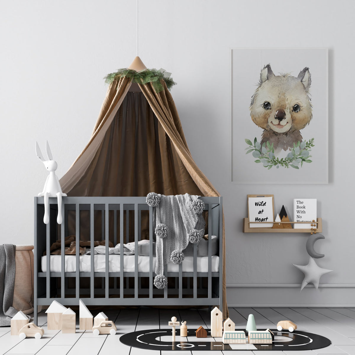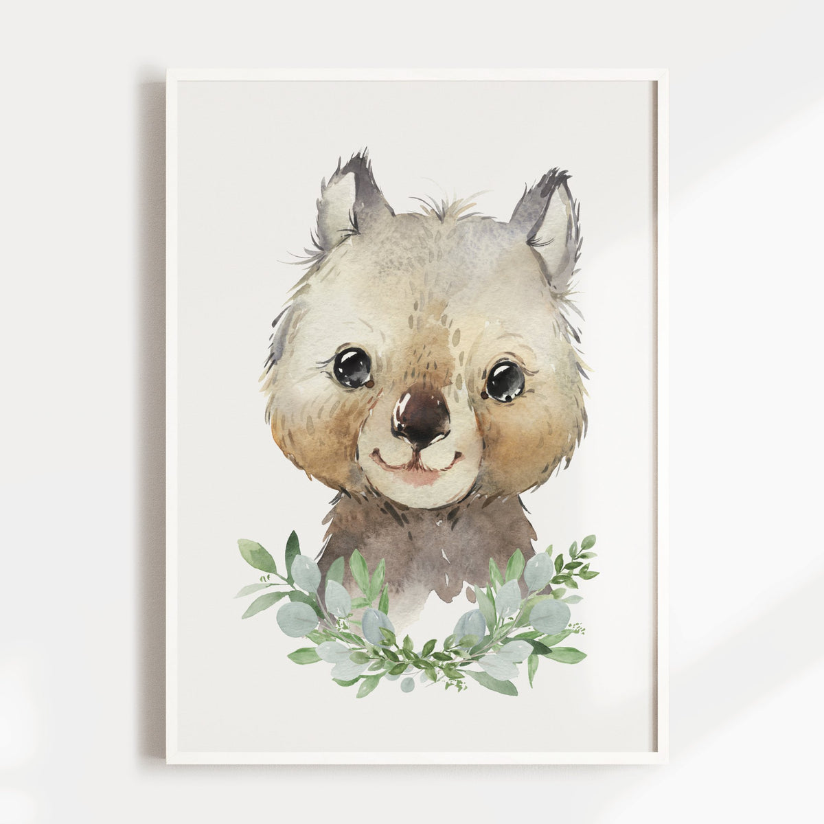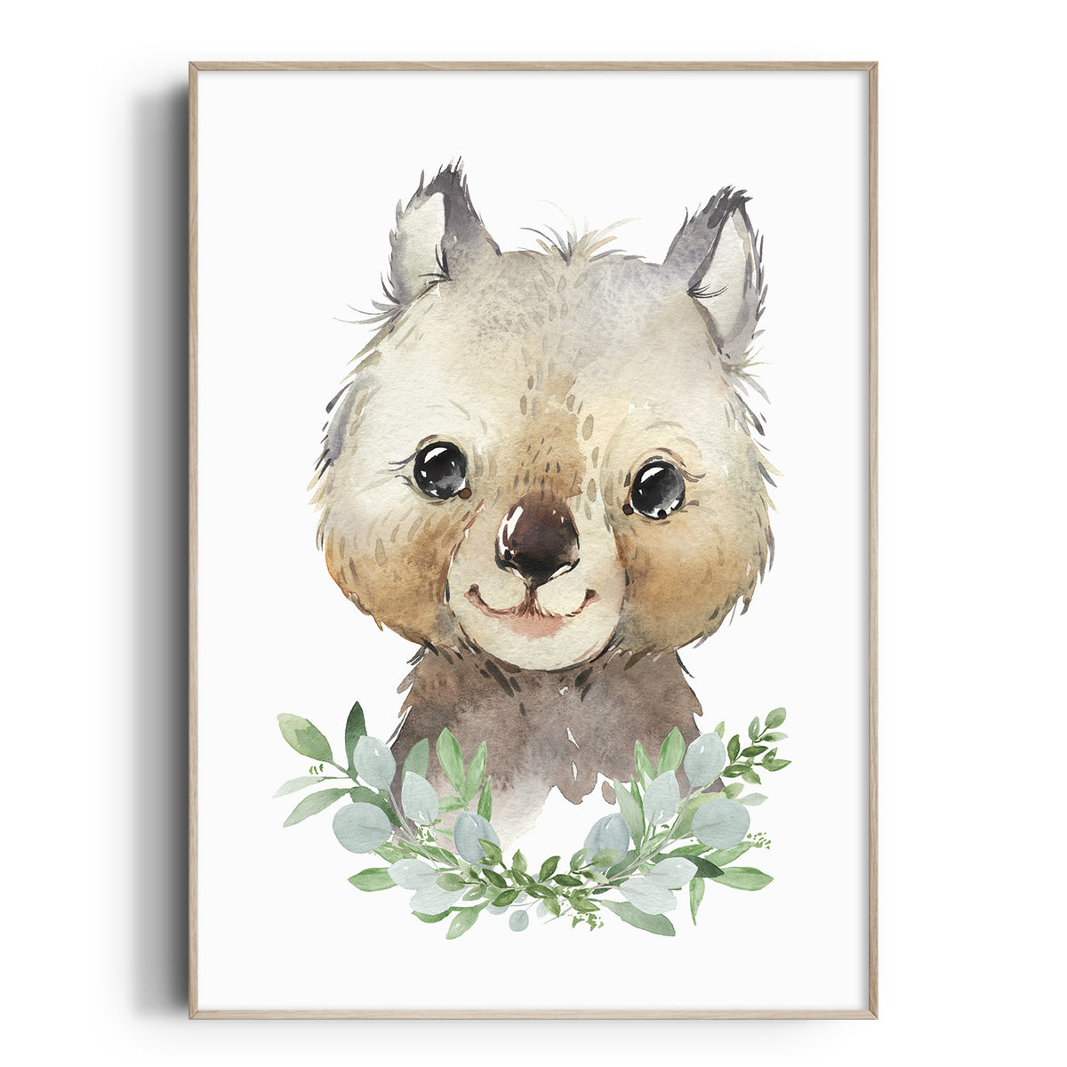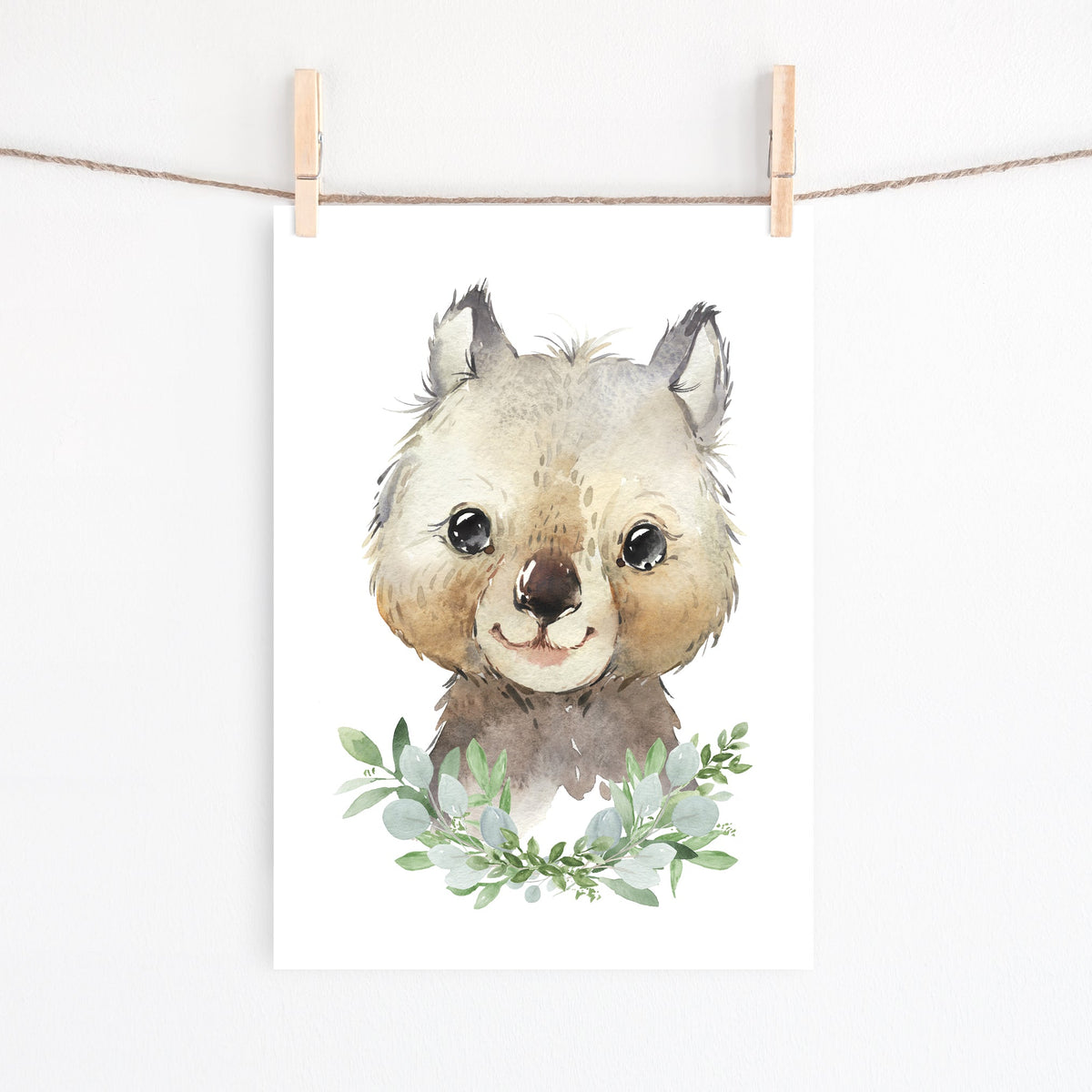 Unit price perAustralian animal nursery wall art. A watercolour baby wombat print, featuring soft floral greenery, a perfect new baby gift, or add the finishing touches to your own child's space.