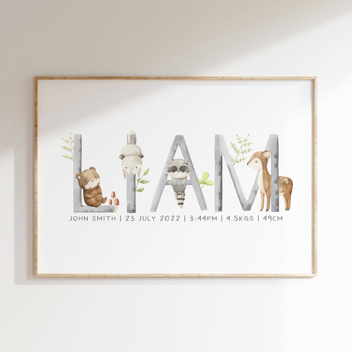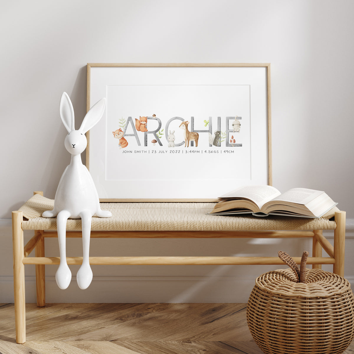 Unit price perPerfect for the woodland or forest animal themed nursery, this personalised baby name print is available with your choice of animals along with the option to add your little one's birth details, it makes a perfect new baby gift or add the finishing touches to your own little boy's room.