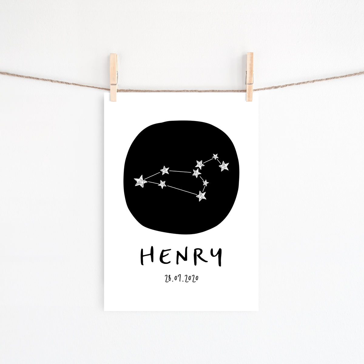 Unit price perA customised name and birth date wall art print, featuring the Leo star sign constellation. A statement piece for the monochrome nursery or bedroom decor.