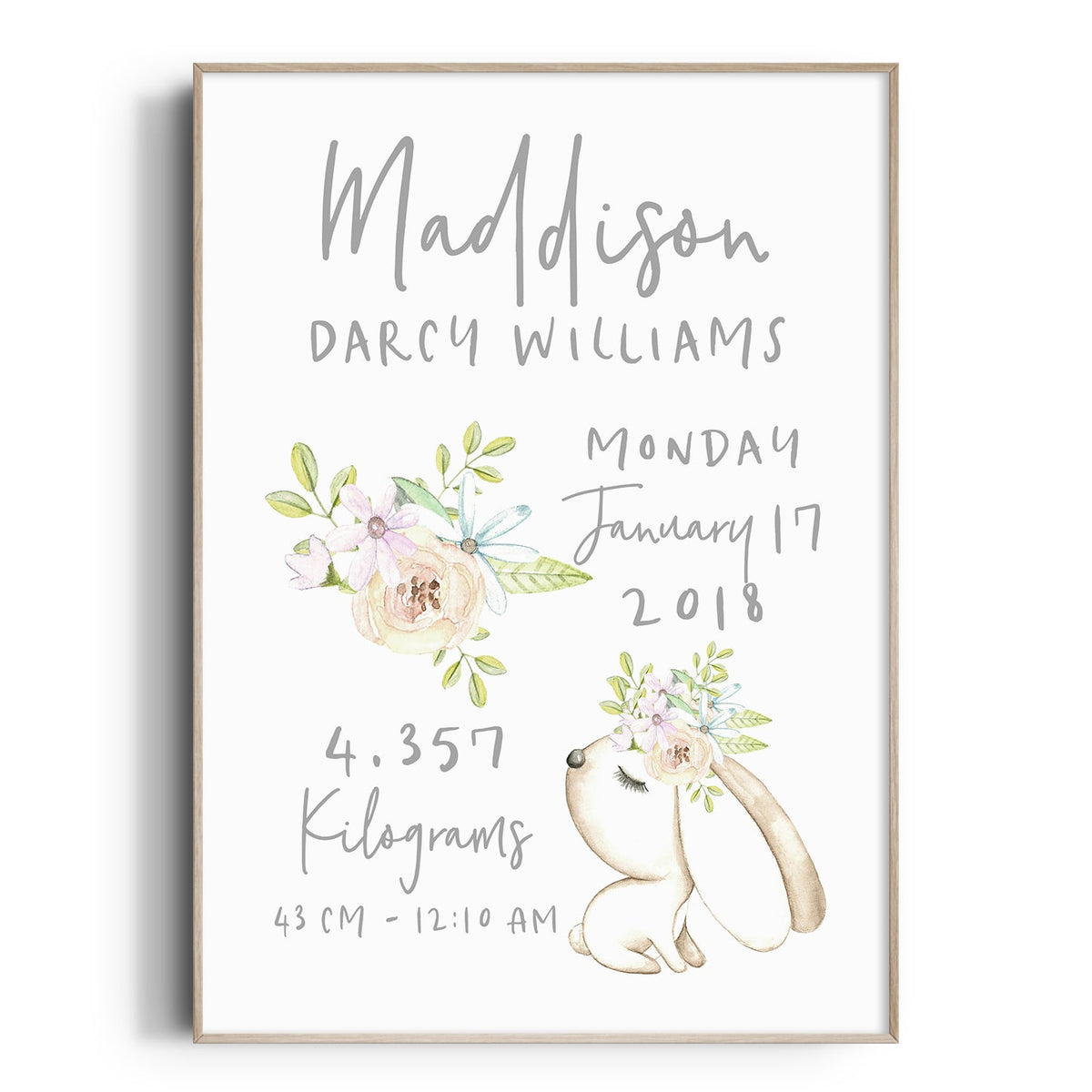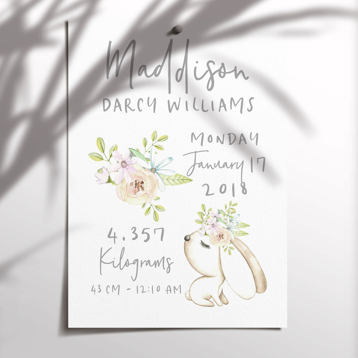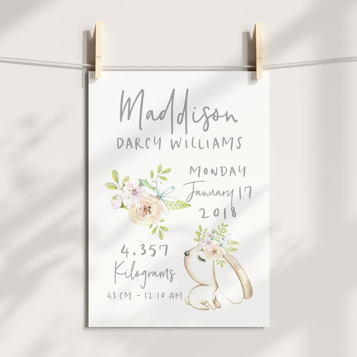 Unit price perWelcome your little one into the world with this Floral Woodland Bunny Birth Print. Perfect for a nursery, this beautiful print features an adorable bunny surrounded by lovely florals. Personalize the print with your baby's birth details for a unique and meaningful keepsake. Perfect for any girl's bedroom.