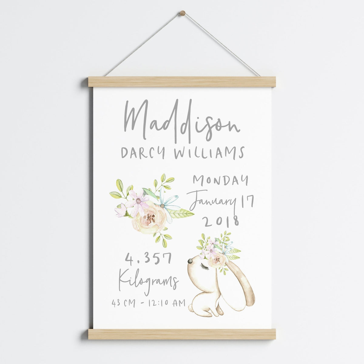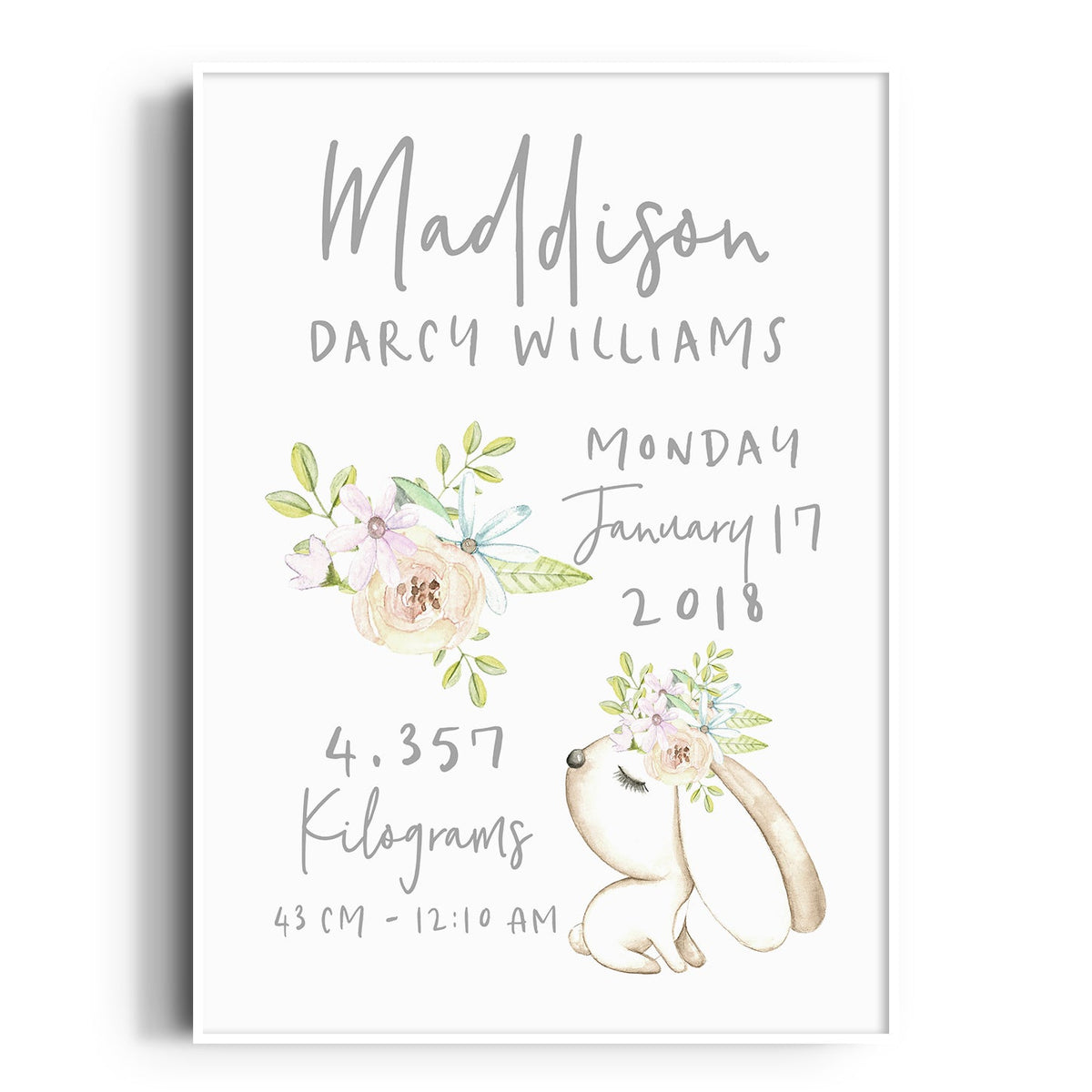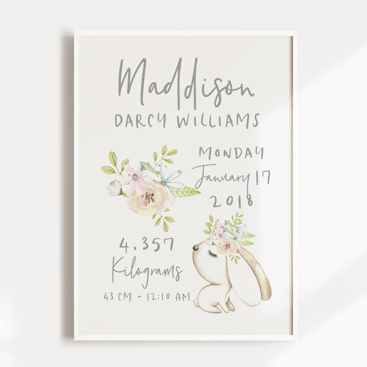 Unit price perWelcome your little one into the world with this Floral Woodland Bunny Birth Print. Perfect for a nursery, this beautiful print features an adorable bunny surrounded by lovely florals. Personalize the print with your baby's birth details for a unique and meaningful keepsake. Perfect for any girl's bedroom.