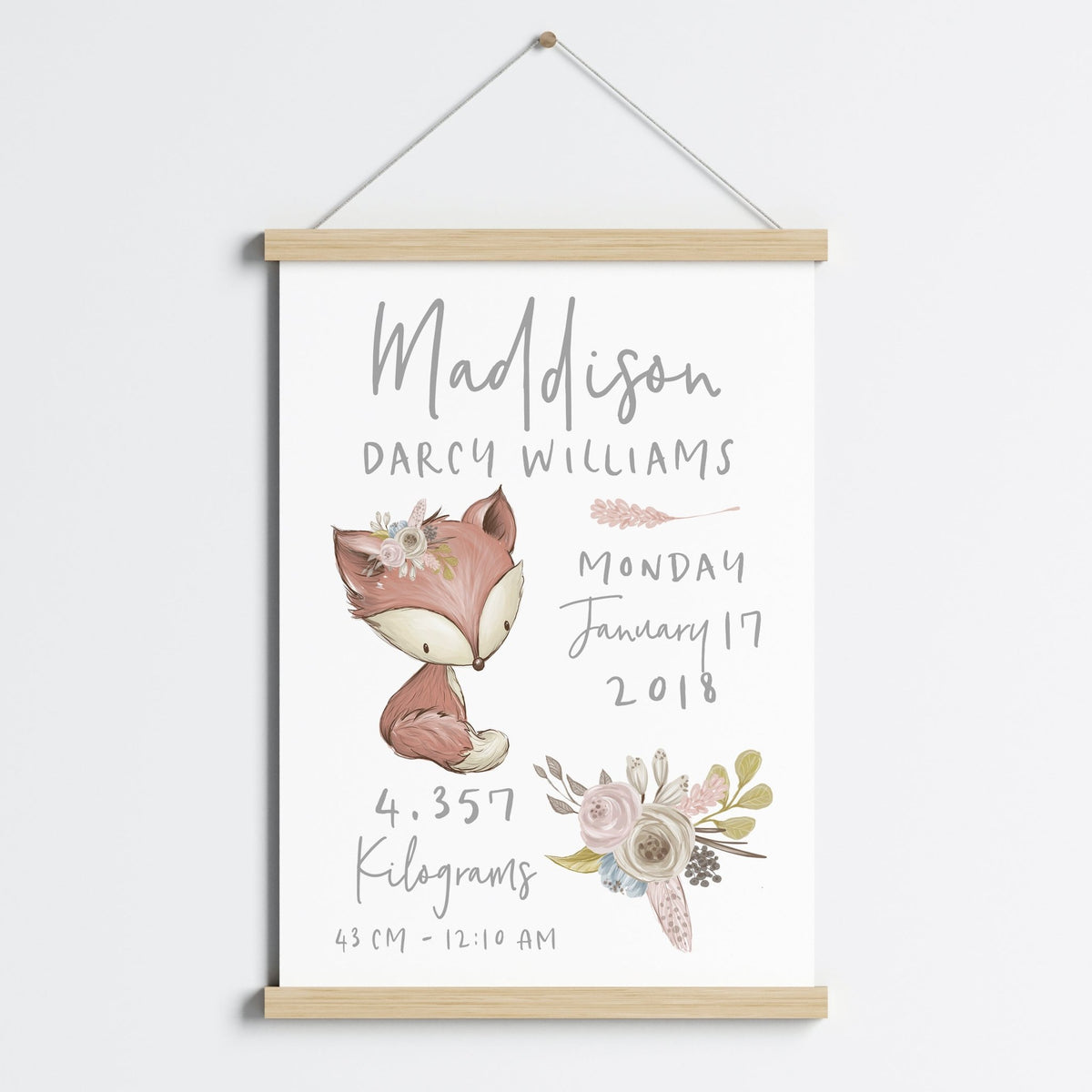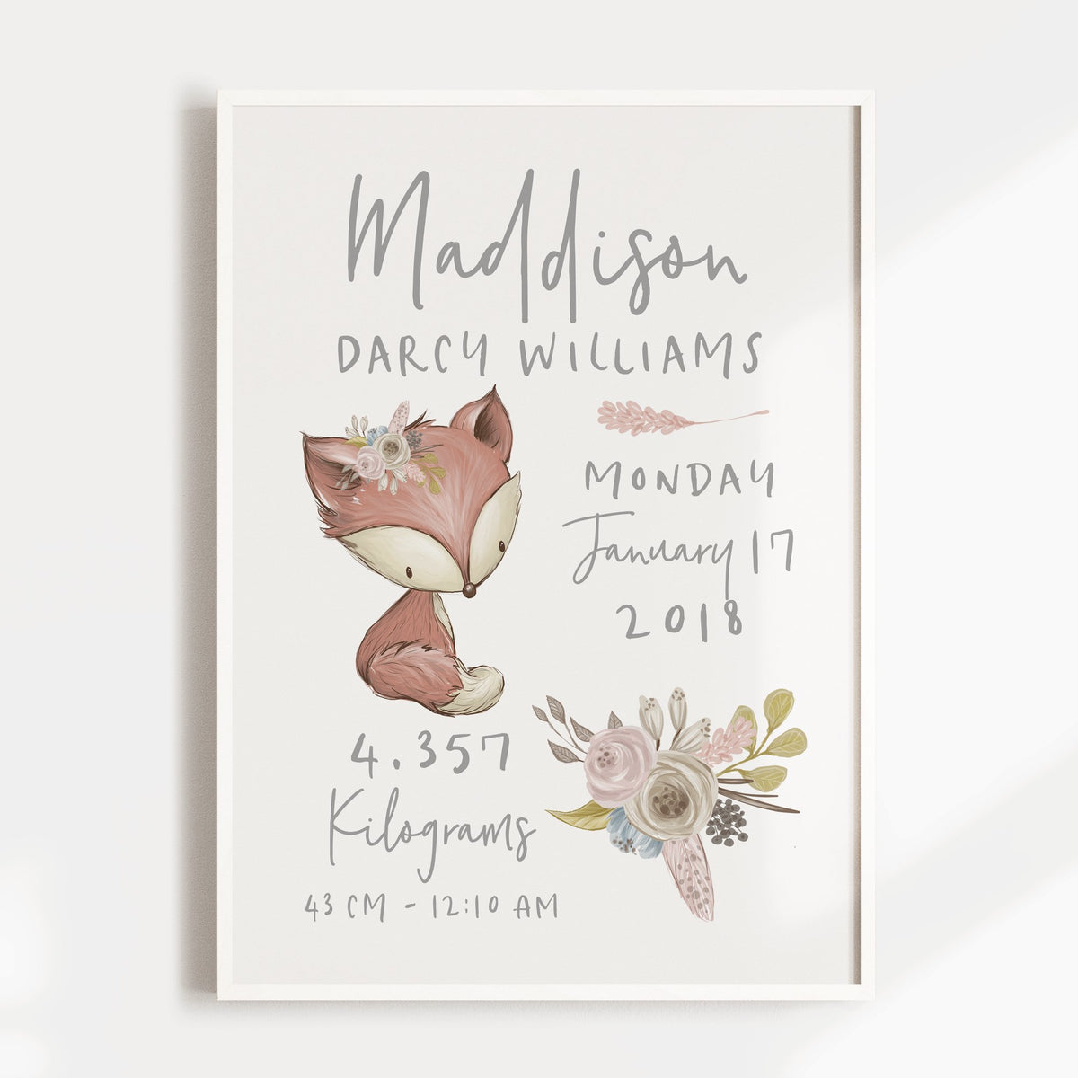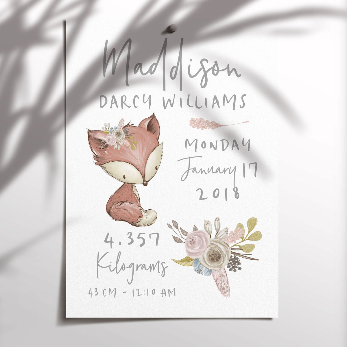Unit price perWelcome your little one with this Floral Woodland Fox Birth Print. Customizable with your baby's name, date of birth, and weight, this beautiful piece of nursery art features a detail of an illustrated fox, perfect for your little one's woodland themed bedroom.