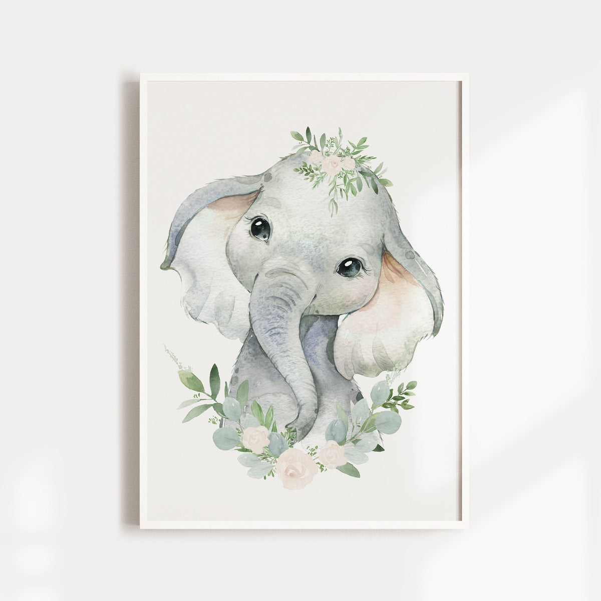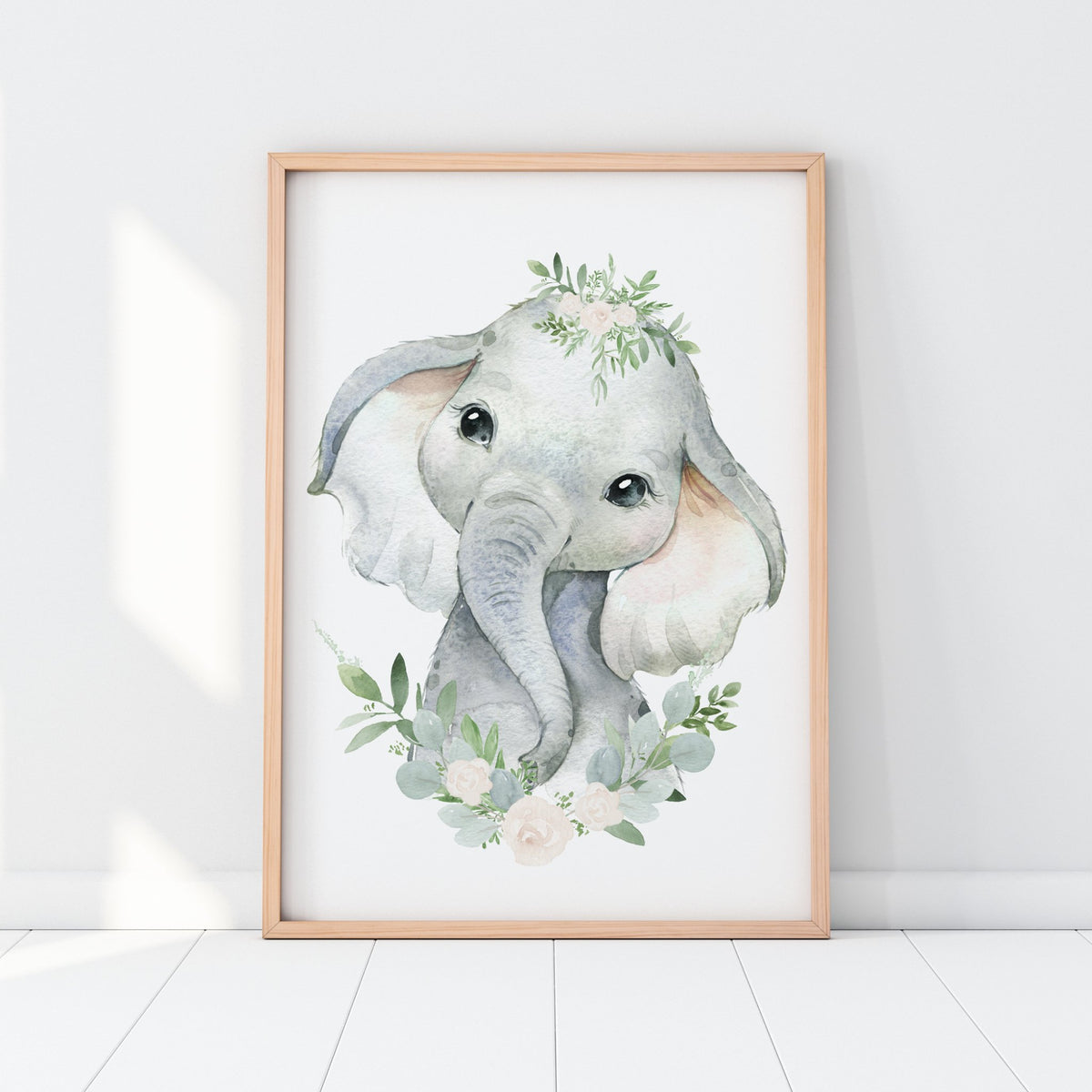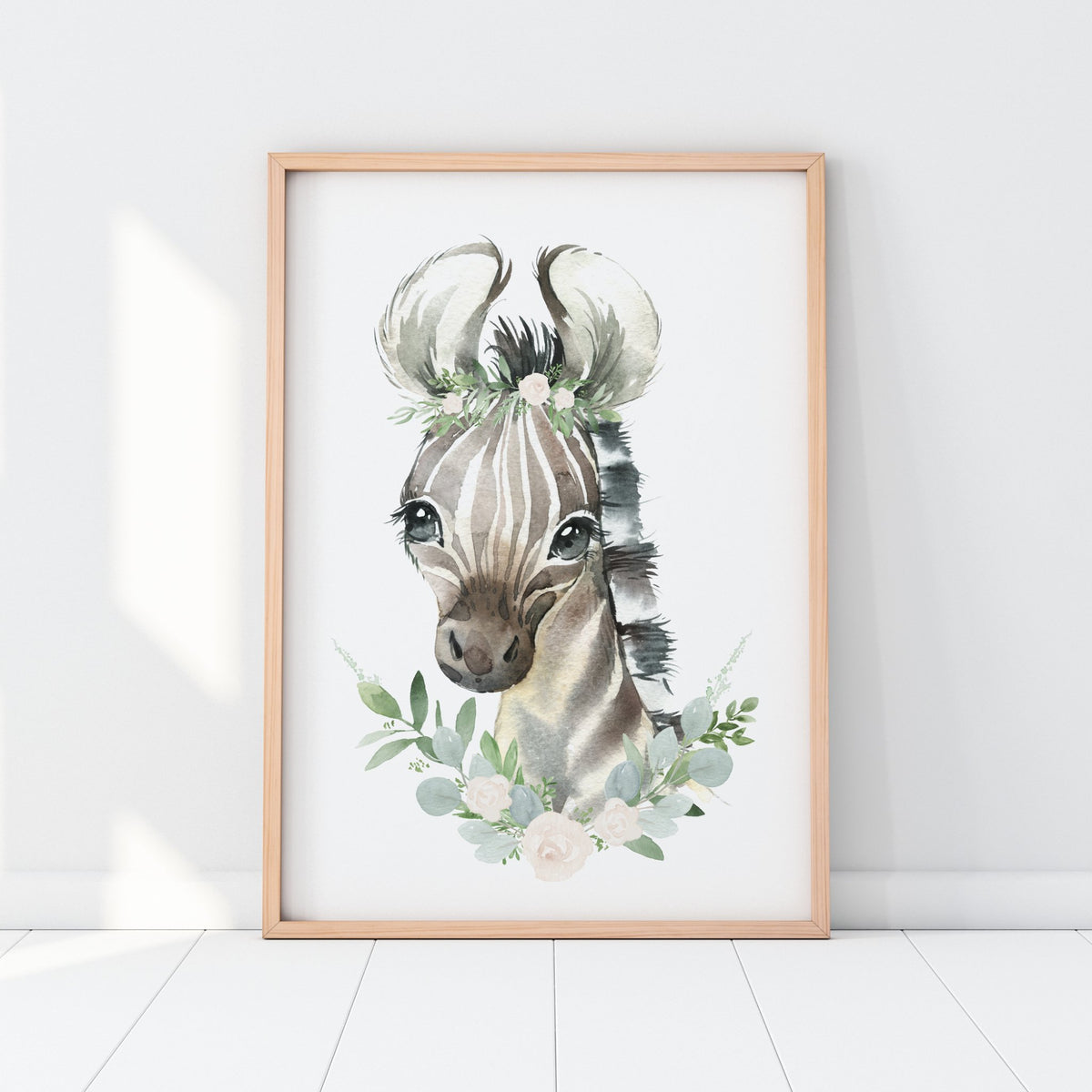 A woodland, safari nursery or bedroom wall art print set includes an elephant, zebra and lion print.