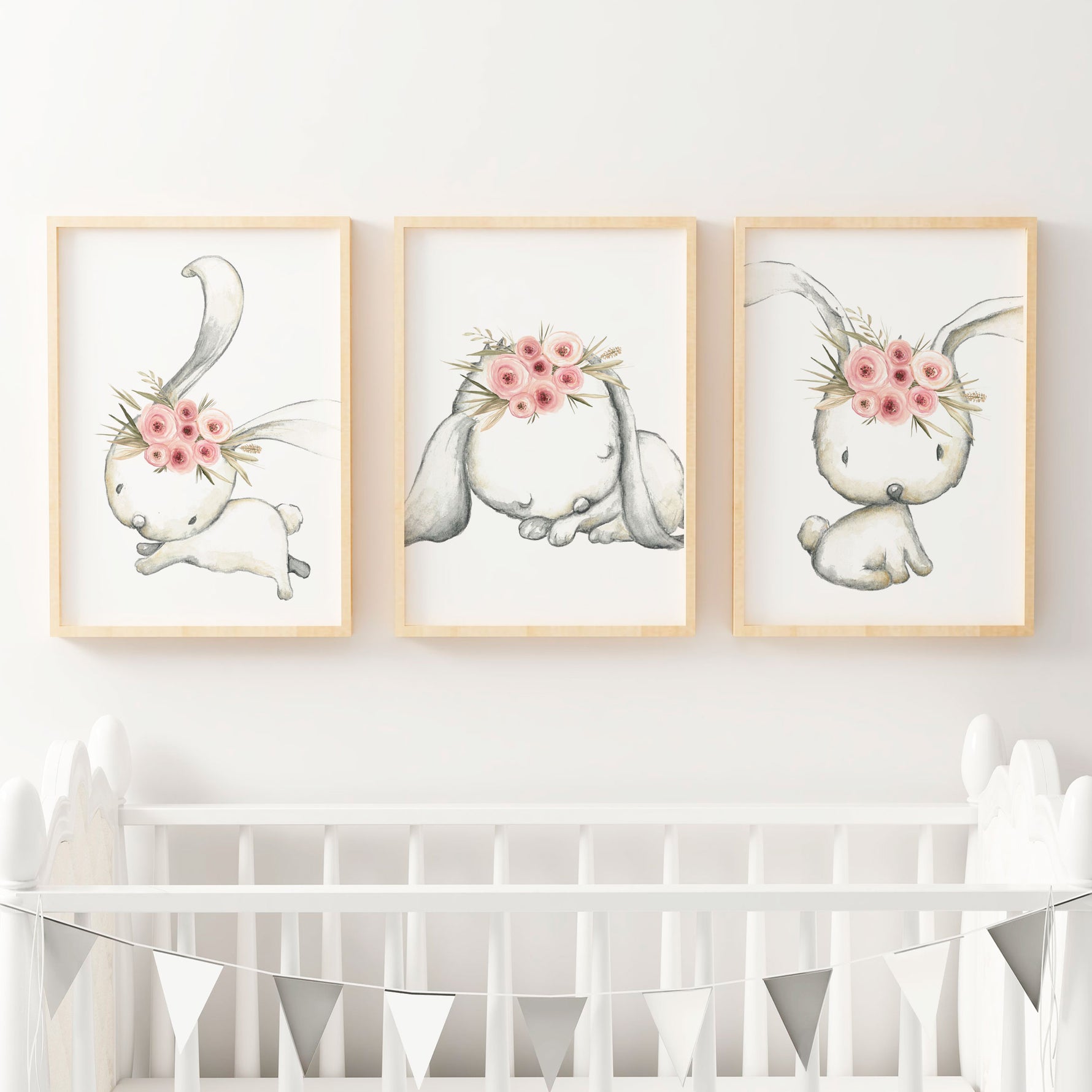 A set of three prints featuring a hopping, sitting & sleeping boho woodland bunny, all complimented with pink floral accents.