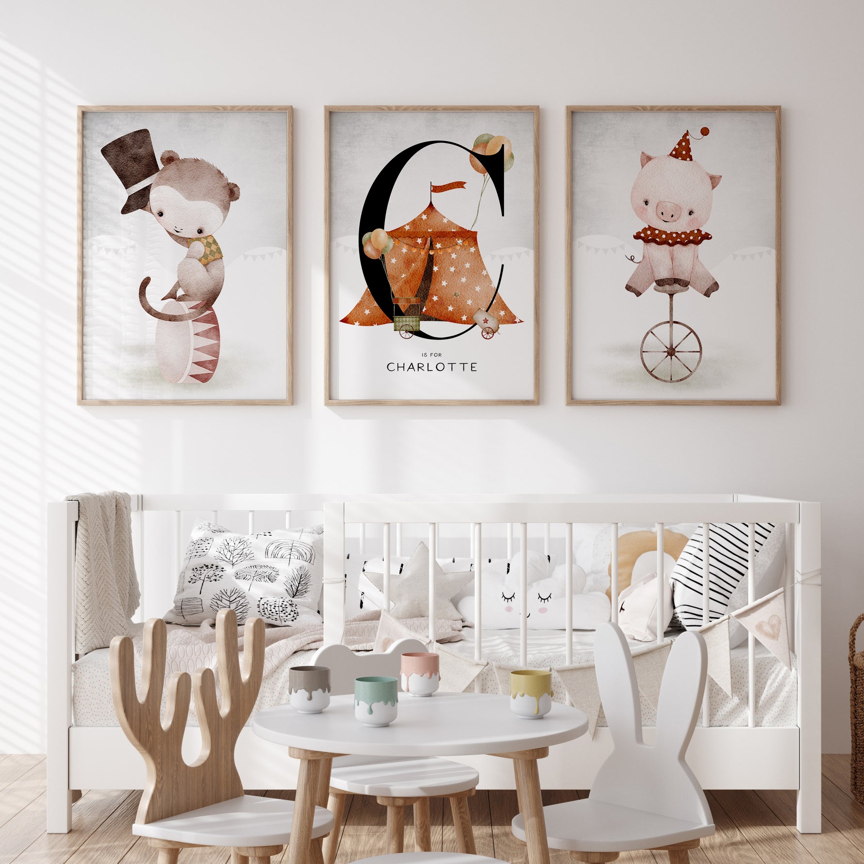 Unit price perA set of three circus themed prints, that includes a personalised name print and your choice of 2 animal prints. A perfect new baby gift or add the finishing touches your own little one's circus themed nursery, bedroom or playroom decor.