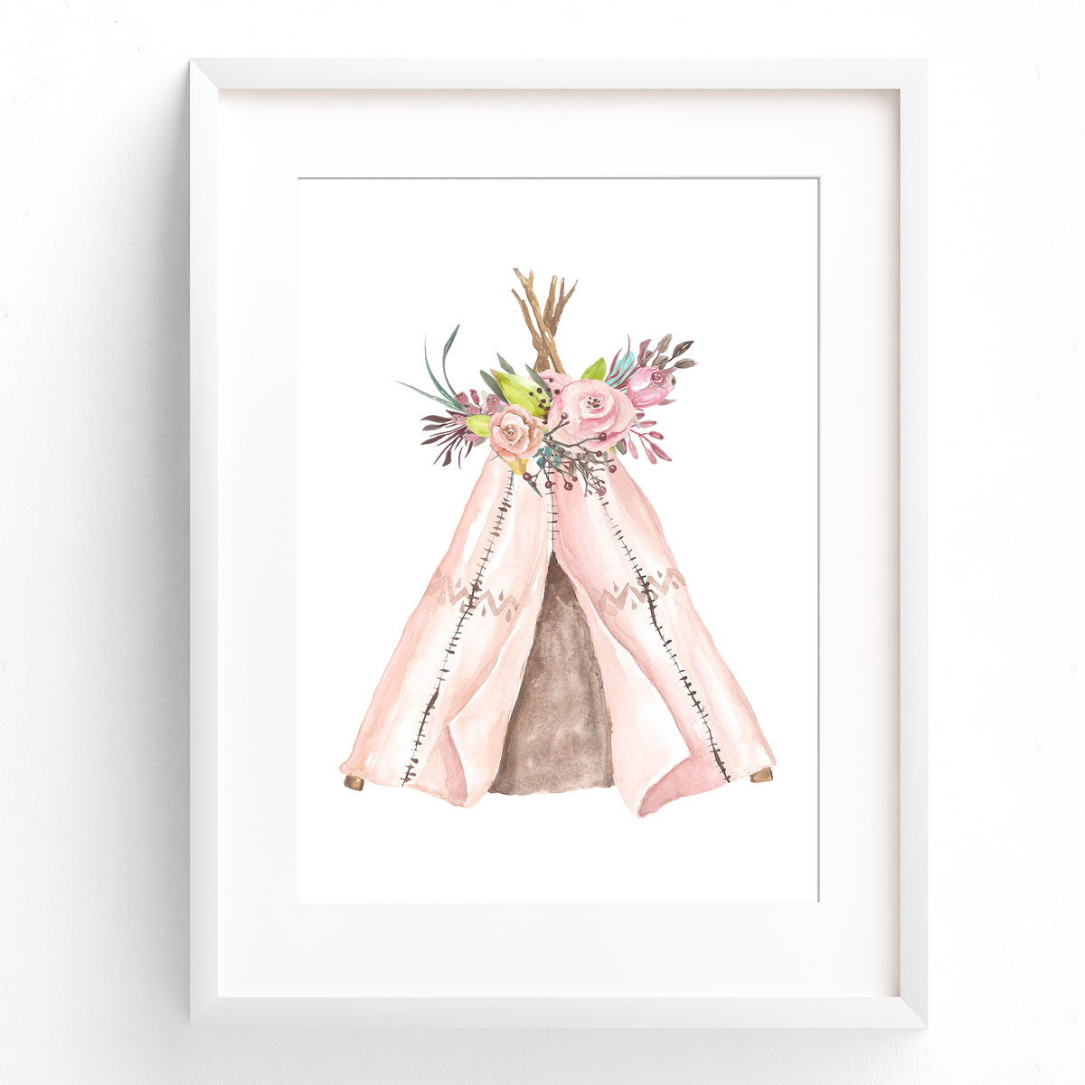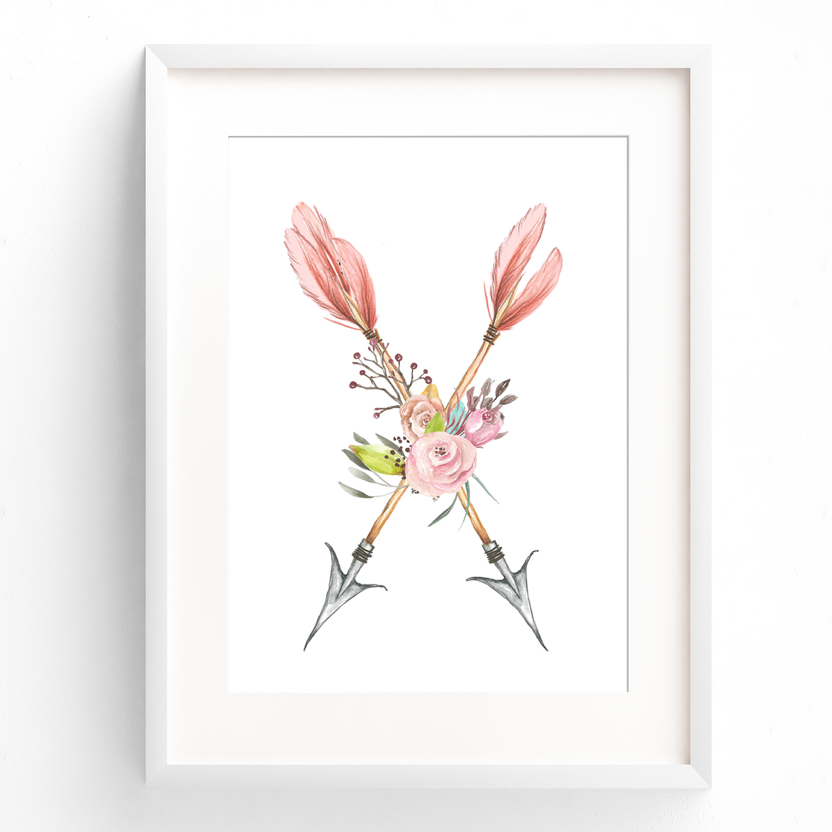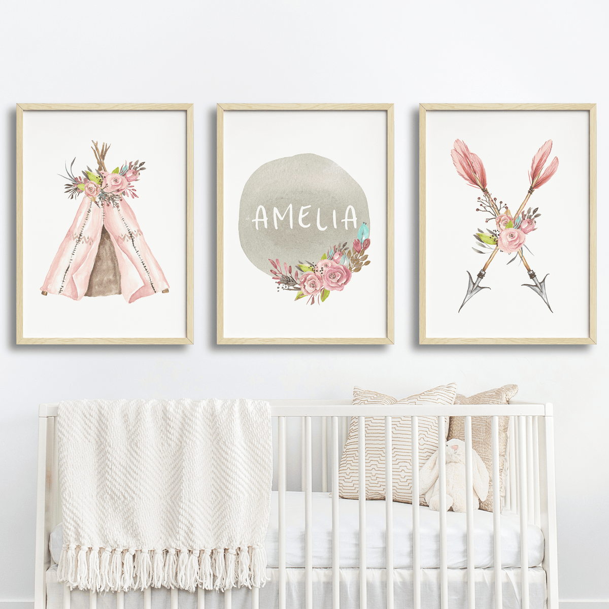 Featuring soft hints of watercolour pinks and greys, this tribal boho  nursery or bedroom wall art print set includes a floral crossed arrow print, a whimsical teepee and a personalised name print.