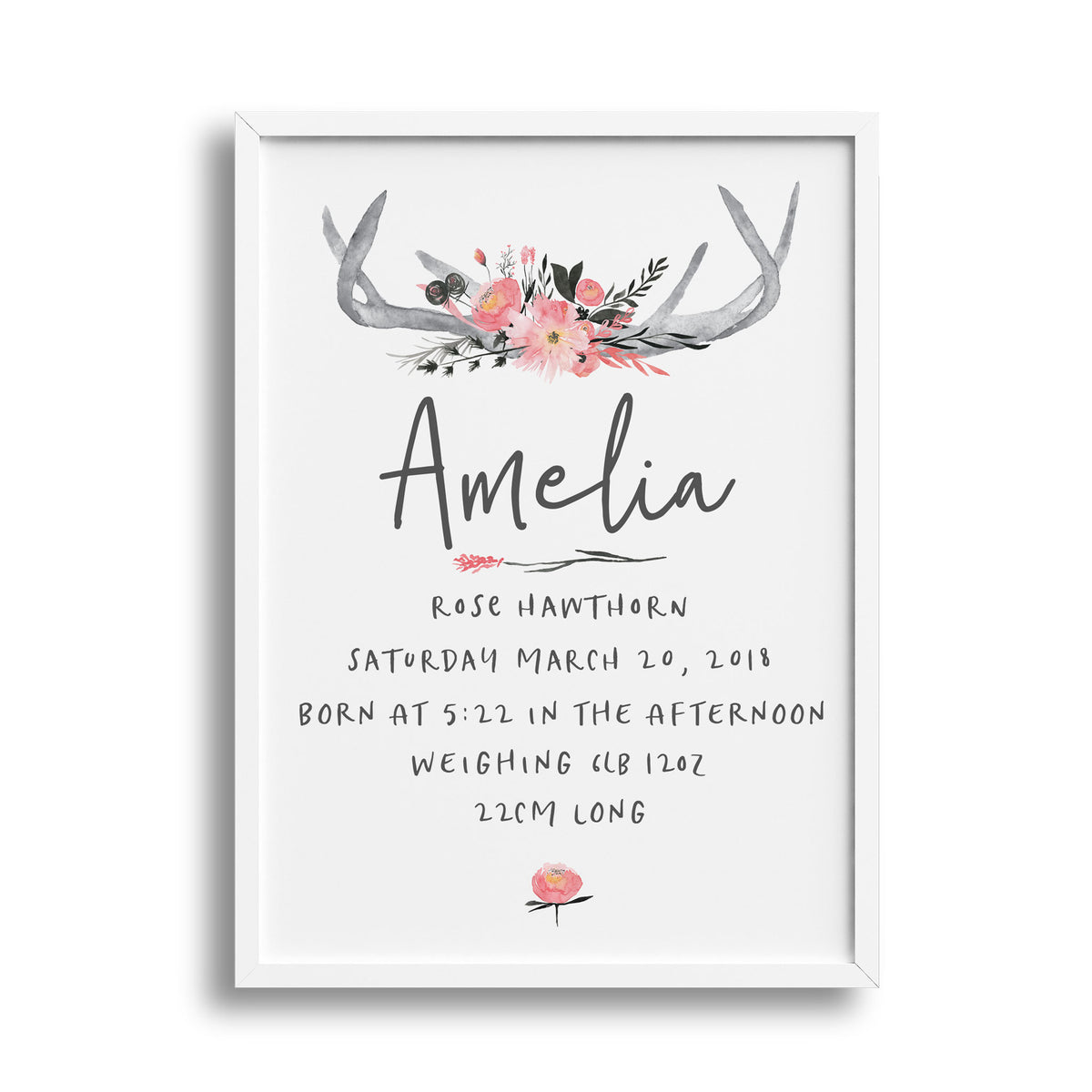 This set of three prints features a customised birth print, a woodland deer print and customised letter print, all complimented with floral accents.