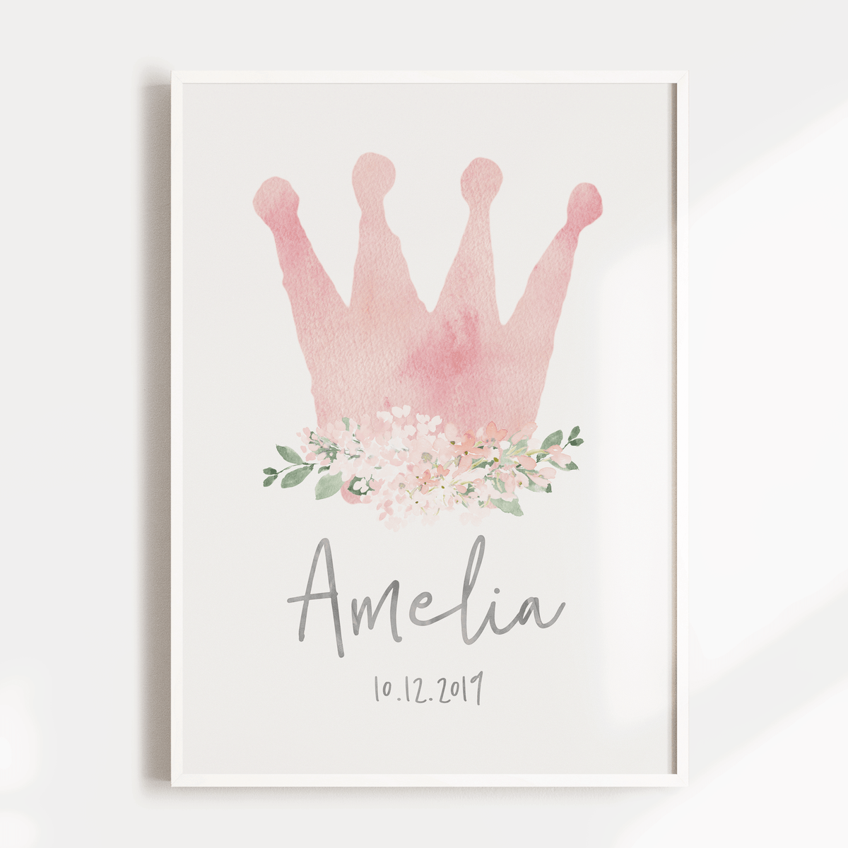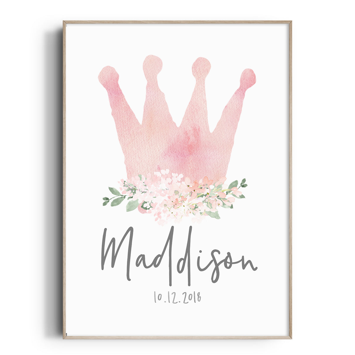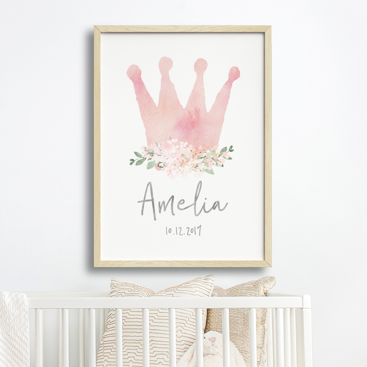 A pink watercolour crown wall art print personalised with your child's name and birth date.