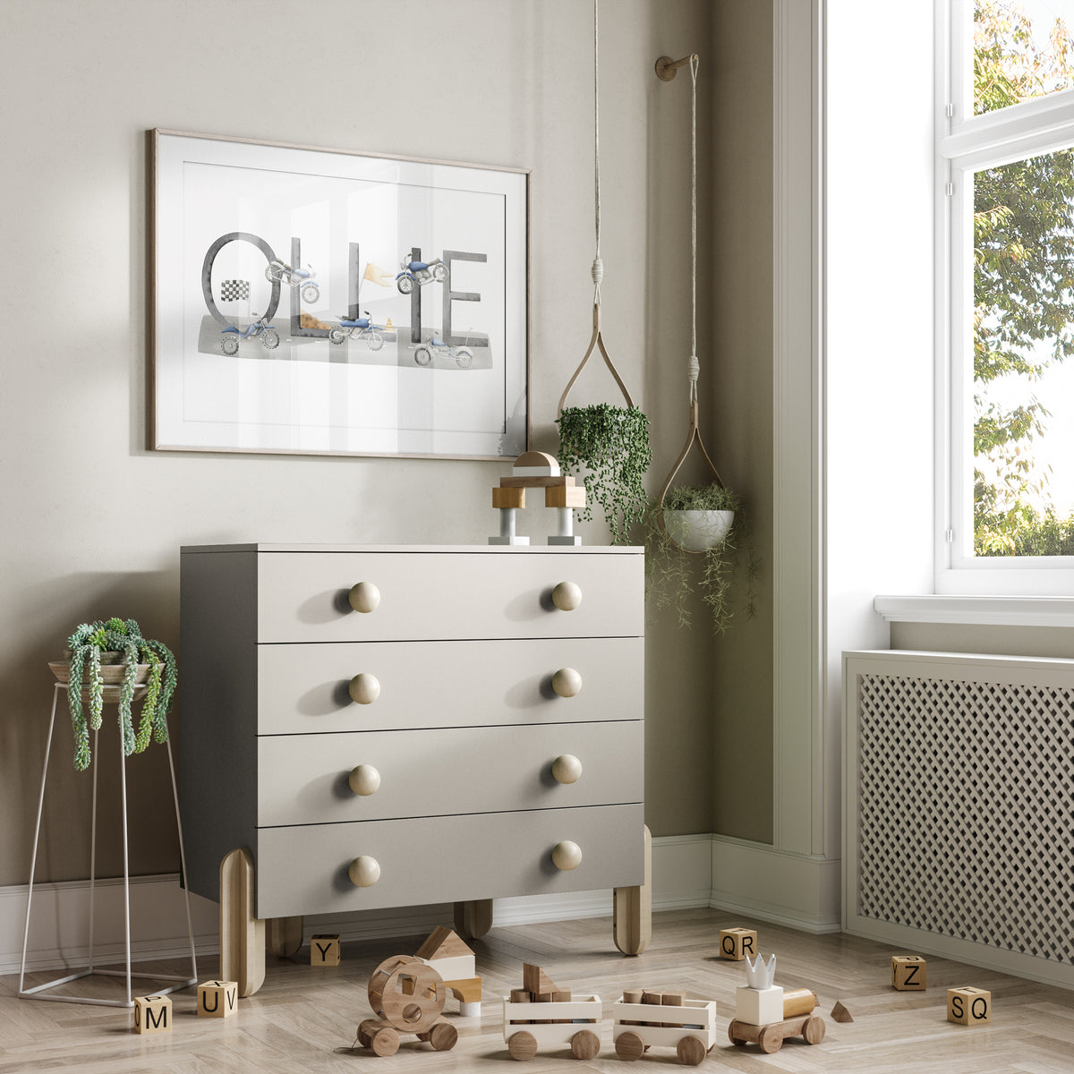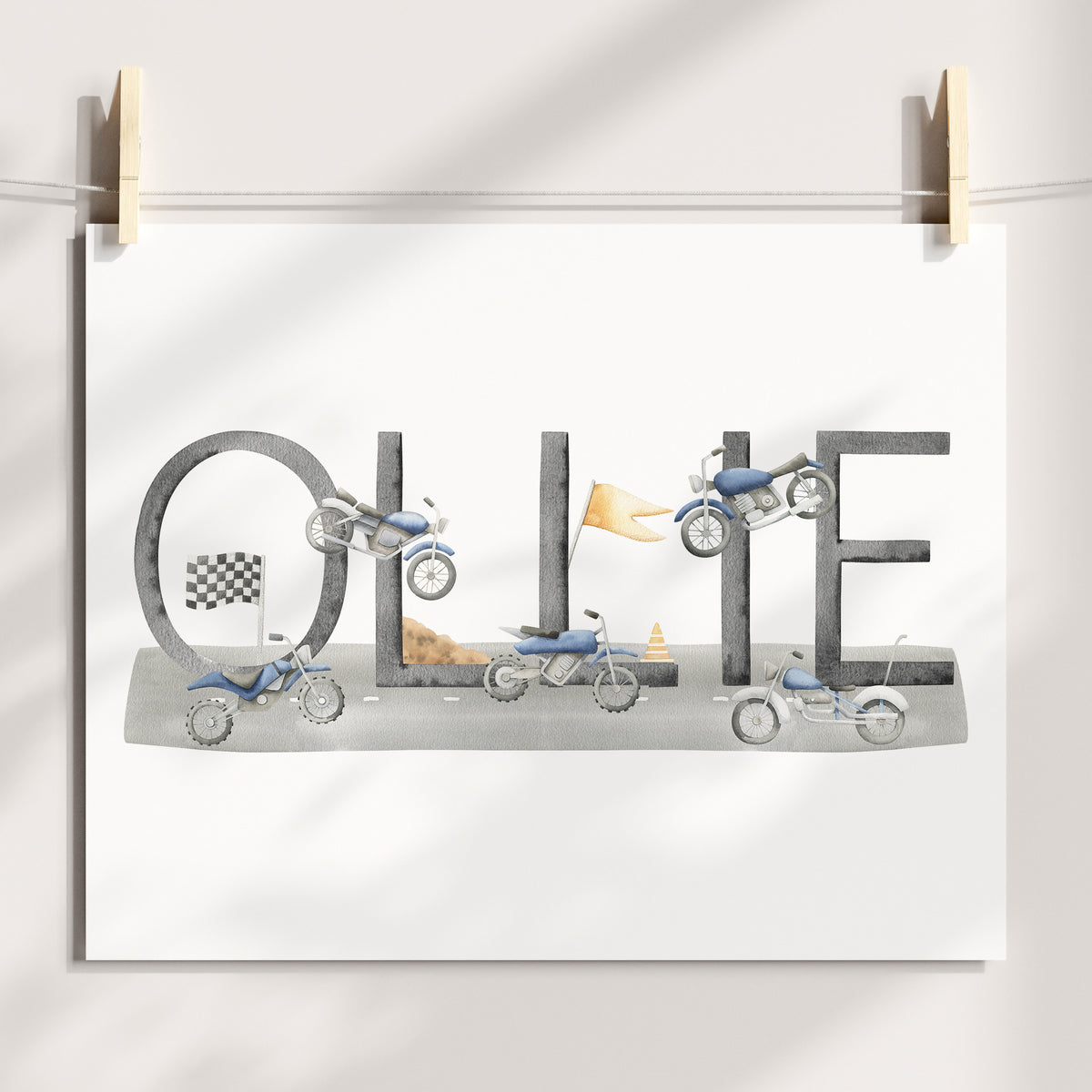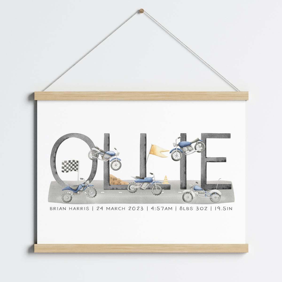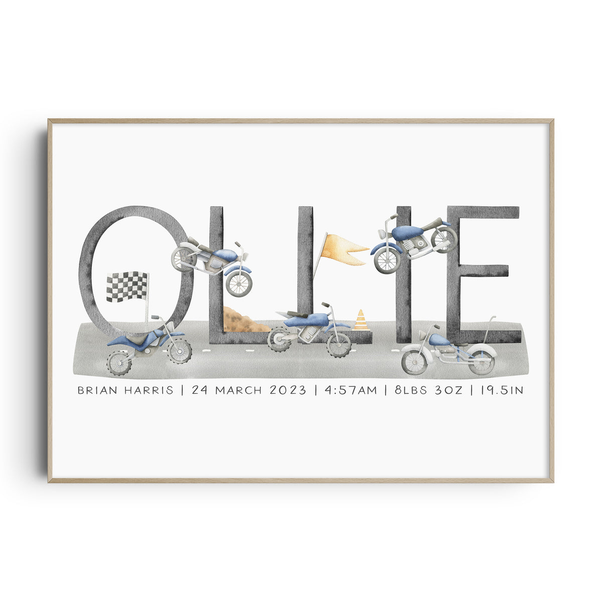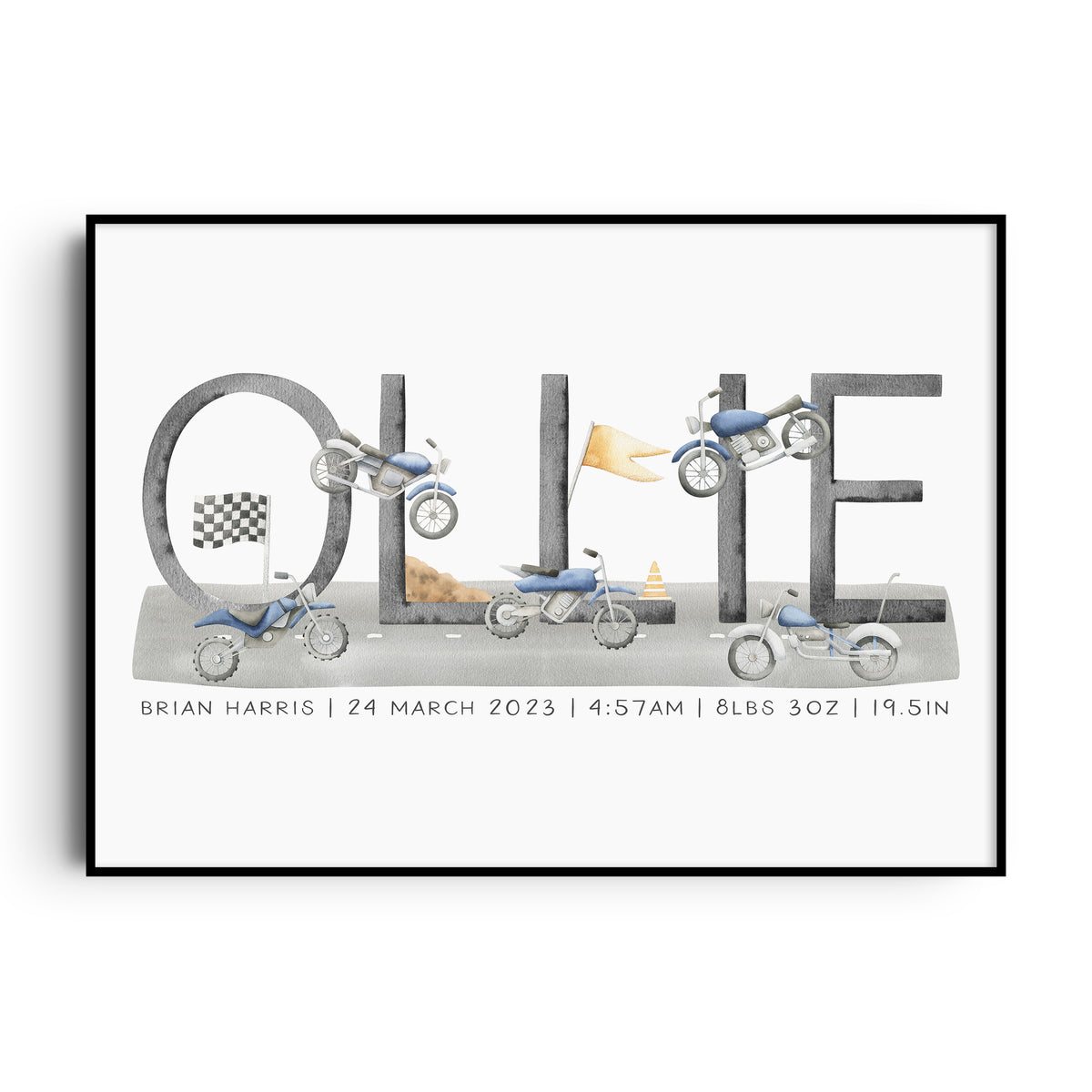 Perfect for the transportation or motorbike themed nursery, bedroom or playroom this personalised name print makes a great new baby gift or add the finishing to touches to your own little boy's space.
