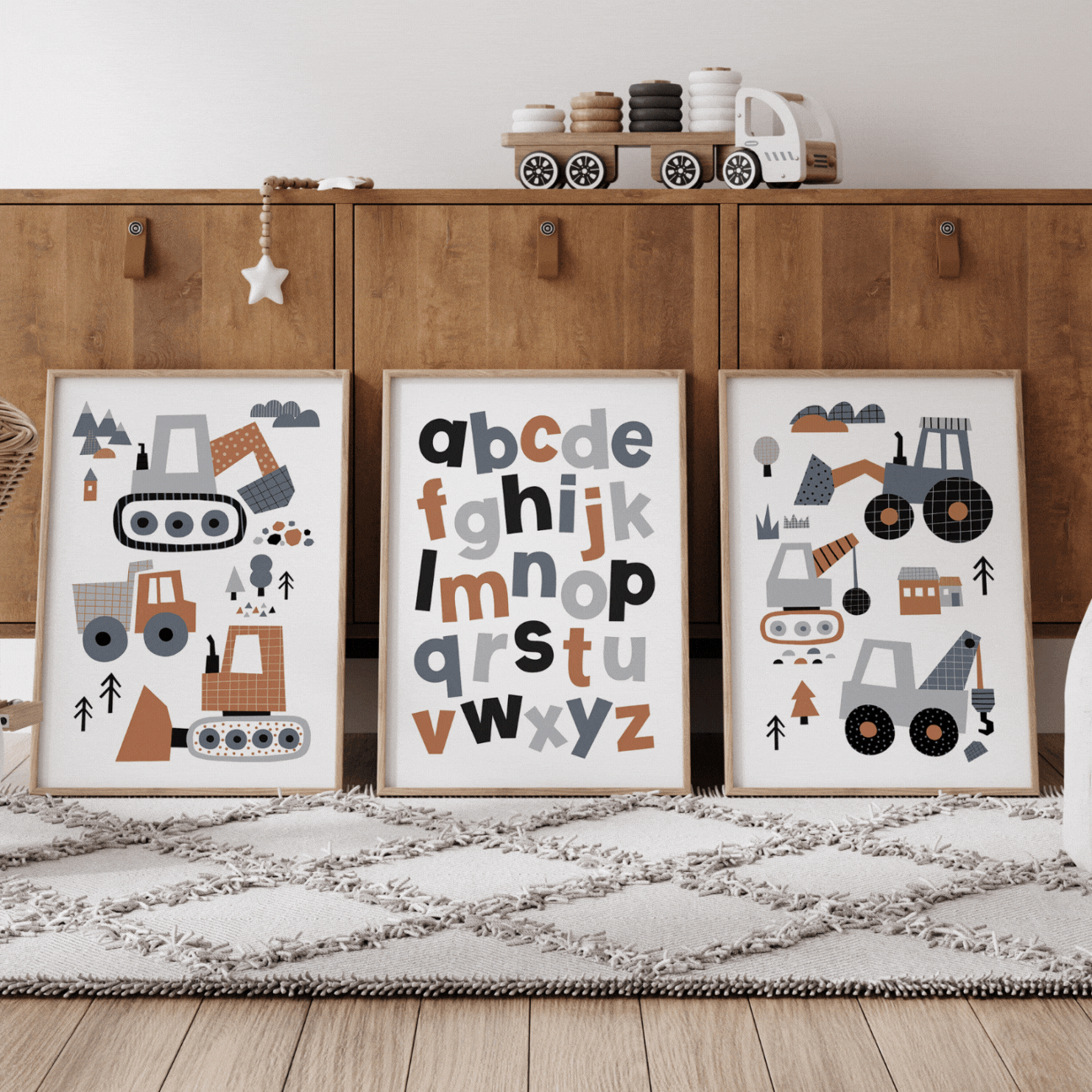 A set of three prints featuring construction trucks and an alphabet print in your choice of colour. A perfect new baby boy gift, or a great way to add the finishing touches to your own child's nursery, playroom or bedroom space.