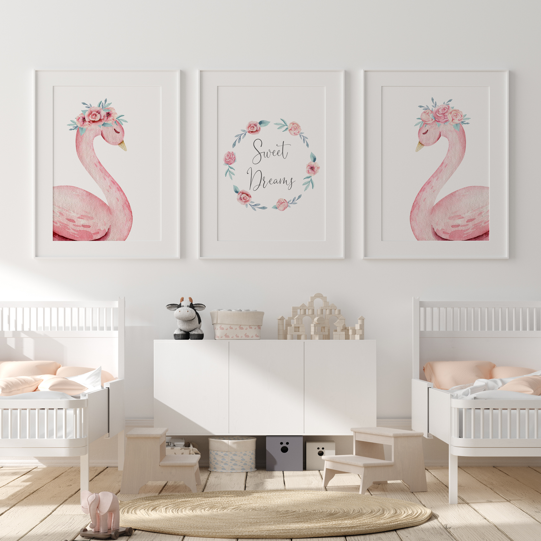 A set of 3 prints including two pink watercolour swans and a complimentary floral wreath 'sweet dreams' print.