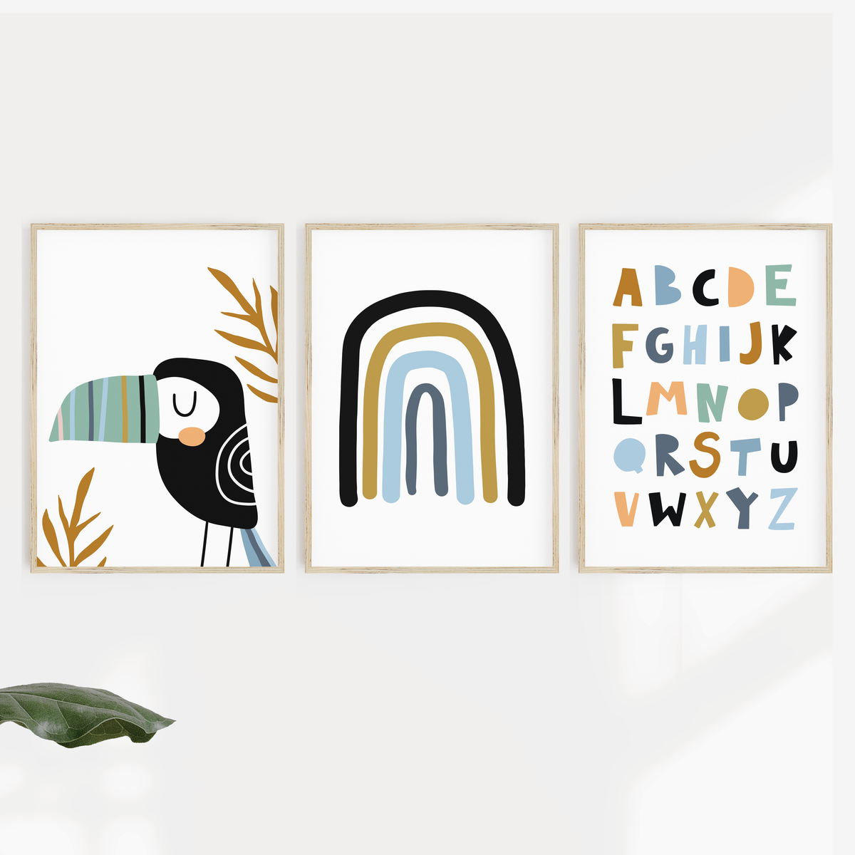 A set of three scandi, inspired kids nursery or bedroom wall art prints, featuring tropical toucan, rainbow and alphabet prints.
