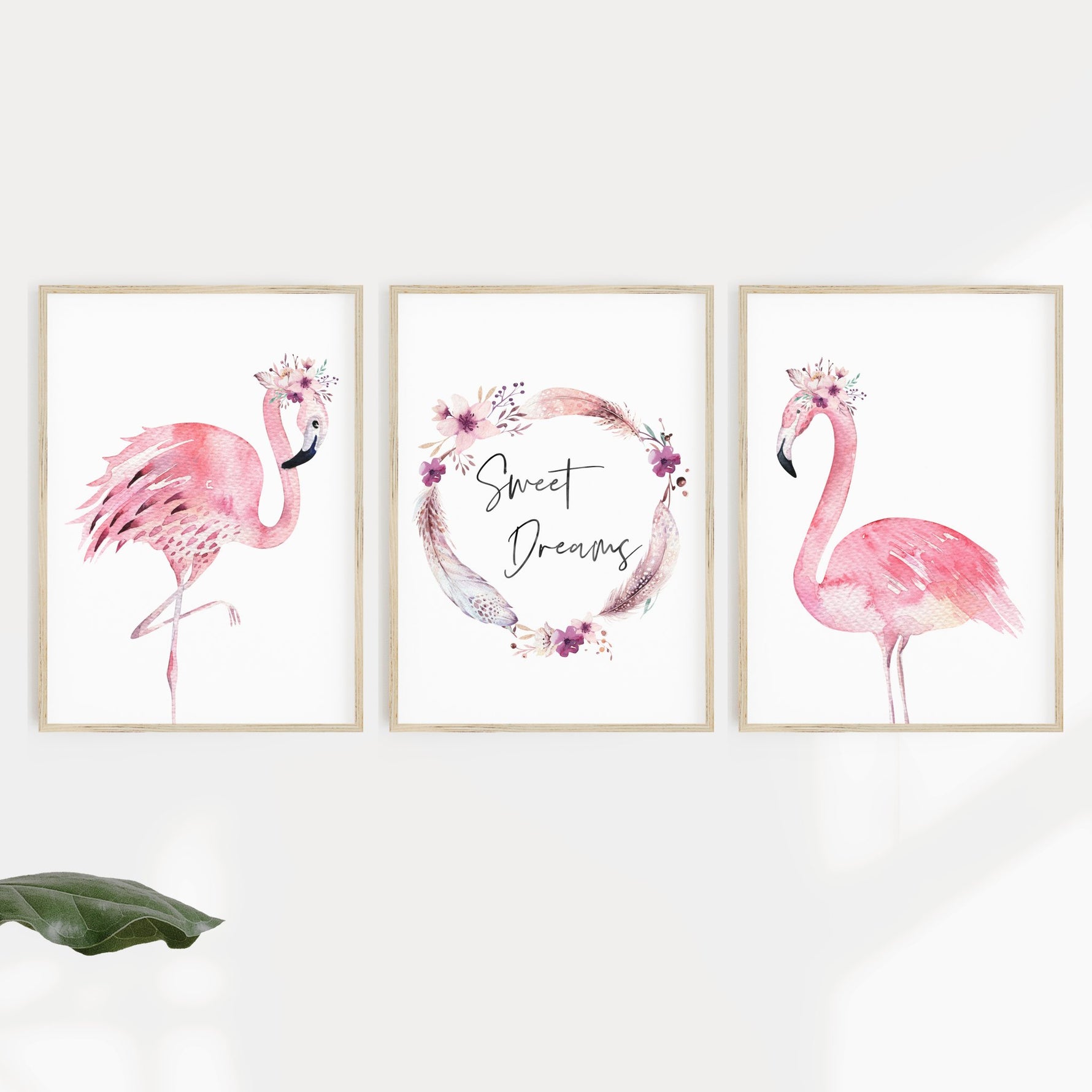 A beautiful addition to your child's nursery or bedroom is this set of 3 watercolour art prints, featuring two tropical flamingos with floral & greenery crowns and a floral wreath 'sweet dreams' print.