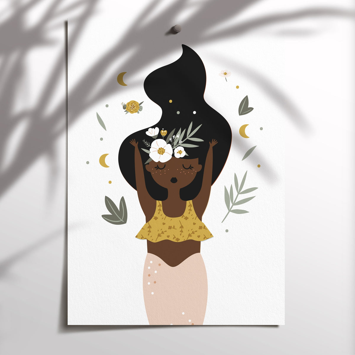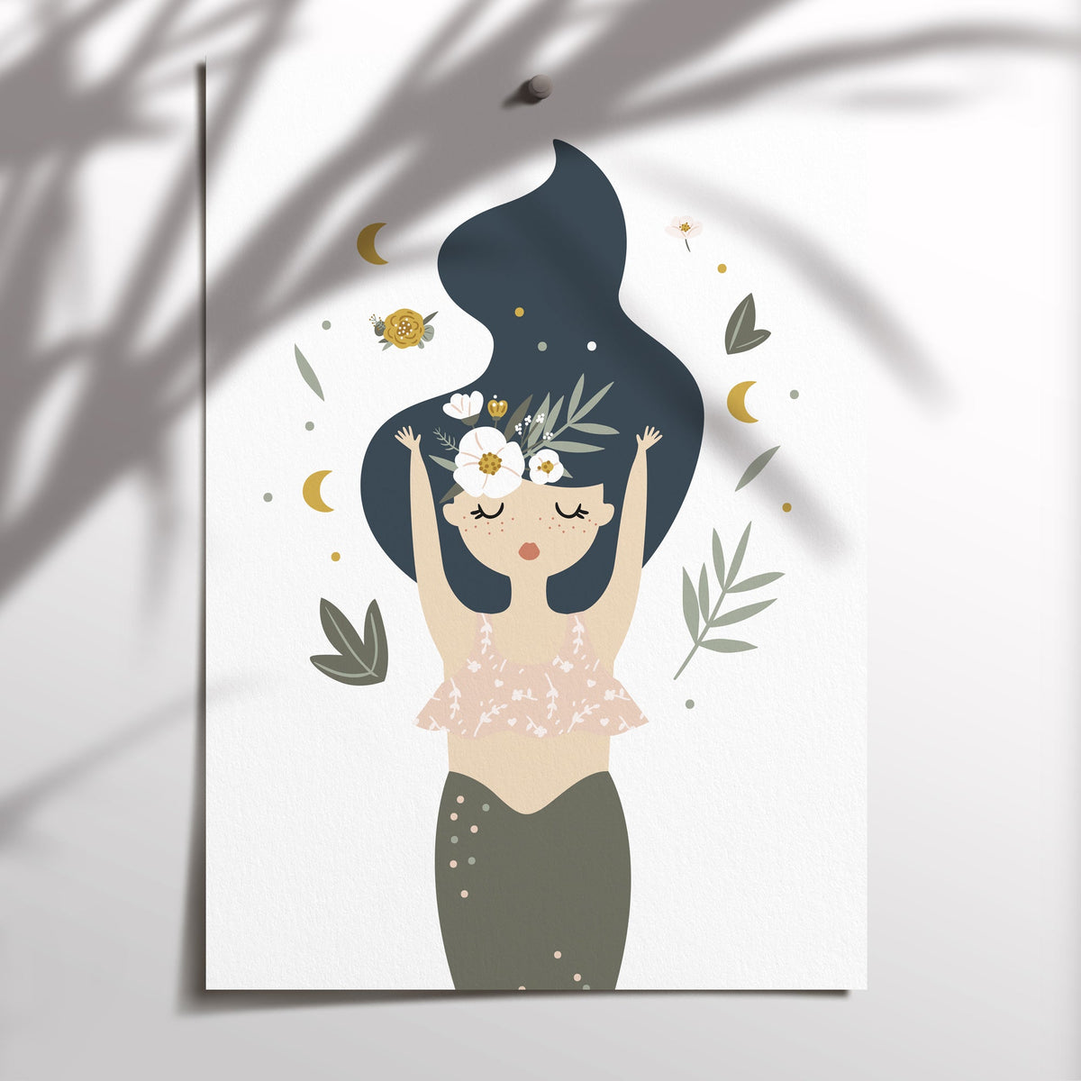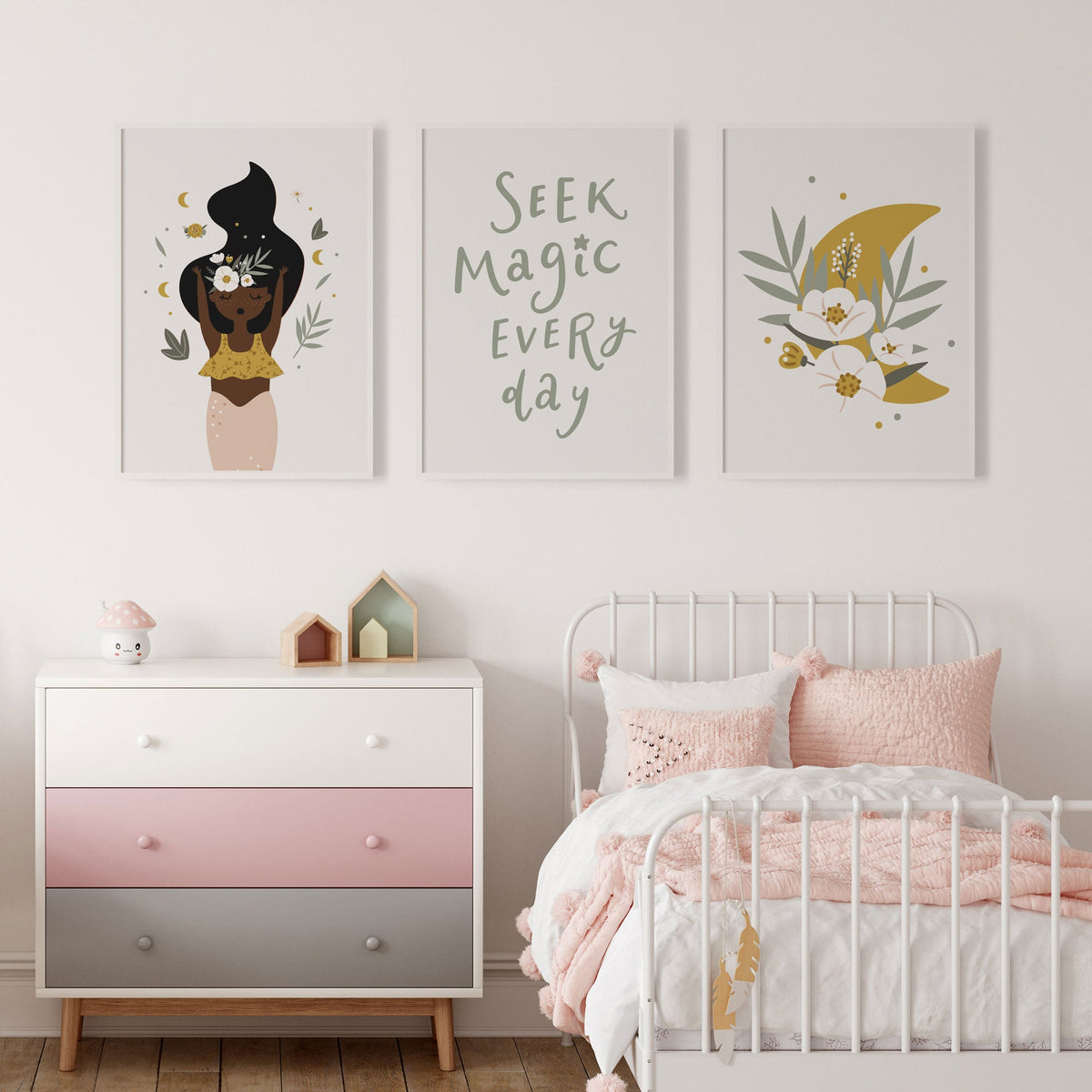 A beautiful addition to your child's nursery or bedroom is this set of 3 boho art prints, featuring a floral mermaid, moon & motivational quote print.