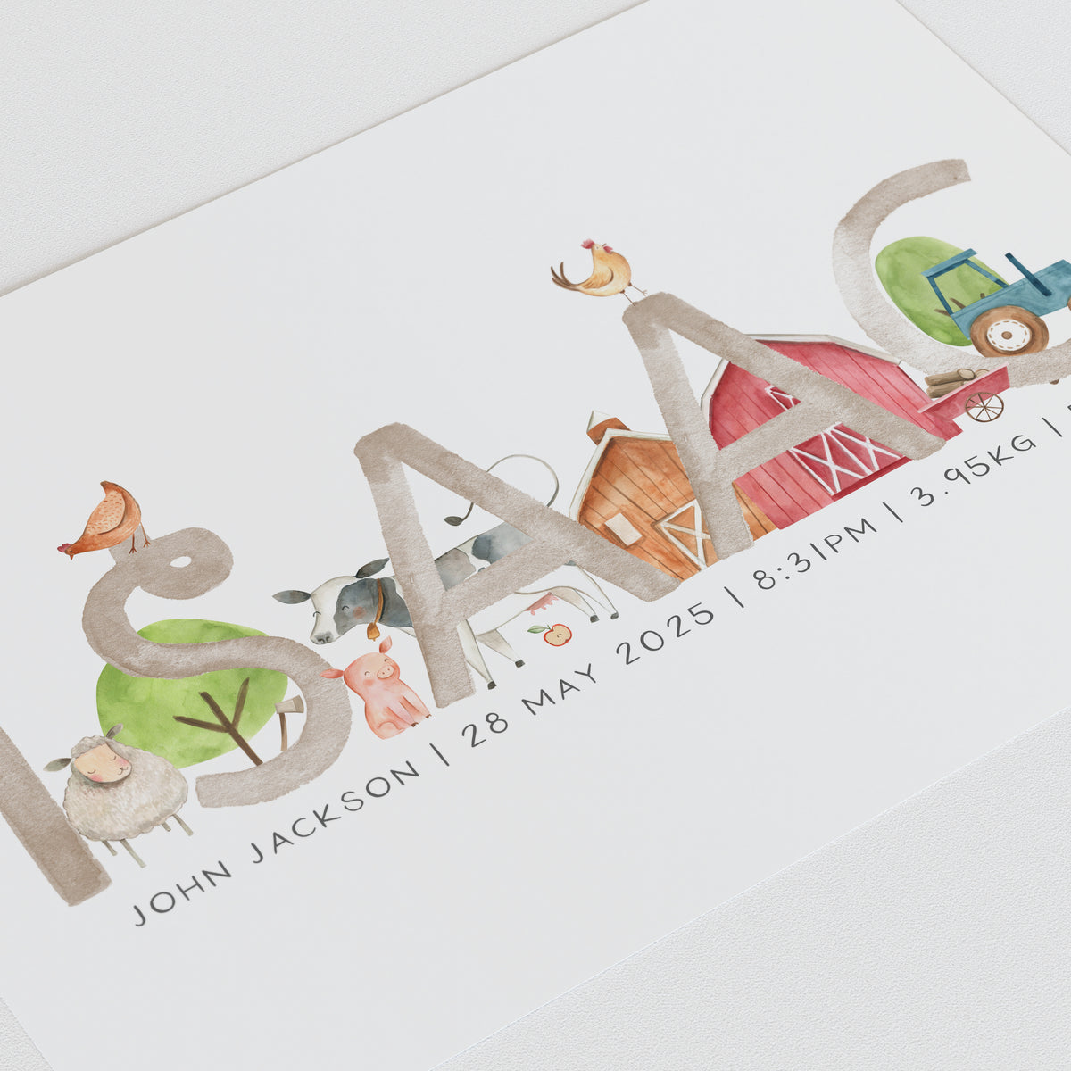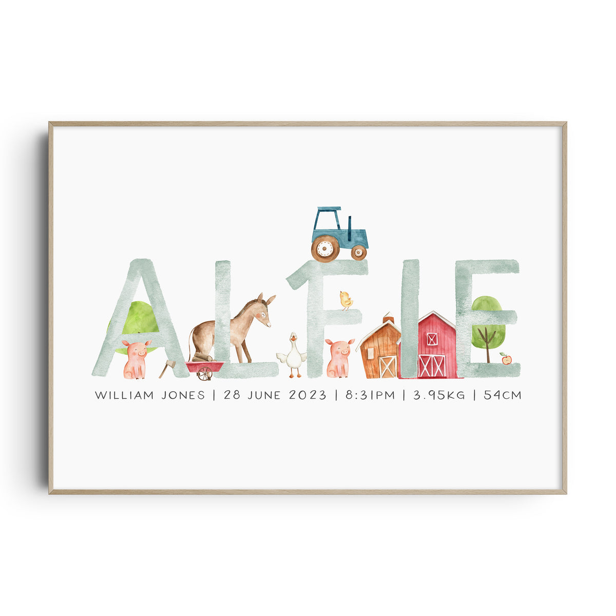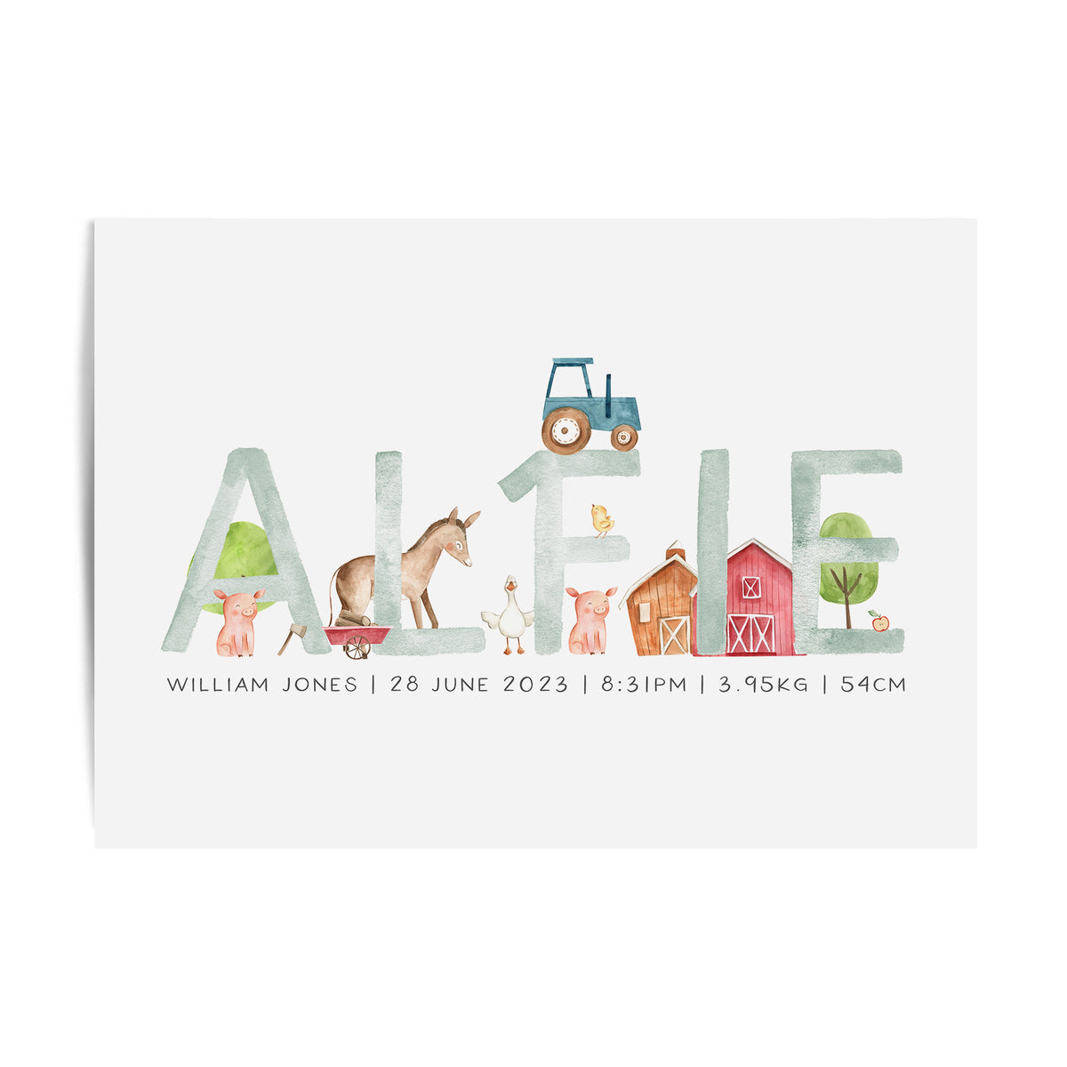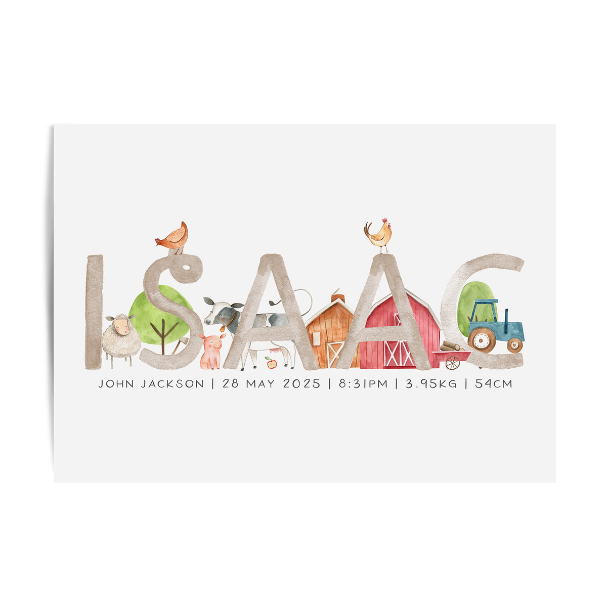 Perfect for the farm themed nursery, this personalised baby name print is available with the option to add your little one's birth details and your choice of animals, it makes a perfect new baby gift or add the finishing touches to your own little boy's room.