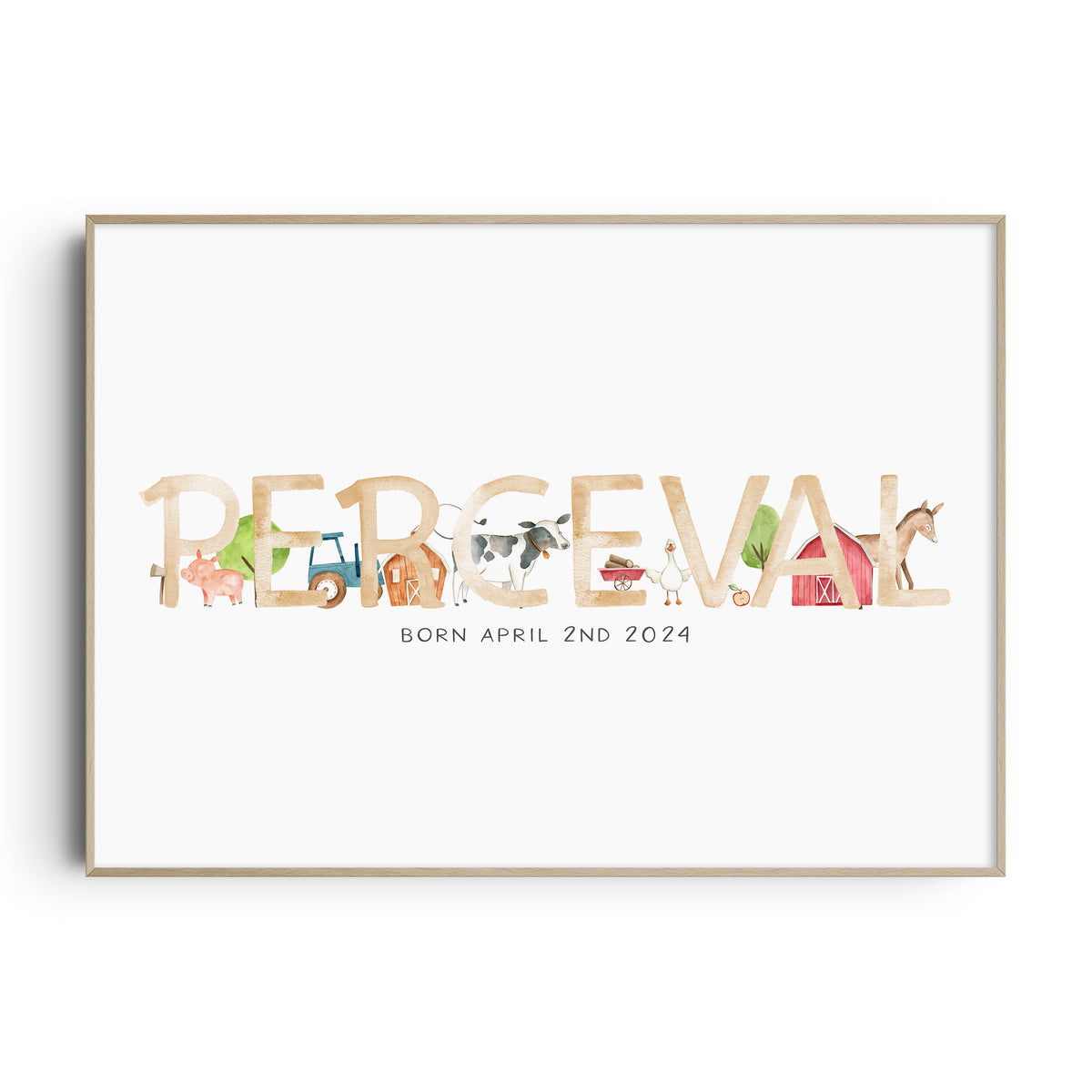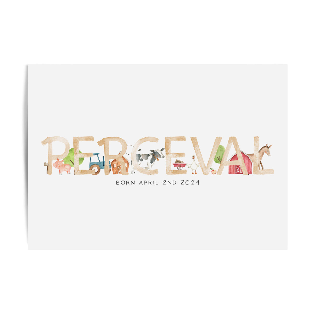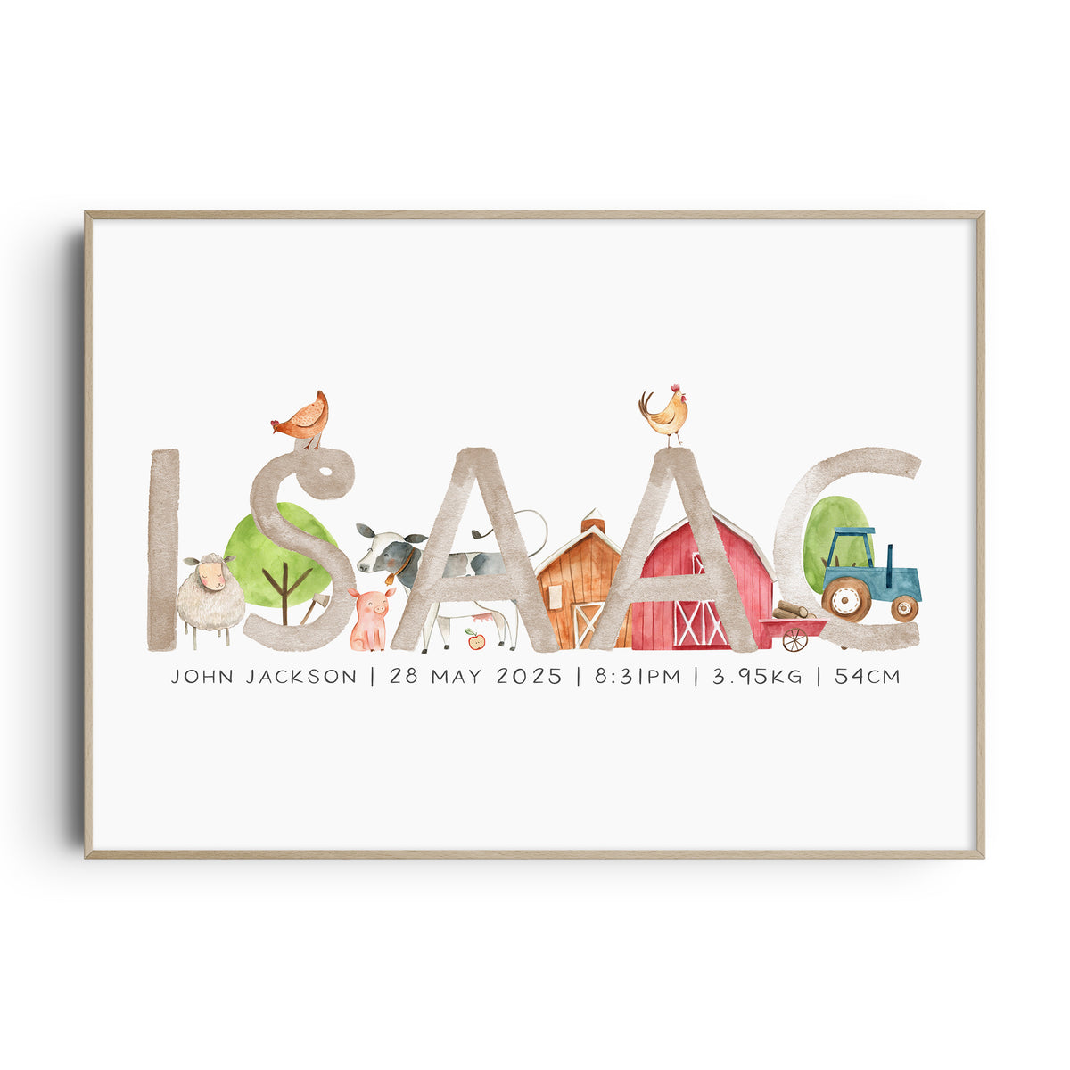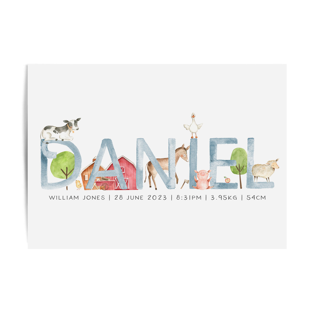 Perfect for the farm themed nursery, this personalised baby name print is available with the option to add your little one's birth details and your choice of animals, it makes a perfect new baby gift or add the finishing touches to your own little boy's room.