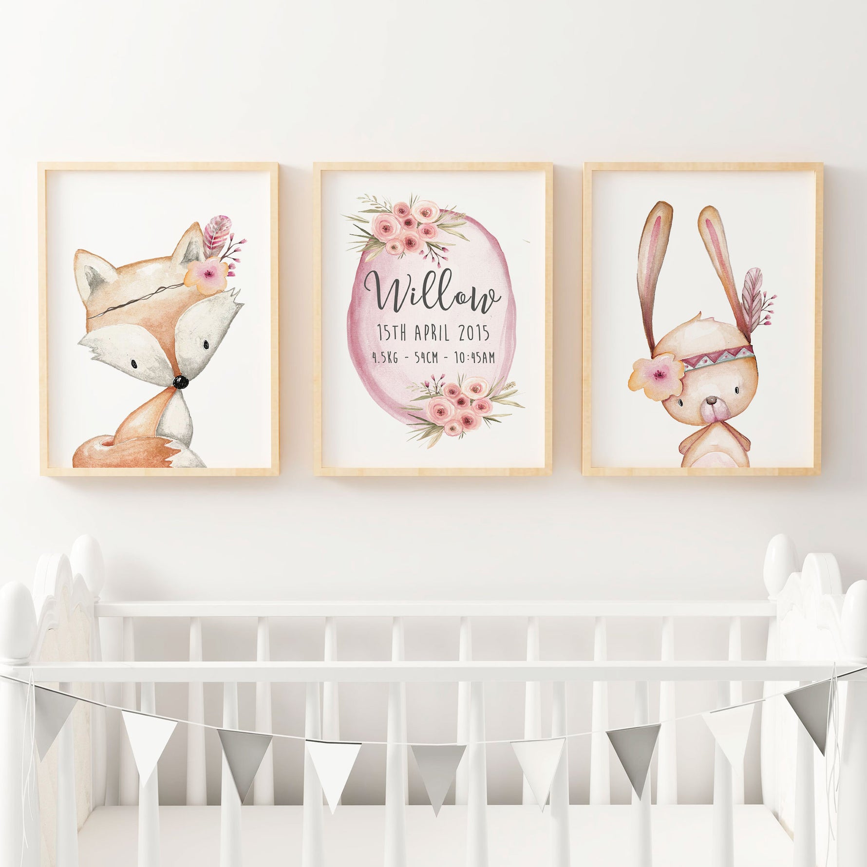 This set of three prints features a customised birth print and two boho woodland animal prints, all complimented with floral & feather accents.