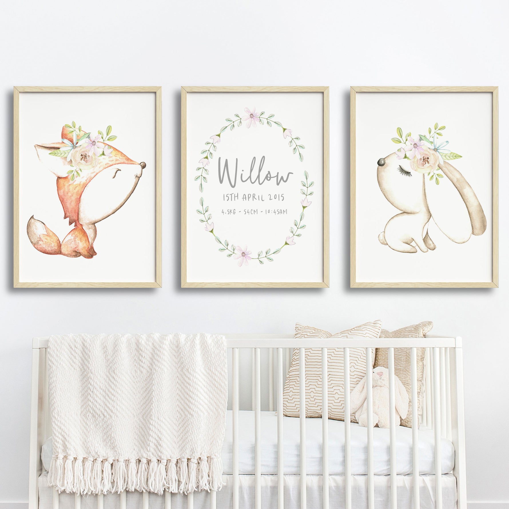 This set of three prints features a customised birth print and two boho woodland animal prints, all complimented with floral & feather accents.