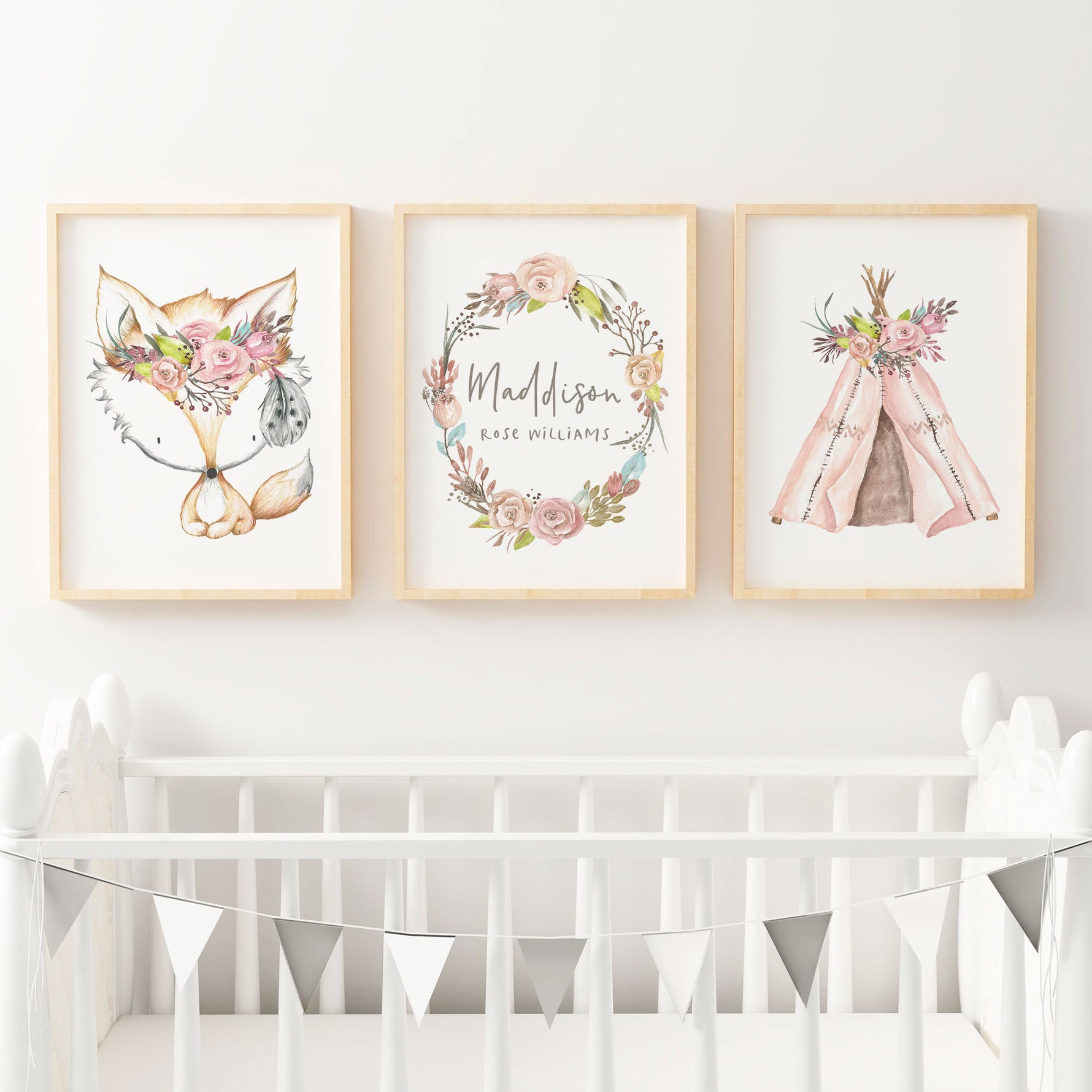 Featuring soft hints of watercolour pinks, this tribal boho woodland nursery or bedroom wall art print set includes a floral fox print, a woodland teepee and a personalised floral wreath name print.
