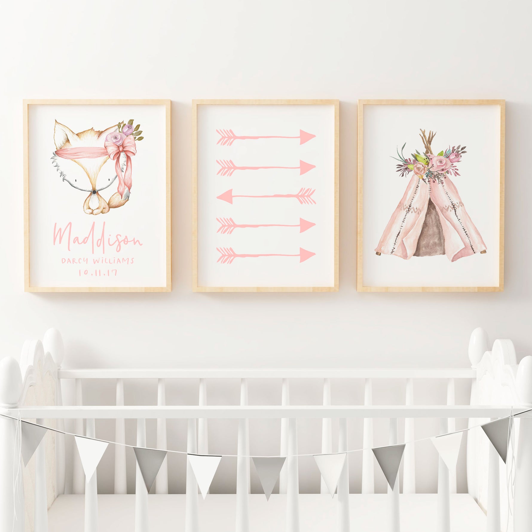 Featuring soft hints of watercolour pinks, this tribal boho woodland nursery or bedroom wall art print set includes a floral teepee print, pink arrows and a personalised fox birth print.