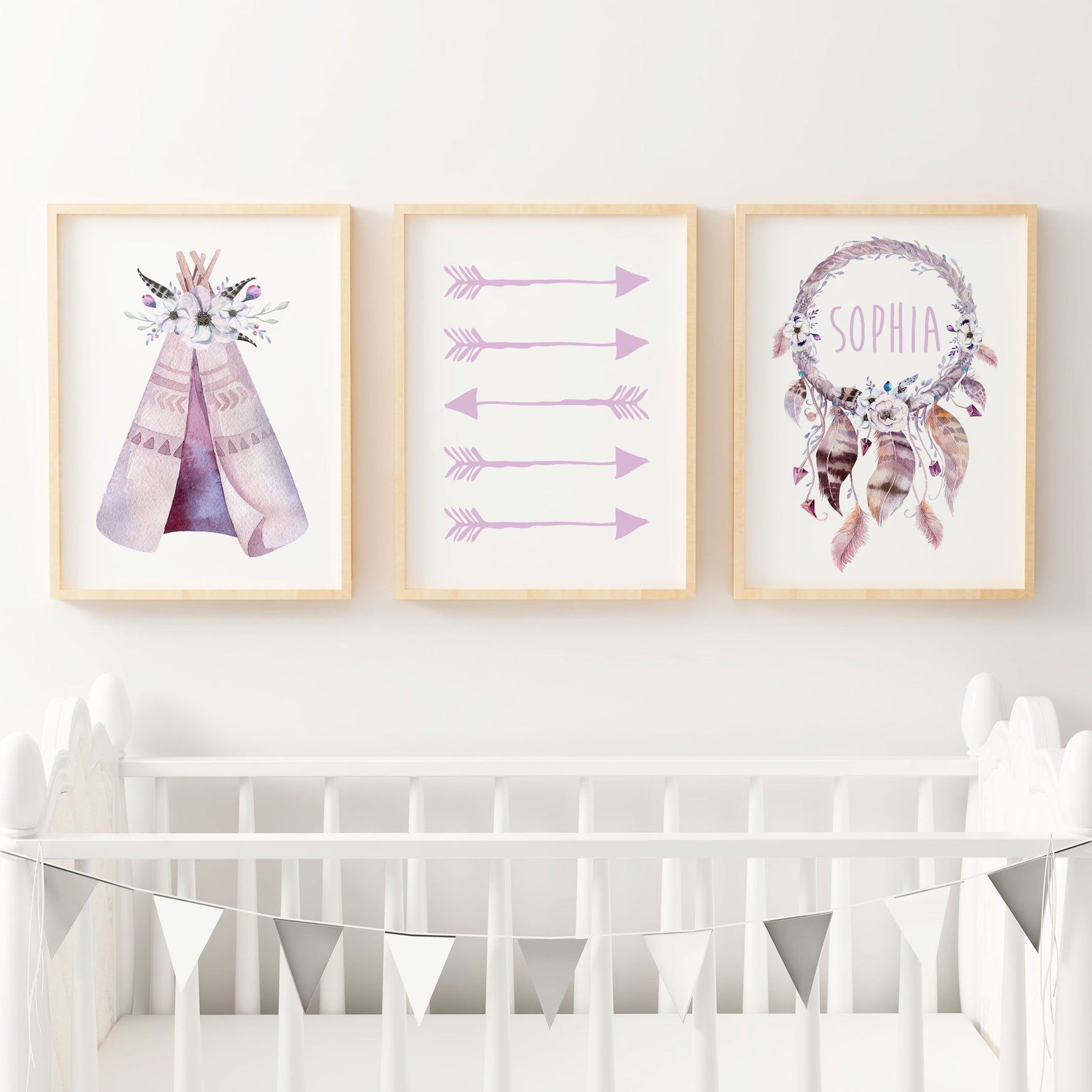 A set of three watercolour, boho woodland inspired nursery prints. Featuring a featuring feather topped teepee, purple tribal arrows and a personalised dreamcatcher name print.