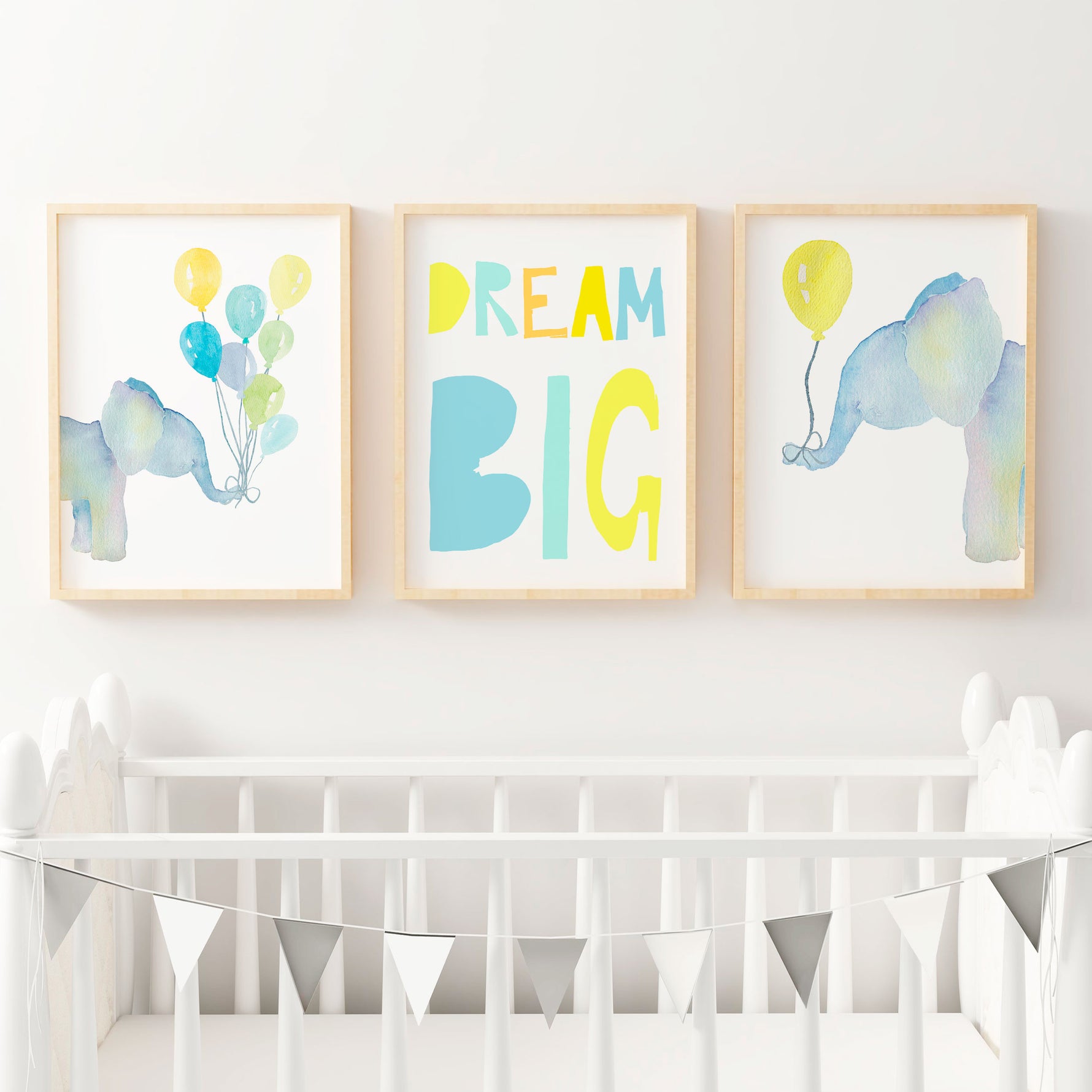 A Soft Watercolour Elephant print Set. Perfect for the modern Nursery or Bedroom décor.This Set of 3 Prints features a Baby Elephant with Balloons, a Mother Elephant and a co-ordinating Dream Big typography print.
