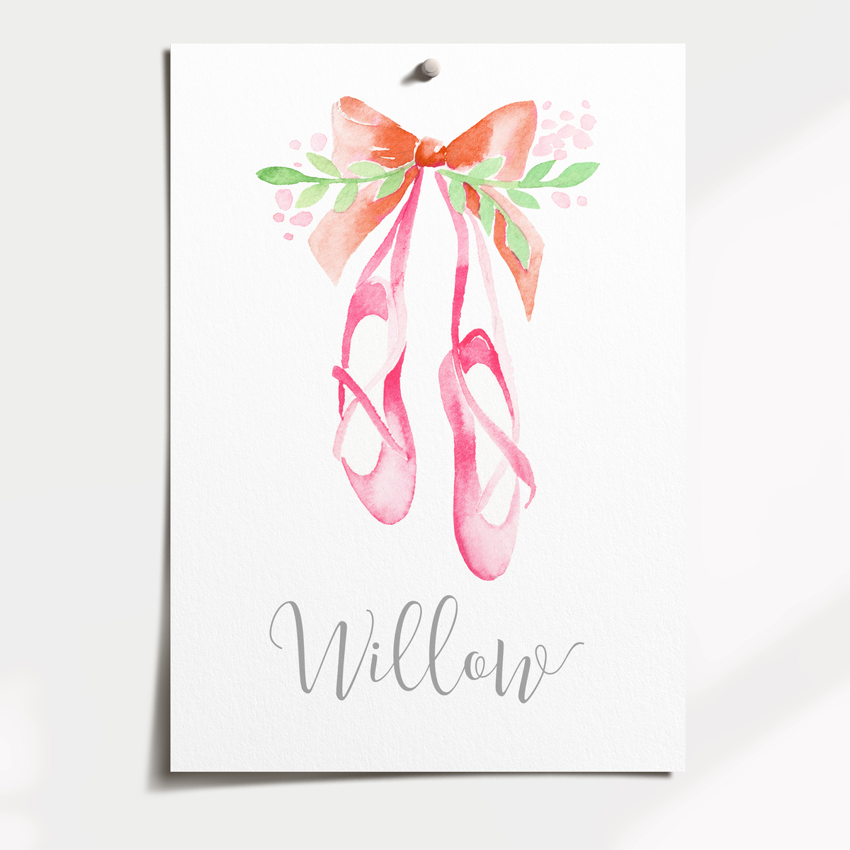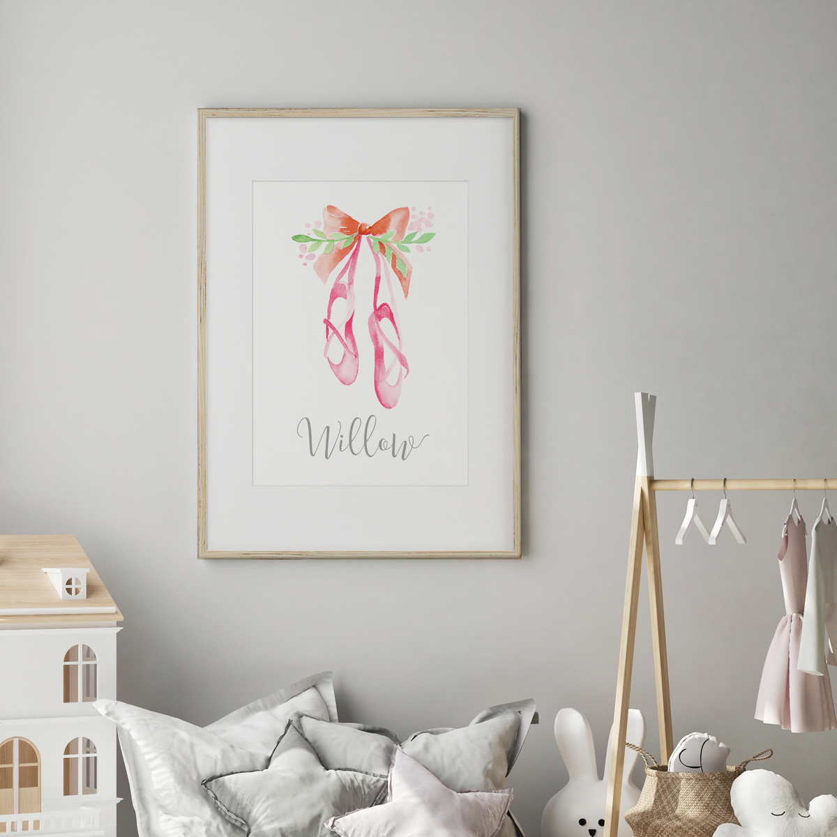Unit price perMake a statement with this personalised ballerina wall art, featuring a pair pretty pink pointe shoes it can be paired with our other co-ordinating ballet prints and is perfect for any little girls ballet or dance themed nursery, bedroom or playroom decor.