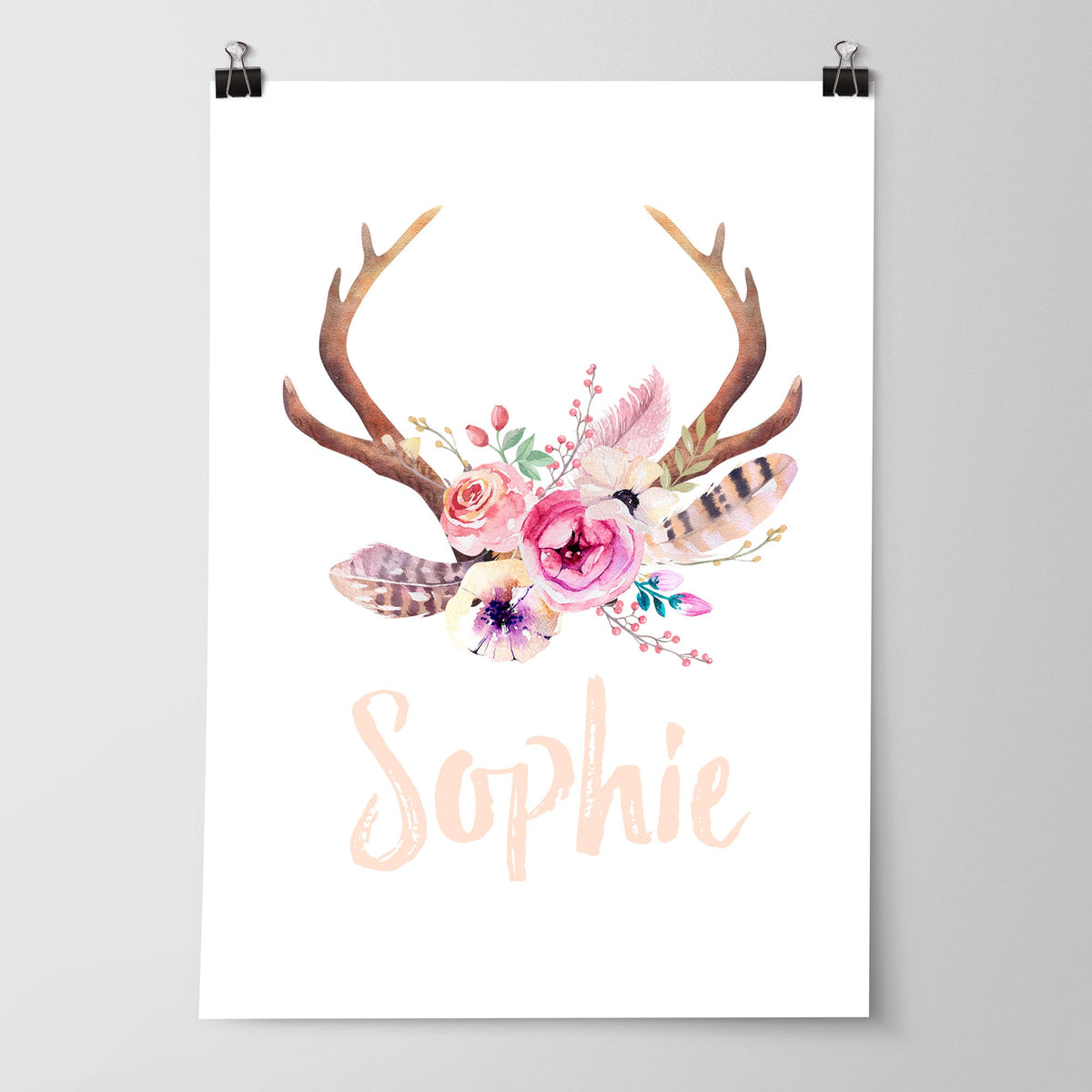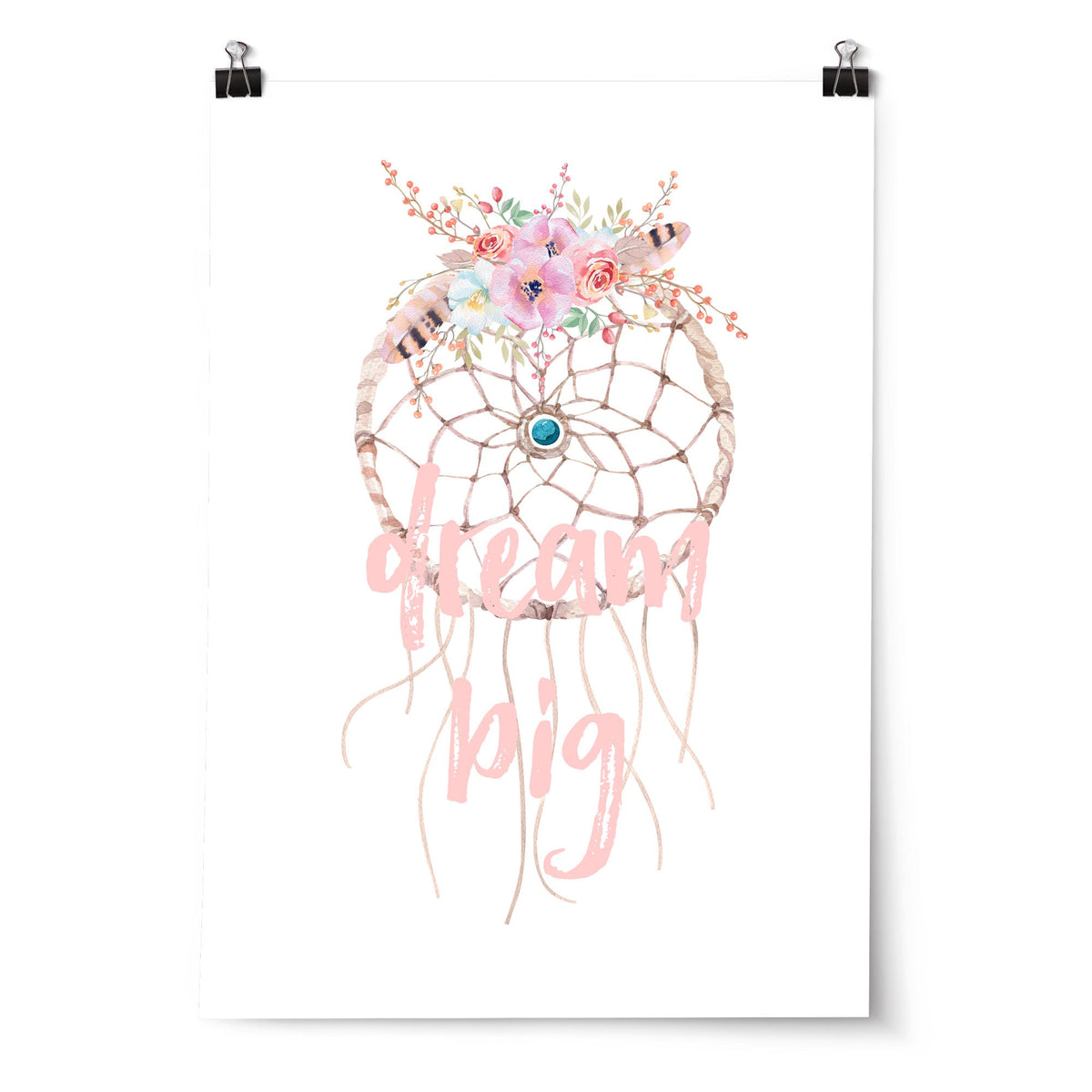 A pink boho nursery wall art print set that includes a floral watercolour 'dream big' dreamcatcher print, 'be you' arrows print and a personalised floral antler name print.